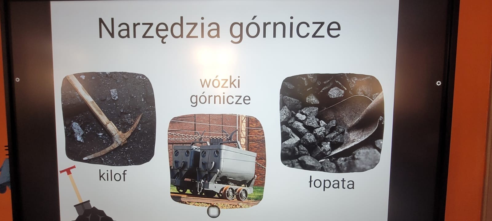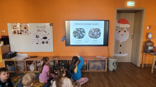 Na początku dzieci obejrzały ilustracje przedstawiające kopalnię i górników podczas pracy. Wspólnie omówiliśmy, jak wygląda strój górnika, zwracając uwagę na elementy takie jak czako z pióropuszem, mundur oraz lampka górnicza. Przedszkolaki wysłuchały krótkiej opowieści o tym, skąd bierze się węgiel i dlaczego jest ważny.