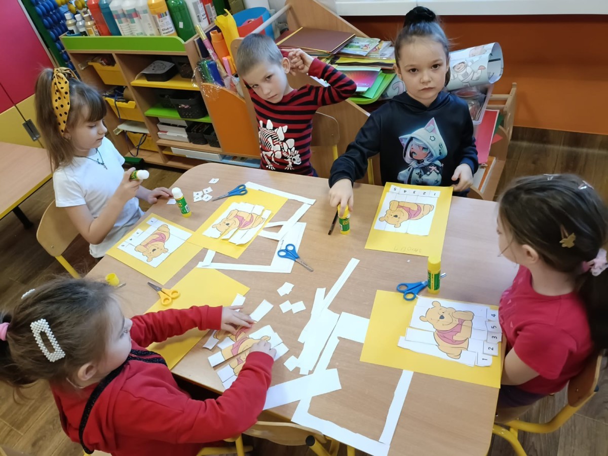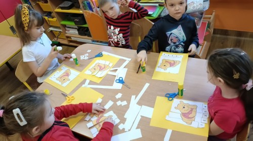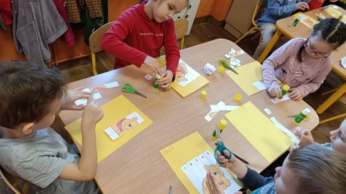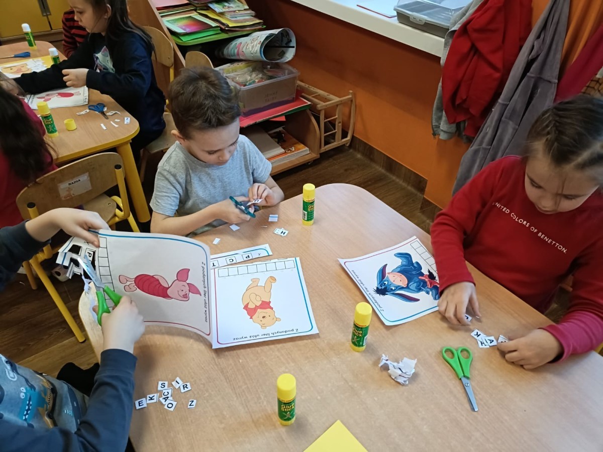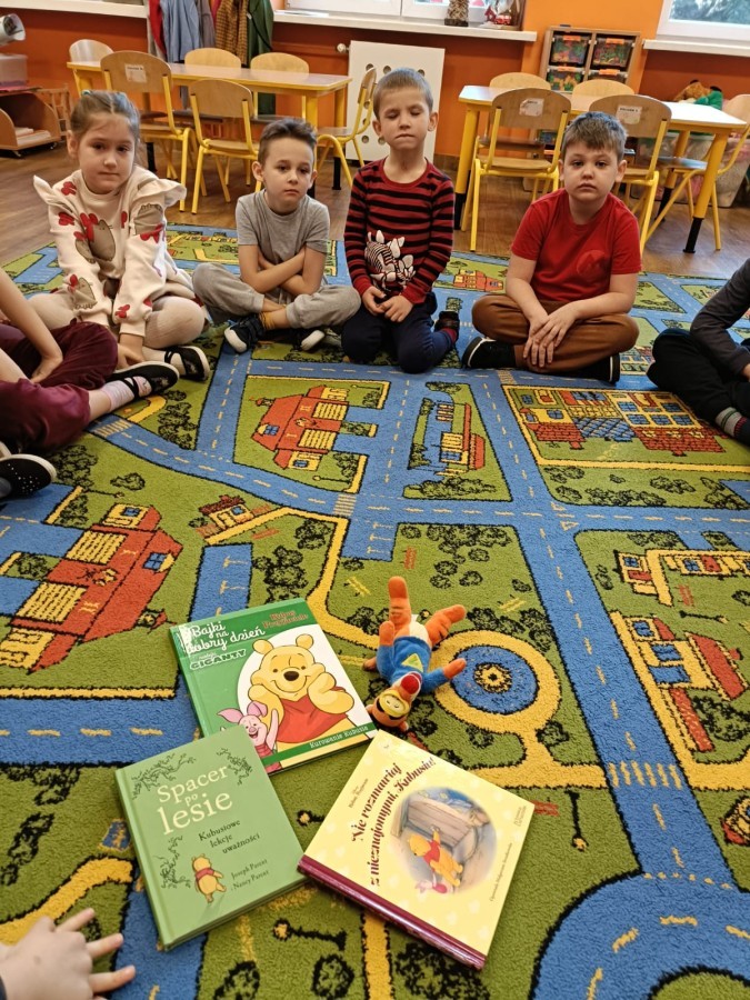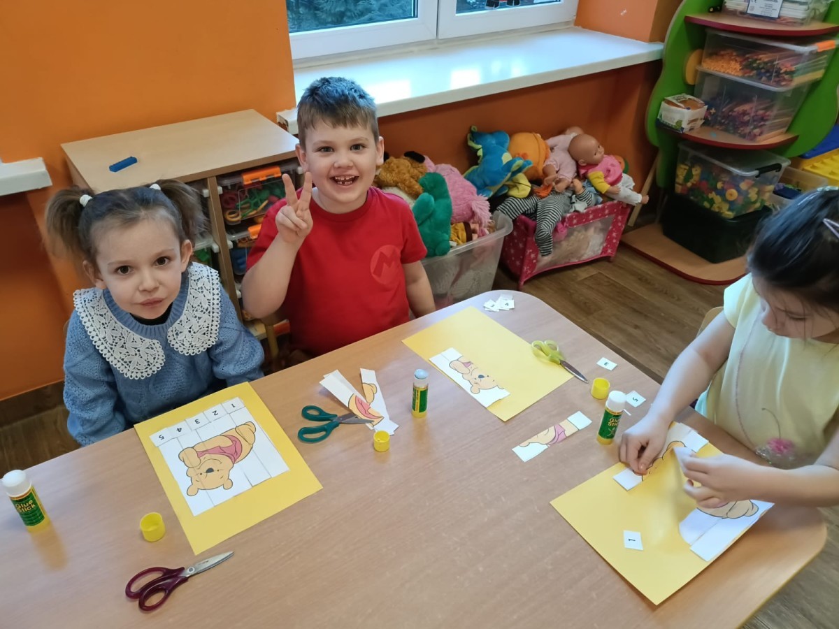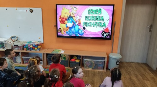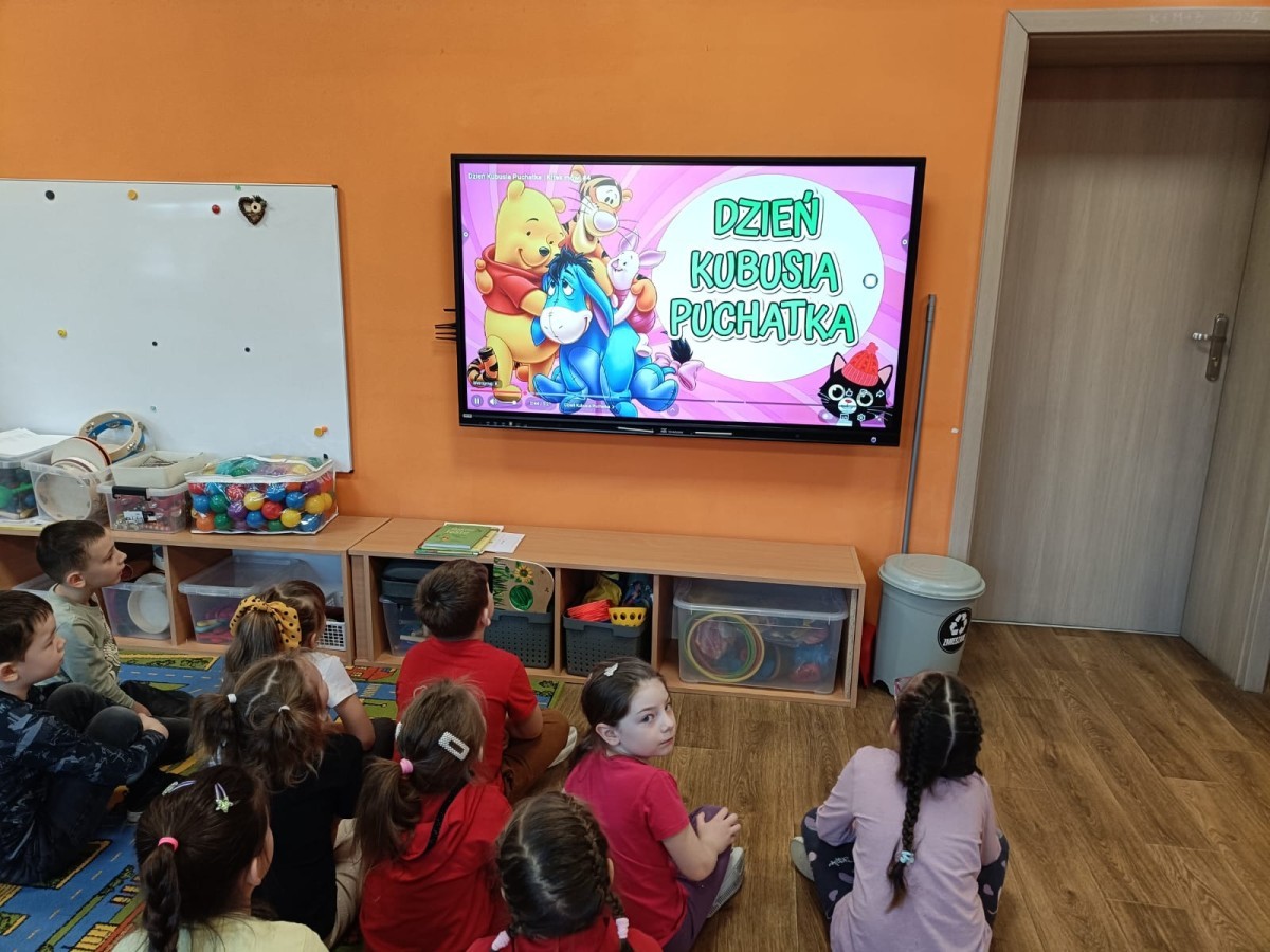 Poniedziałkowe zajęcia z okazji 'Dnia Kubusia Puchatka" przebiegły w radosnej i twórczej atmosferze. Dzieci obejrzały krótki film edukacyjny o historii, przygodach Kubusia Puchatka i jego przyjaciół, który wprowadził je w temat zajęć. Następnie wycinały i układały puzzle oraz rozwiązywały rozsypankę literową, ćwicząc spostrzegawczość i umiejętność rozpoznawania liter oraz czytania. Dużo radości sprawiła także zabawa ruchowa z piłeczkami. Na zakończenie dzieci z dumą zaprezentowały bajki o "Kubusiu Puchatku" przyniesione z domu.