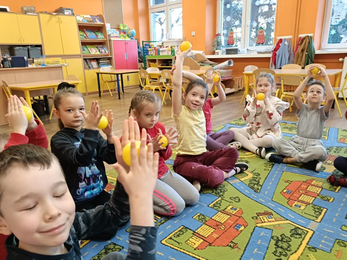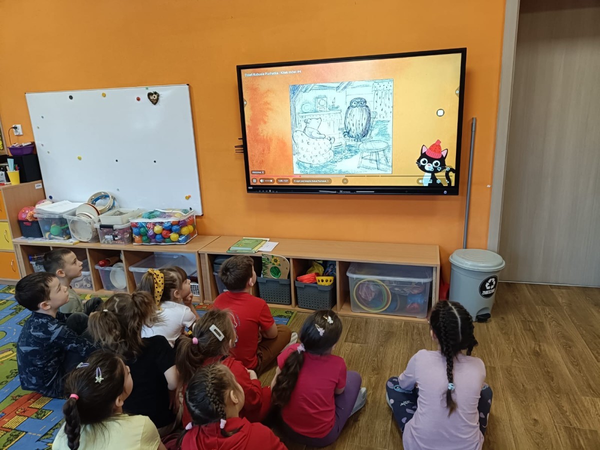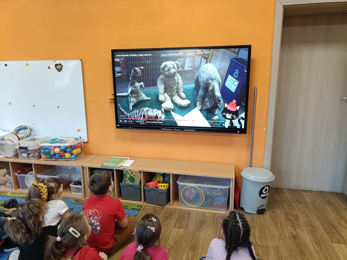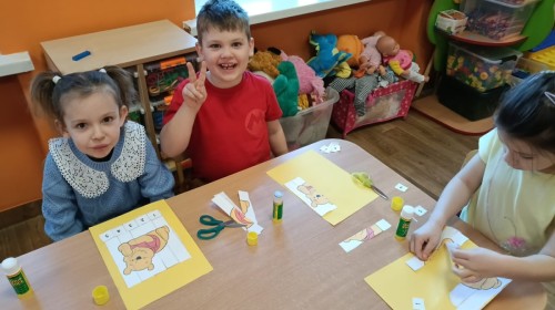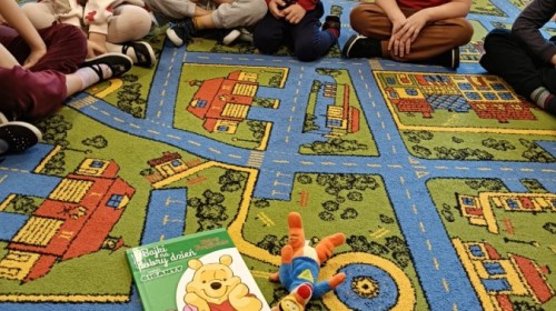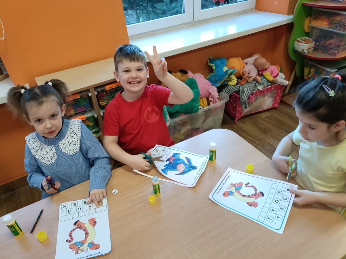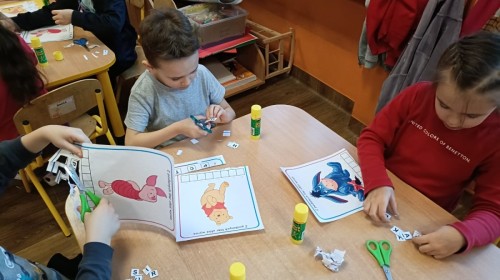Poniedziałkowe zajęcia z okazji 'Dnia Kubusia Puchatka" przebiegły w radosnej i twórczej atmosferze. Dzieci obejrzały krótki film edukacyjny o historii, przygodach Kubusia Puchatka i jego przyjaciół, który wprowadził je w temat zajęć. Następnie wycinały i układały puzzle oraz rozwiązywały rozsypankę literową, ćwicząc spostrzegawczość i umiejętność rozpoznawania liter oraz czytania. Dużo radości sprawiła także zabawa ruchowa z piłeczkami. Na zakończenie dzieci z dumą zaprezentowały bajki o "Kubusiu Puchatku" przyniesione z domu.