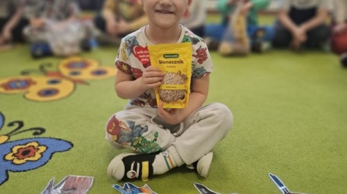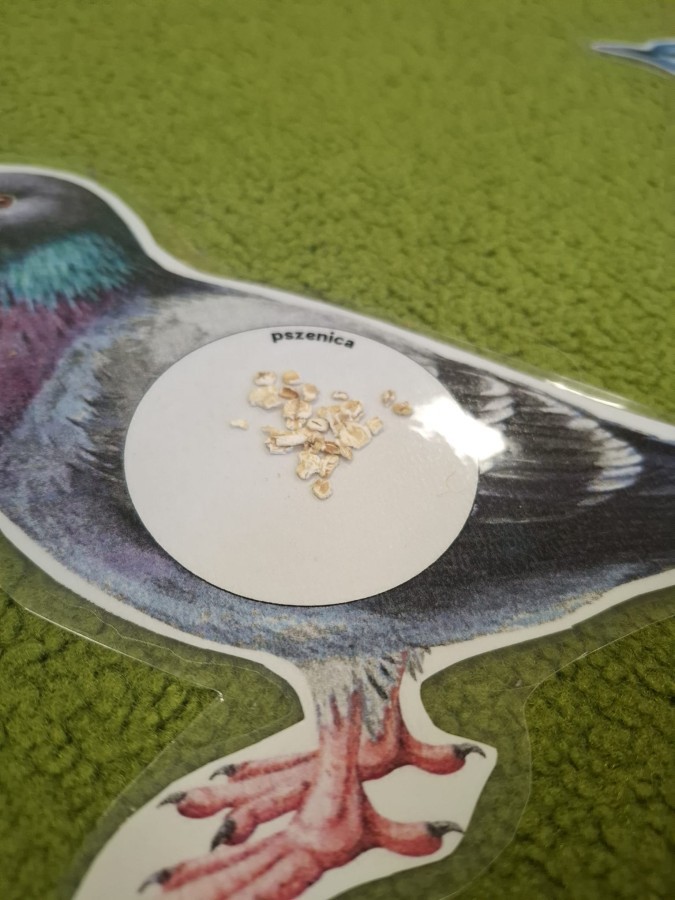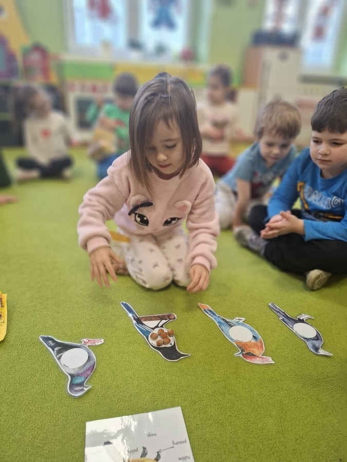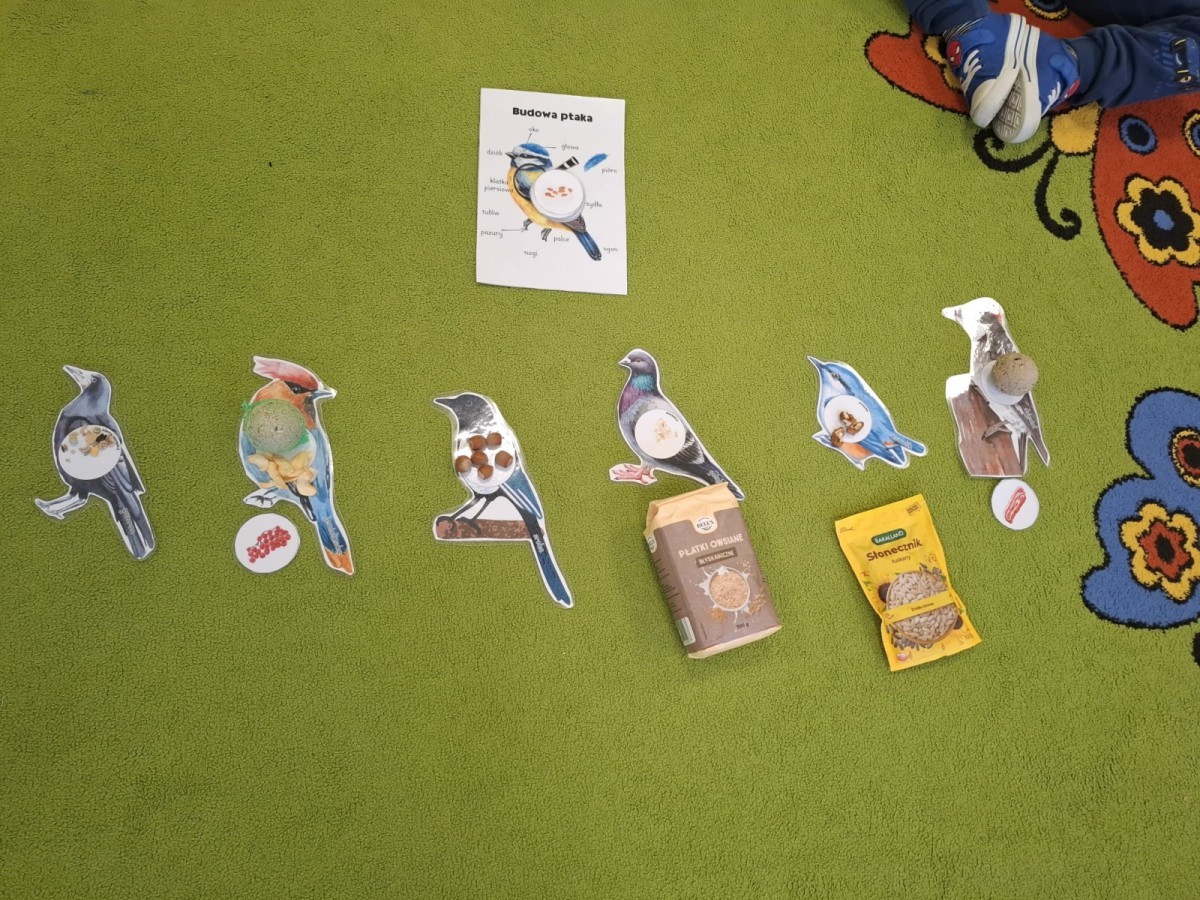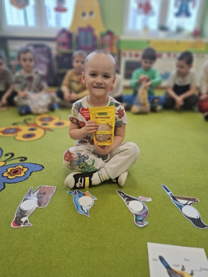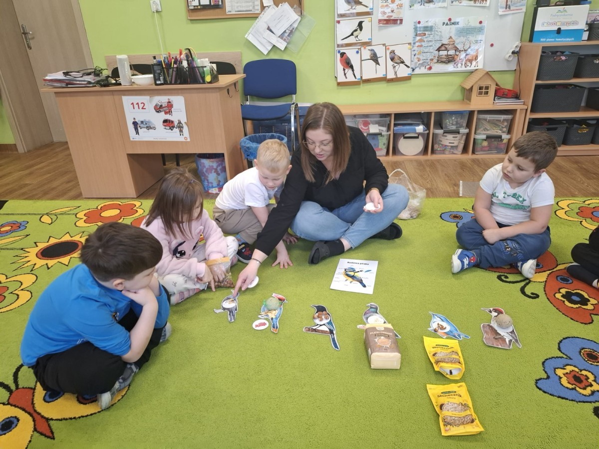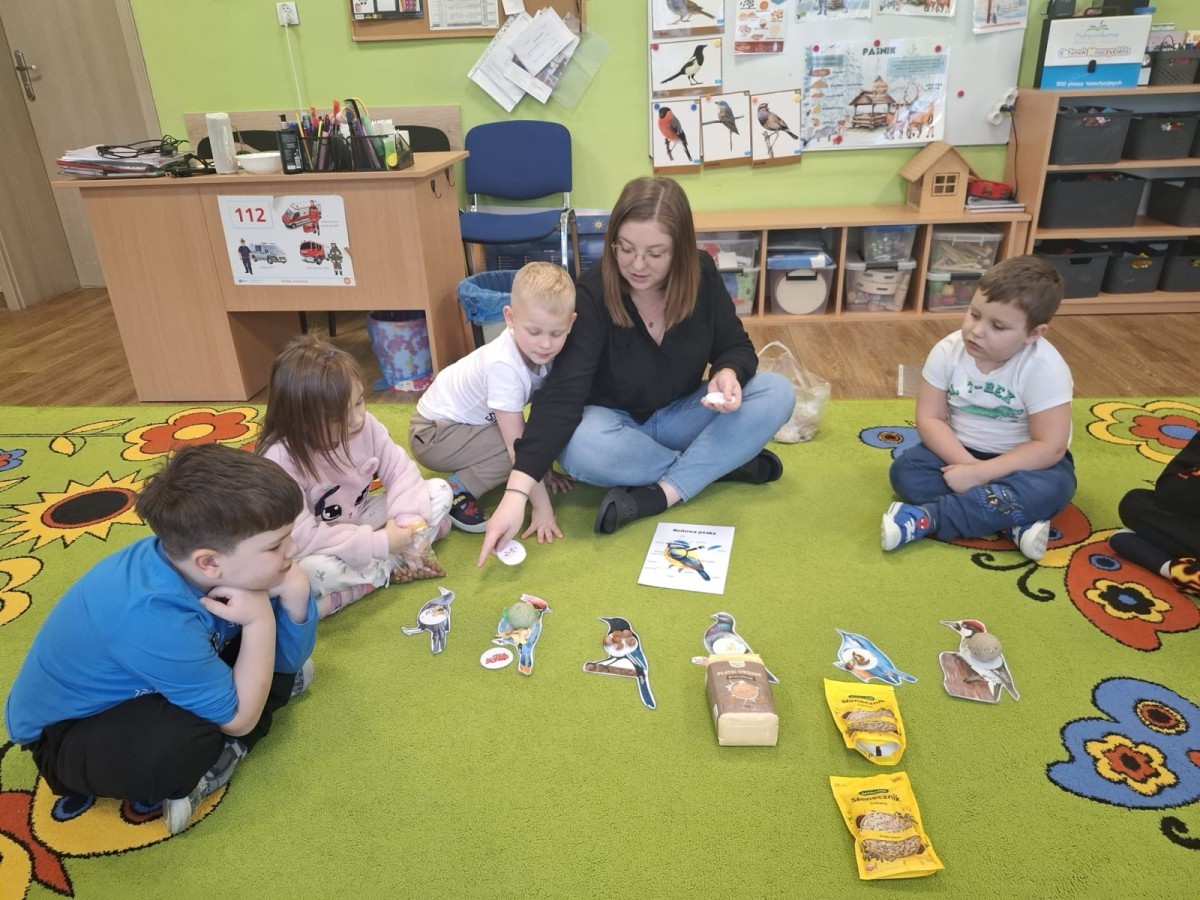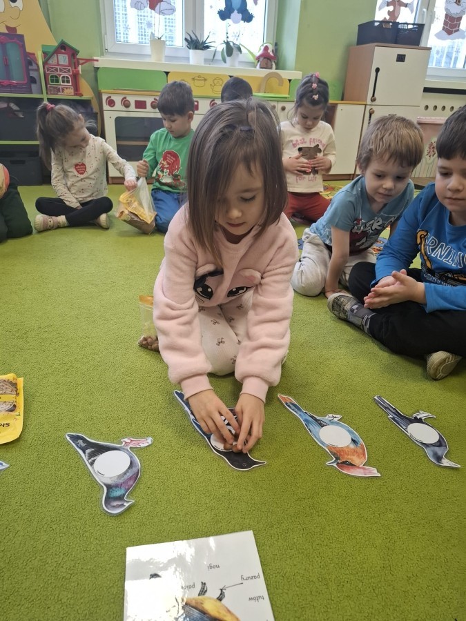 Dzieci przyniosły pokarm dla ptaszków, między innymi nasiona zbóż, słonecznika, gotowe mieszanki kule, płatki owsiane, orzechy, suszone owoce. Przedszkolaki dowiedziały się, co dany ptak lubi jeść najbardziej. Następnie kilkoro dzieci nasypało pokarm do karmnika. Dzieci będą obserwować karmnik i dosypywać jedzenie.