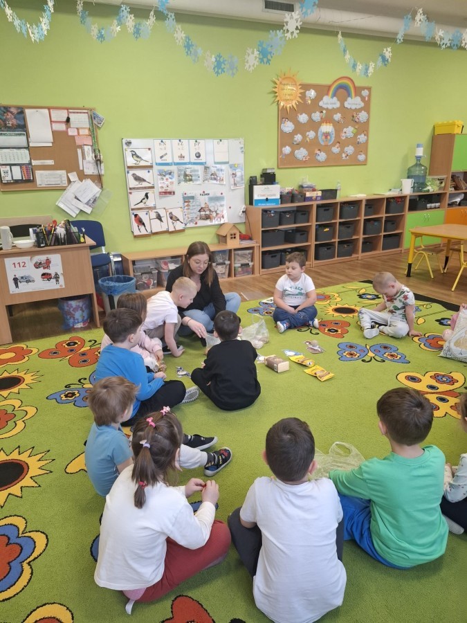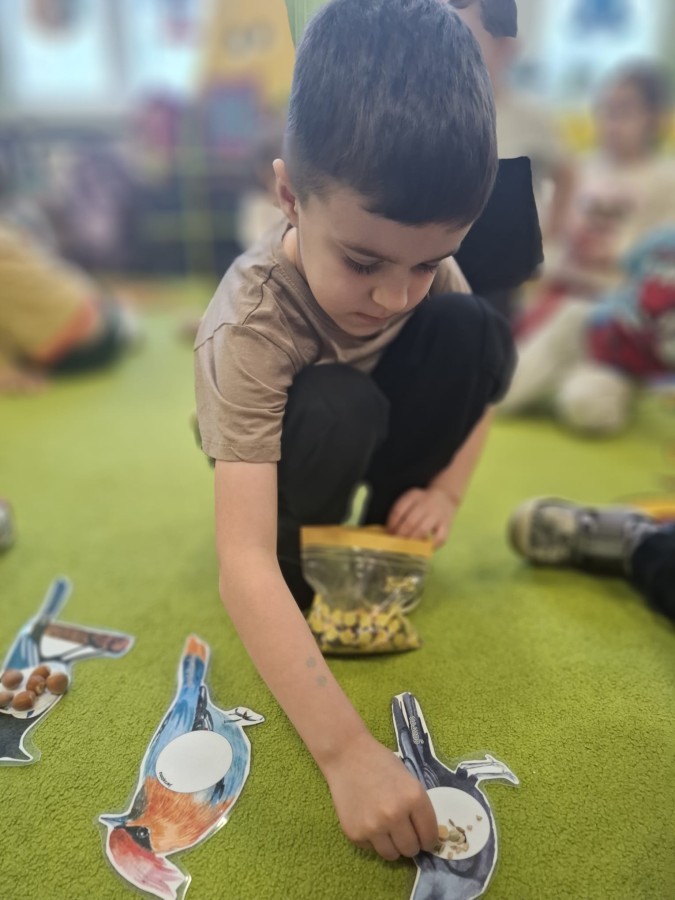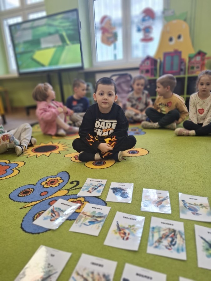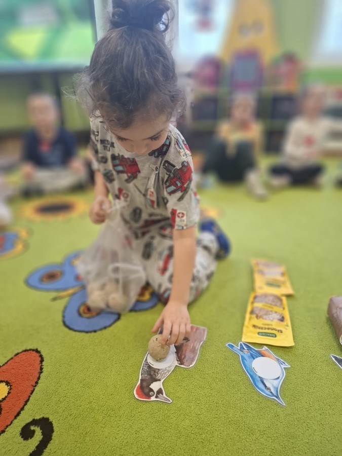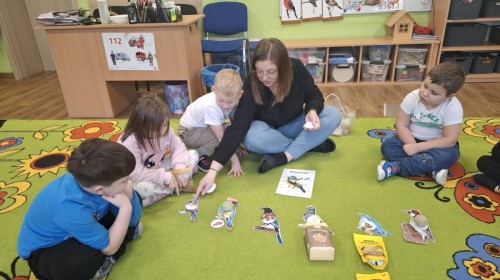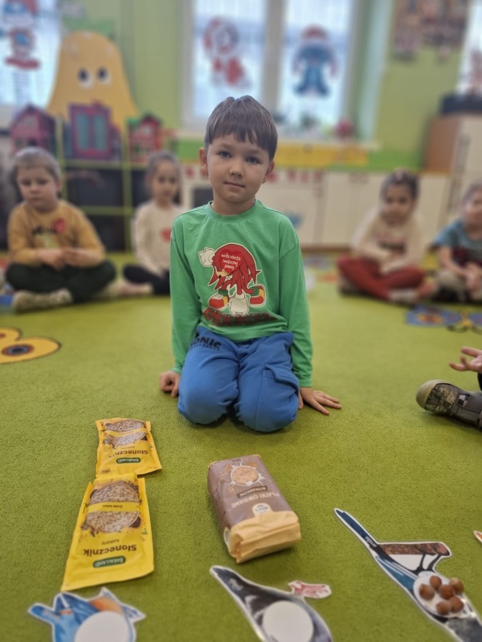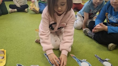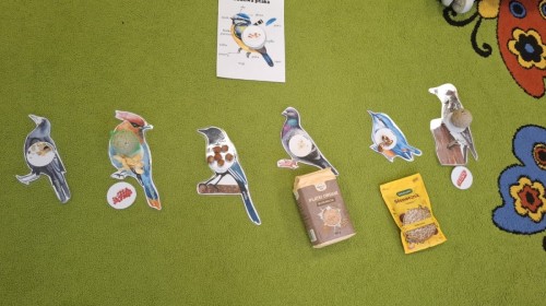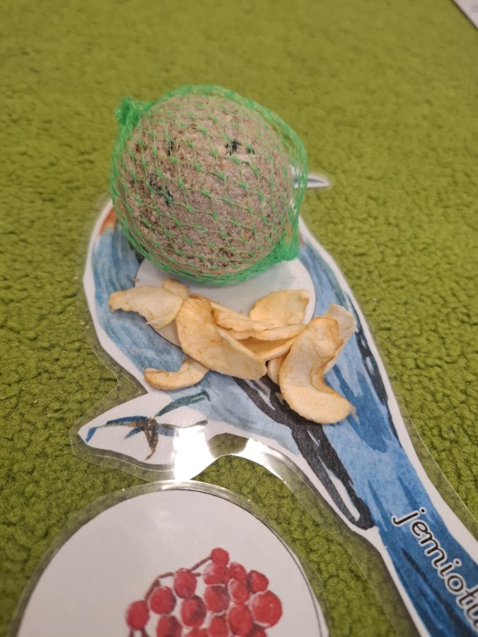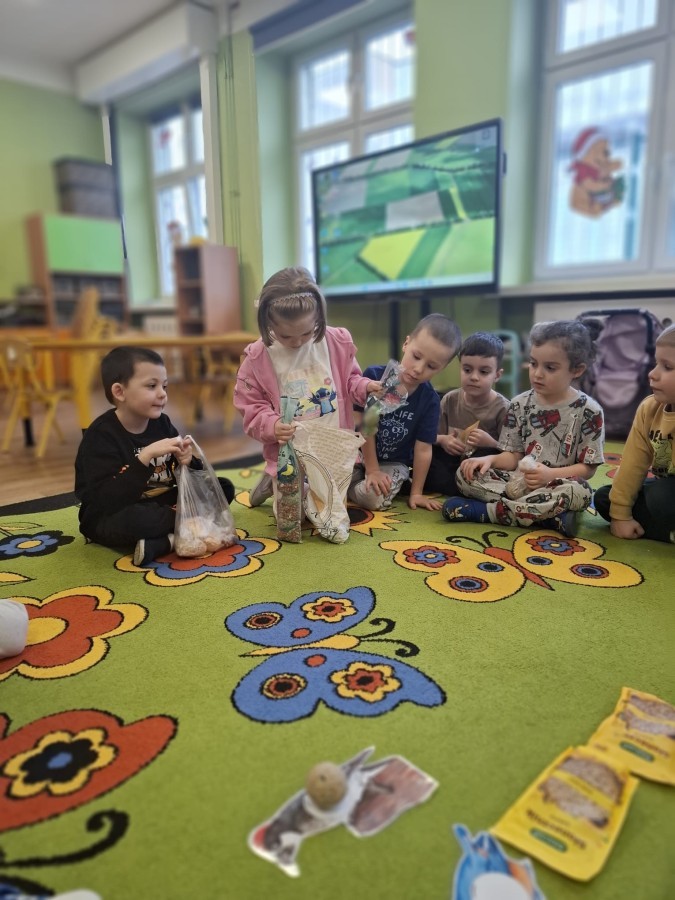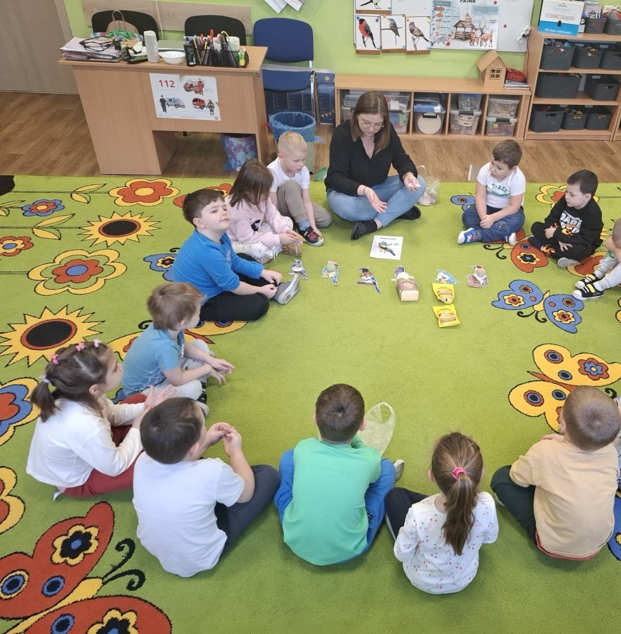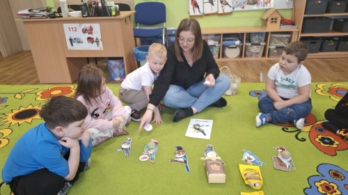 Dzieci przyniosły pokarm dla ptaszków, między innymi nasiona zbóż, słonecznika, gotowe mieszanki kule, płatki owsiane, orzechy, suszone owoce. Przedszkolaki dowiedziały się, co dany ptak lubi jeść najbardziej. Następnie kilkoro dzieci nasypało pokarm do karmnika. Dzieci będą obserwować karmnik i dosypywać jedzenie.