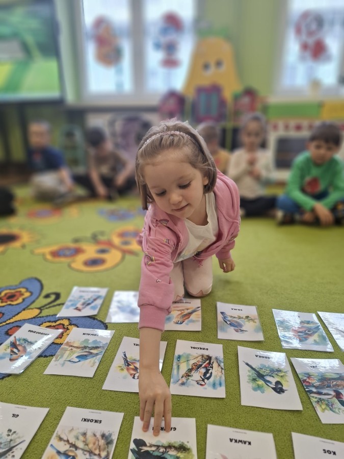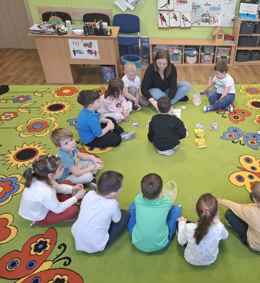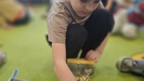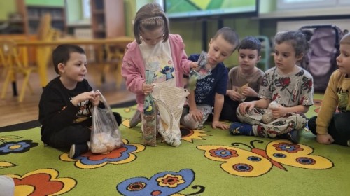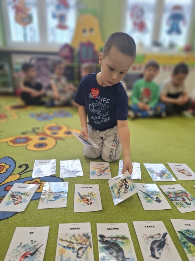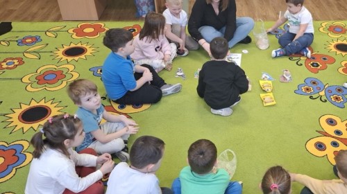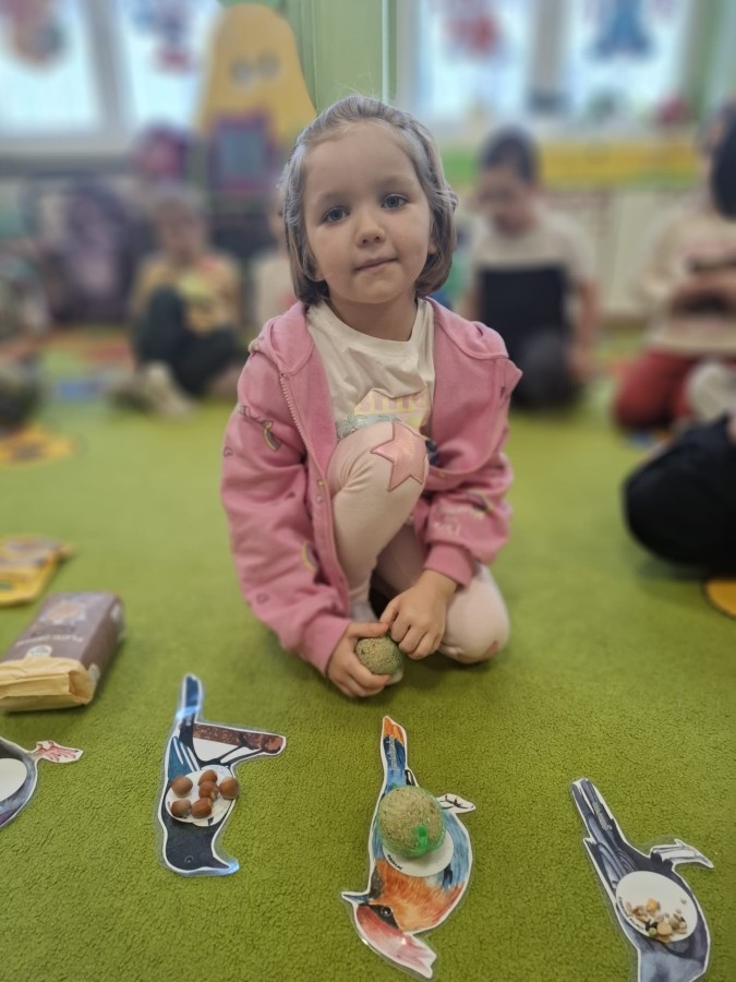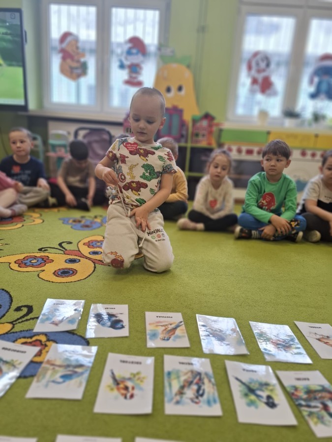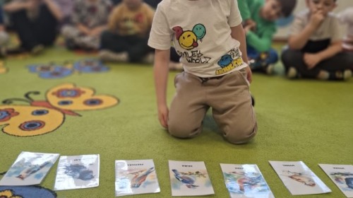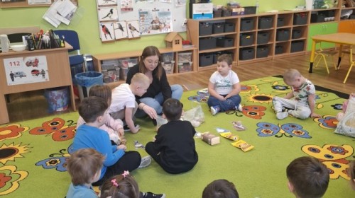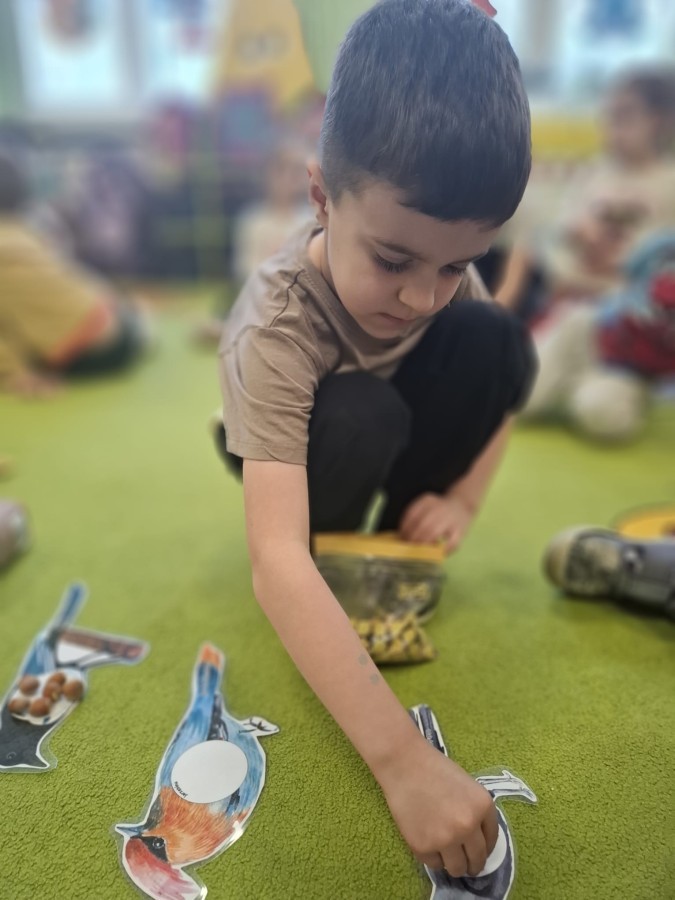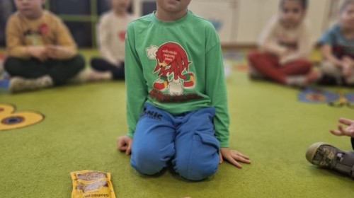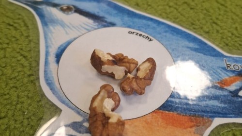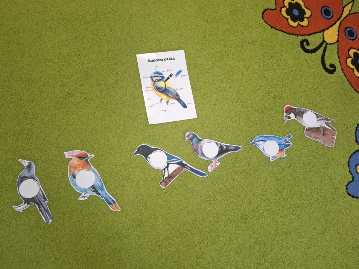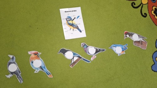 Dzieci przyniosły pokarm dla ptaszków, między innymi nasiona zbóż, słonecznika, gotowe mieszanki kule, płatki owsiane, orzechy, suszone owoce. Przedszkolaki dowiedziały się, co dany ptak lubi jeść najbardziej. Następnie kilkoro dzieci nasypało pokarm do karmnika. Dzieci będą obserwować karmnik i dosypywać jedzenie.