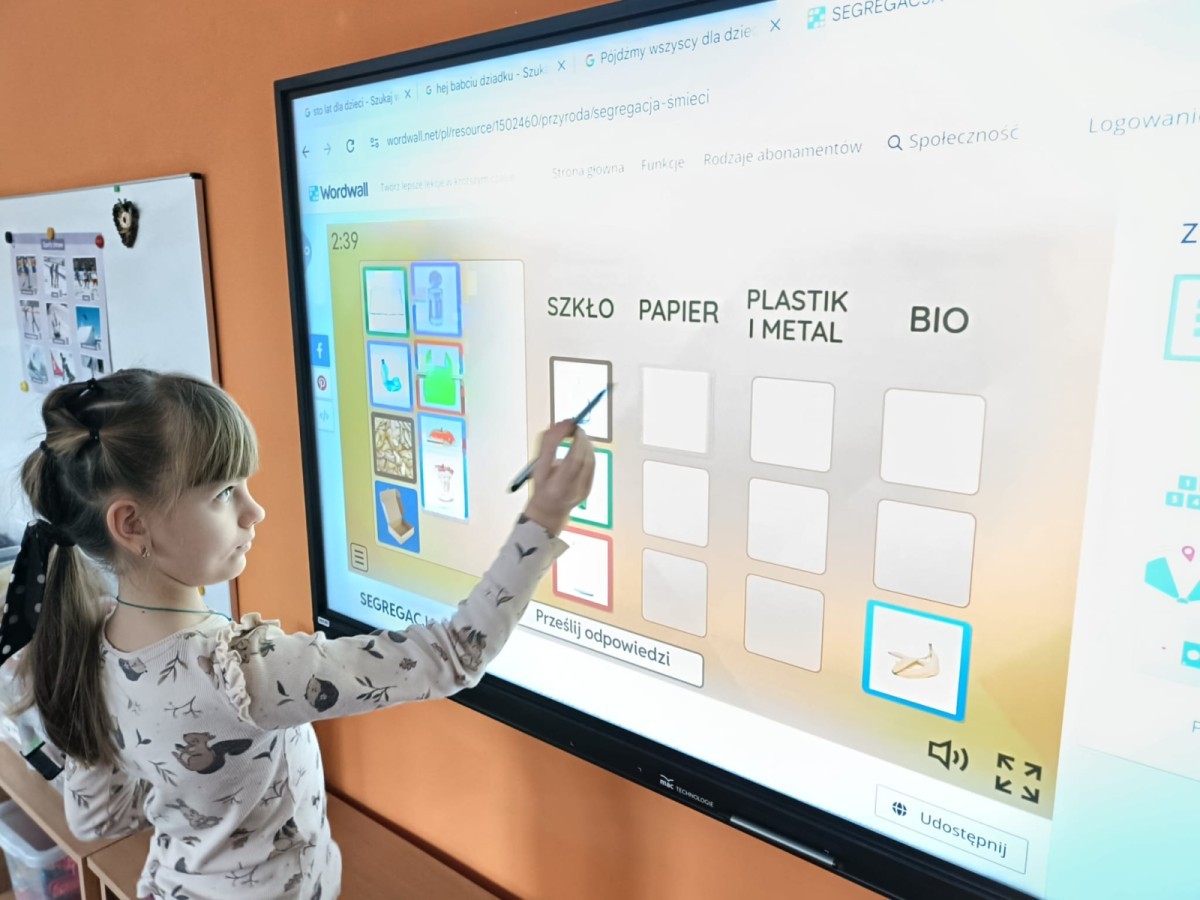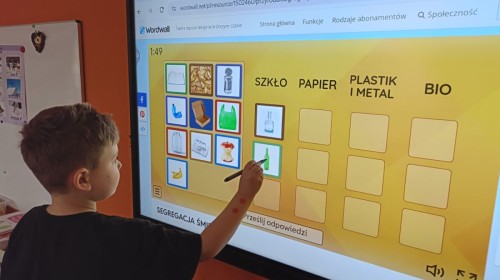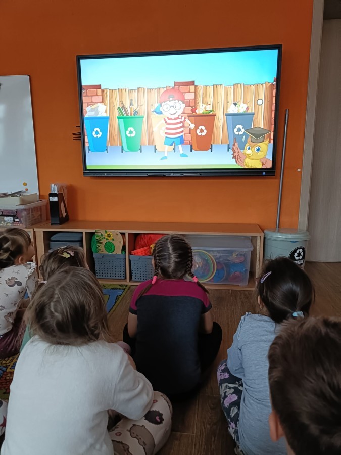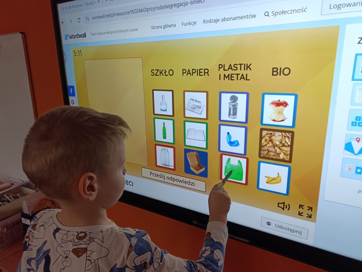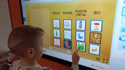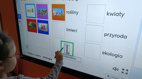 Podczas dzisiejszych popołudniowych zajęć dzieci korzystając z ekranu multimedialnego rozwiązywały różnego typu zadania związane z ekologią. Była to okazja nie tylko do poszerzenia wiedzy na temat przyrody ale i sytuacje sprzyjające wyjaśnieniu niezrozumiałych pojęć. Wszystkie dzieci z ciekawością i zaangażowaniem podejmowały się kolejnych zadań.
