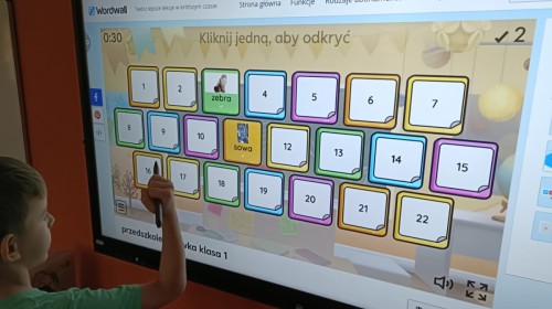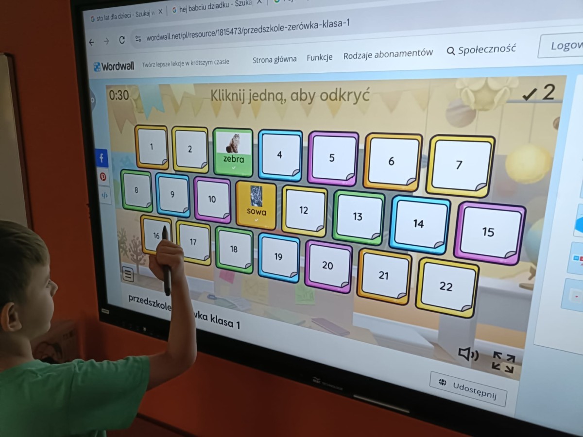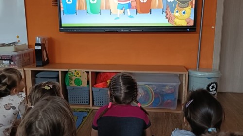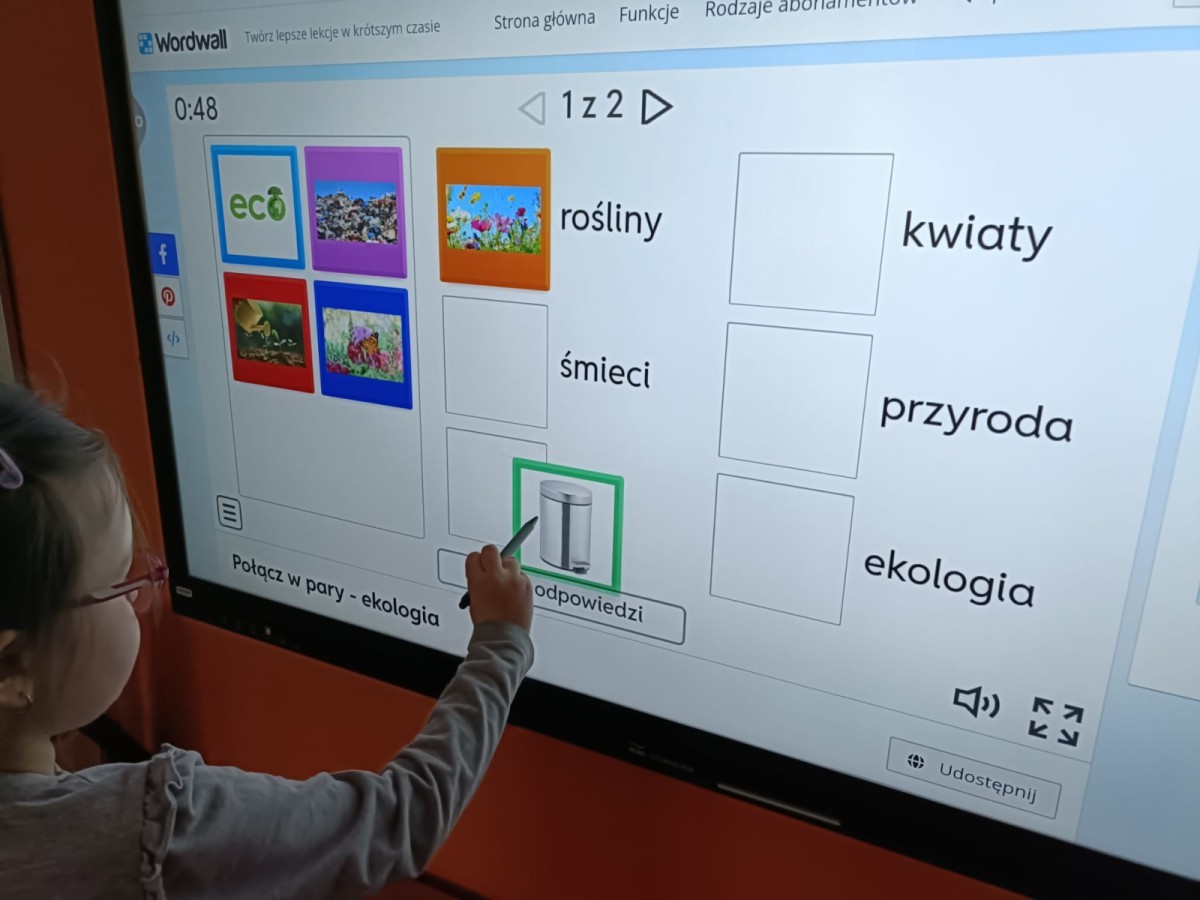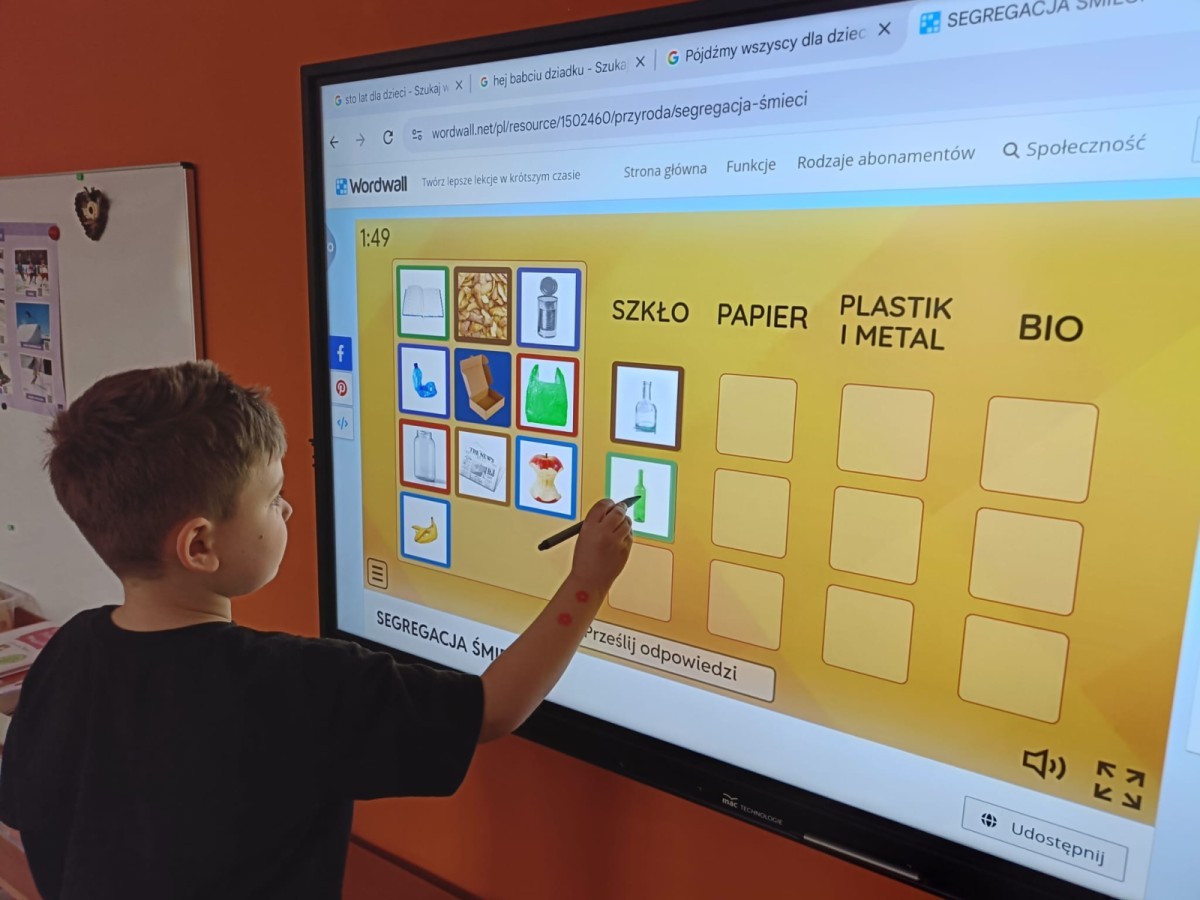 Podczas dzisiejszych popołudniowych zajęć dzieci korzystając z ekranu multimedialnego rozwiązywały różnego typu zadania związane z ekologią. Była to okazja nie tylko do poszerzenia wiedzy na temat przyrody ale i sytuacje sprzyjające wyjaśnieniu niezrozumiałych pojęć. Wszystkie dzieci z ciekawością i zaangażowaniem podejmowały się kolejnych zadań.