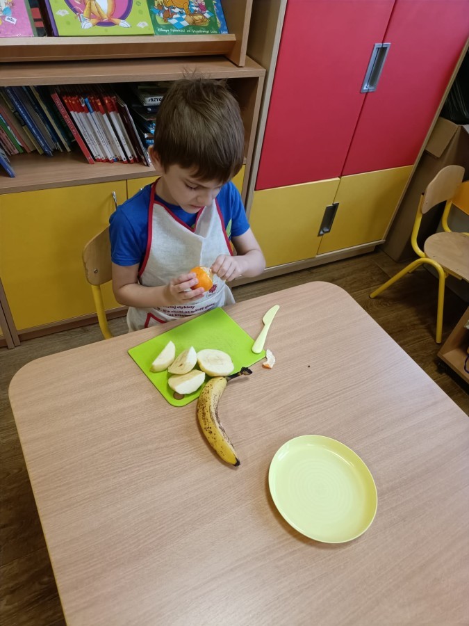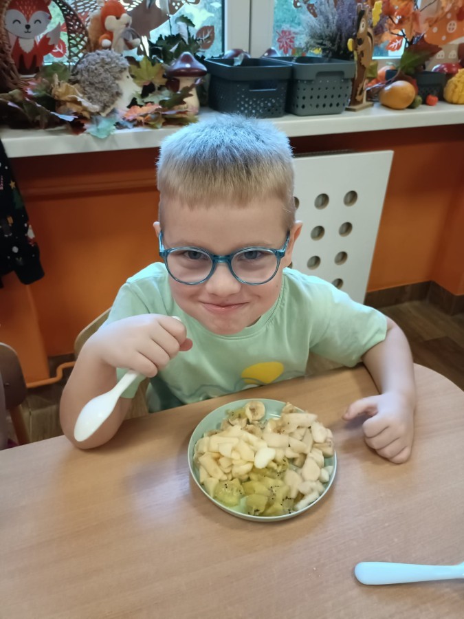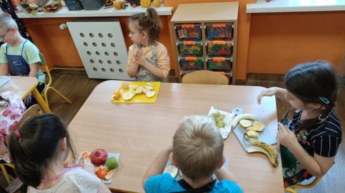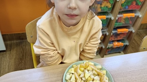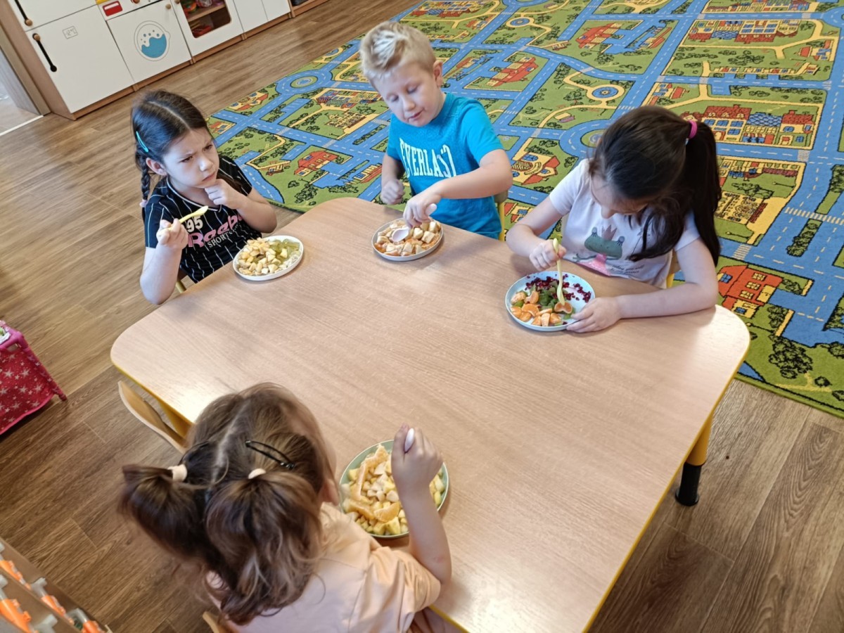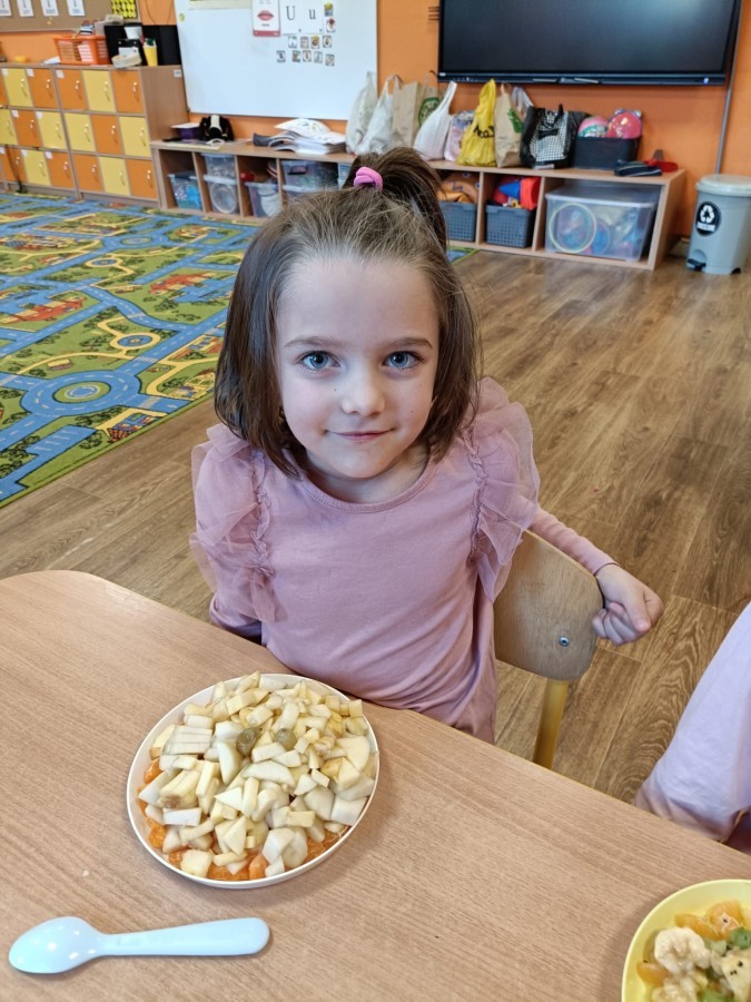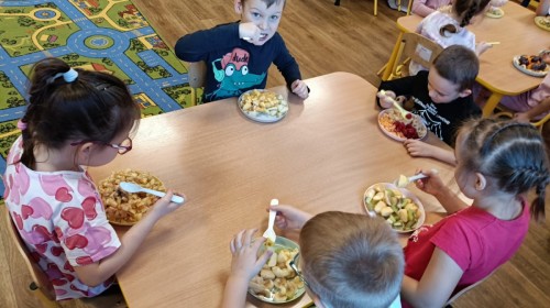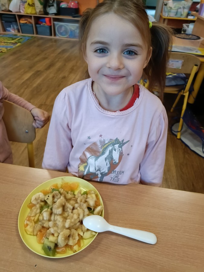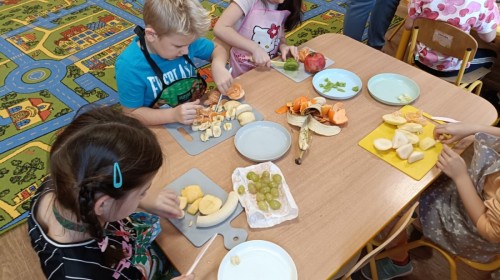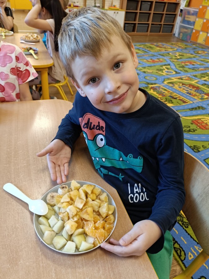 Dzisiaj dzieci samodzielnie przygotowały sałatkę owocową ze swoich ulubionych owoców. Powstały pyszne, różnorodne, kolorowe i pełne witamin sałatki, które dzieci zjadały z wielką przyjemnością. Największą radość dla przedszkolaków niewątpliwie stanowiło samodzielne przygotowanie stanowiska pracy i własnoręczne krojenie owoców i oczywiście sama degustacja.