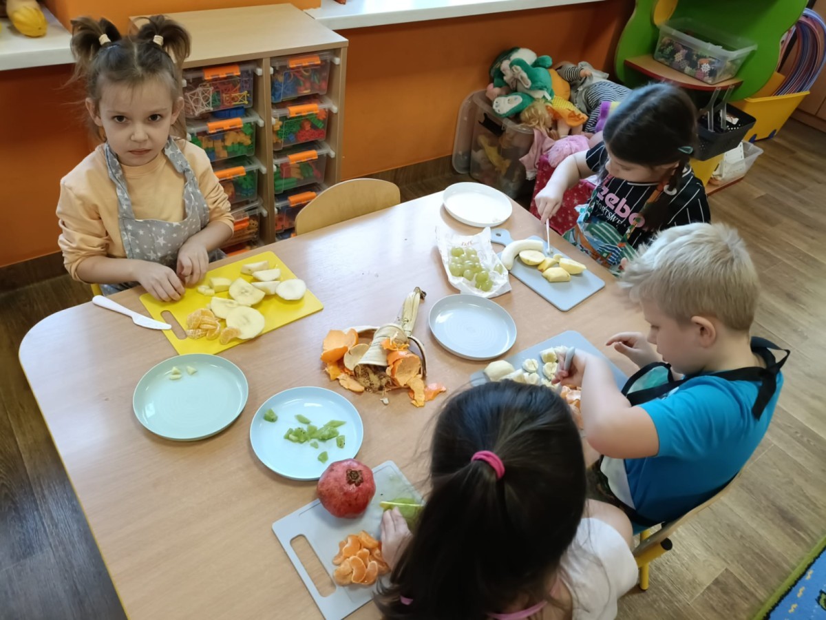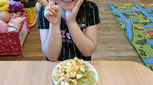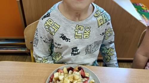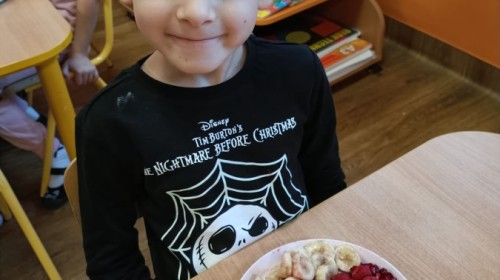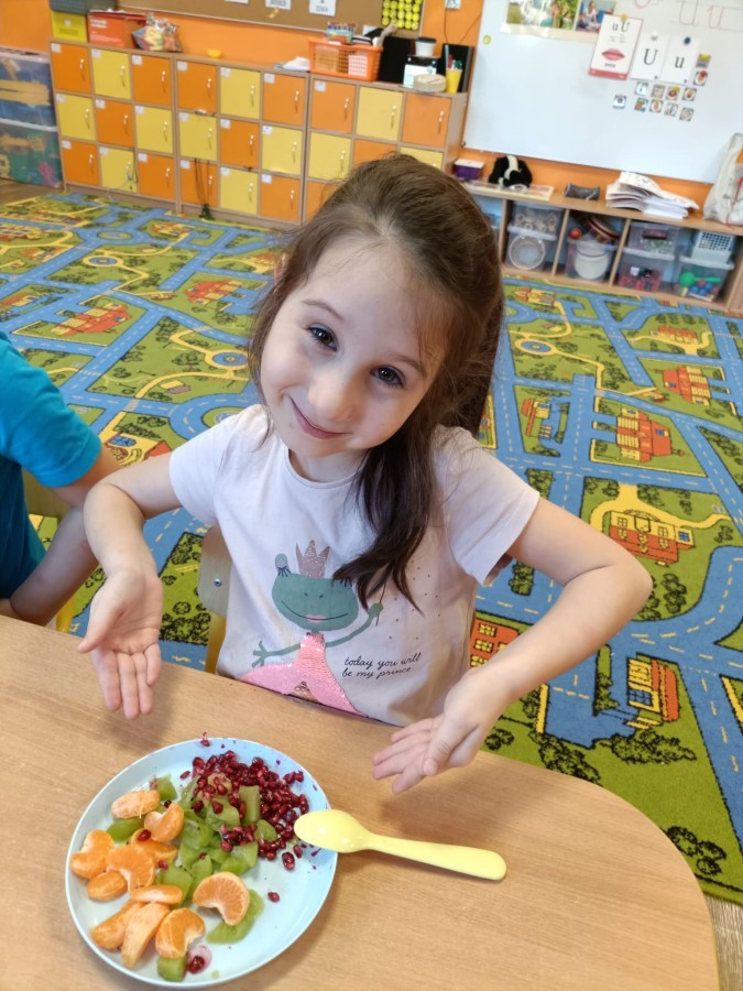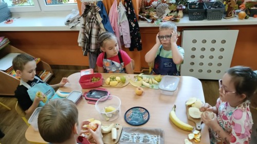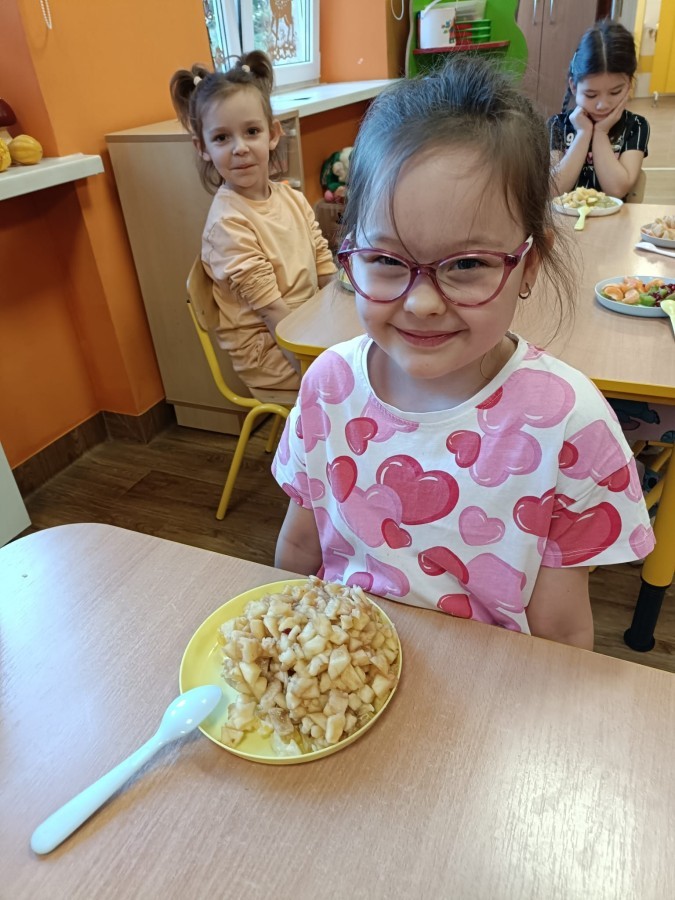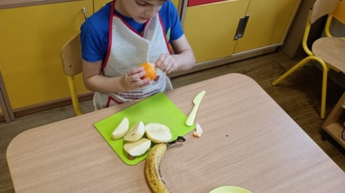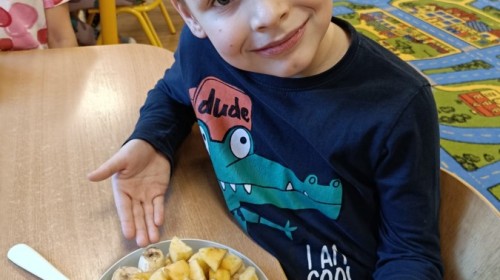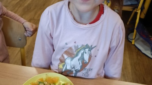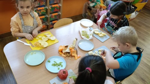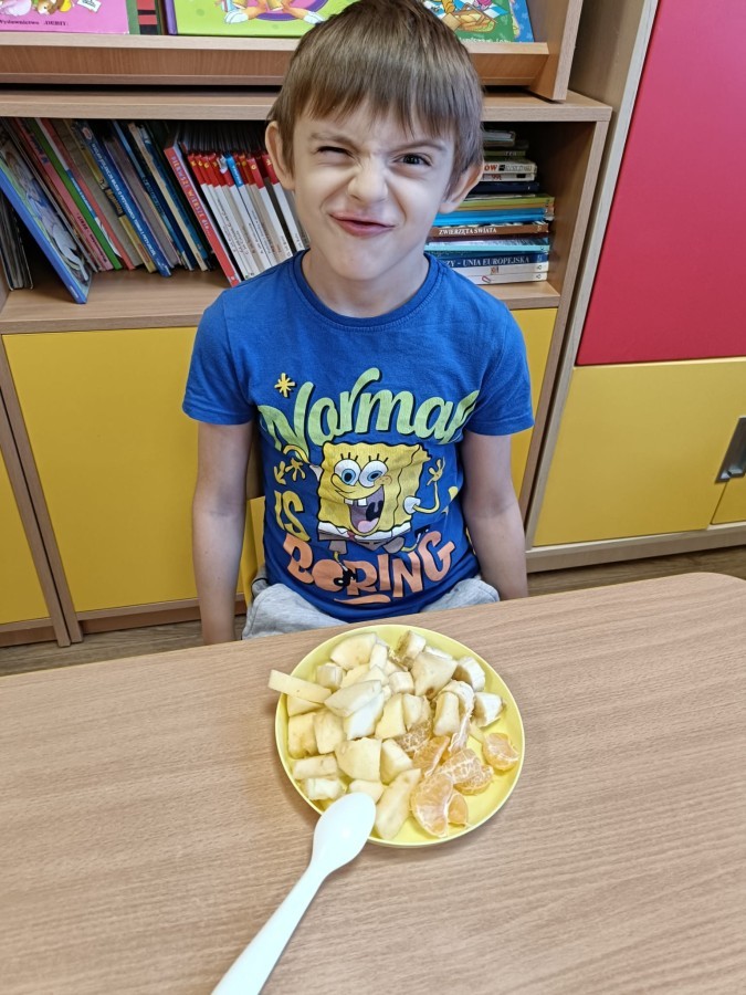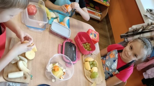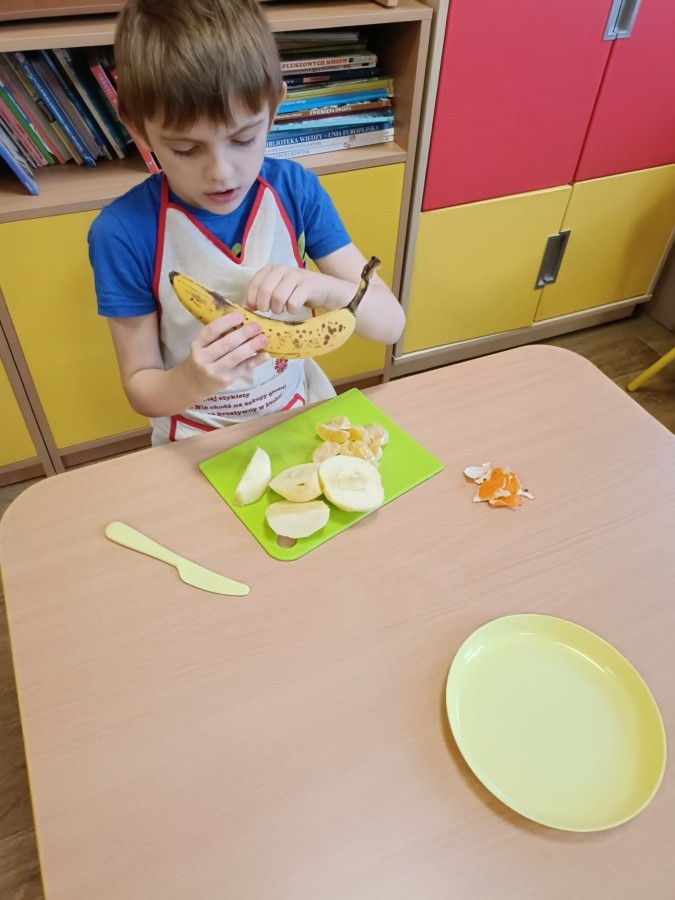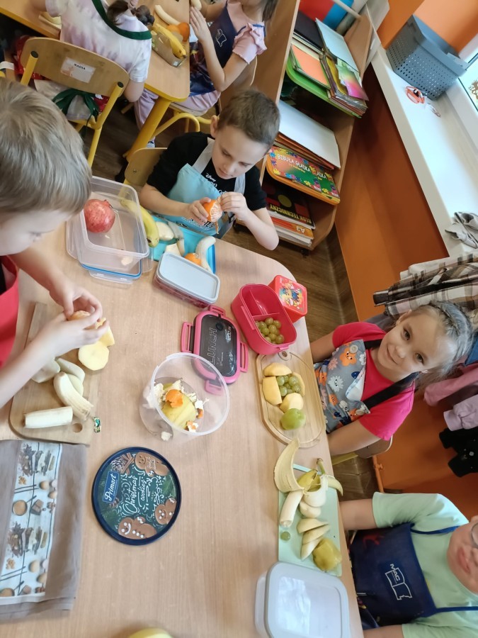 Dzisiaj dzieci samodzielnie przygotowały sałatkę owocową ze swoich ulubionych owoców. Powstały pyszne, różnorodne, kolorowe i pełne witamin sałatki, które dzieci zjadały z wielką przyjemnością. Największą radość dla przedszkolaków niewątpliwie stanowiło samodzielne przygotowanie stanowiska pracy i własnoręczne krojenie owoców i oczywiście sama degustacja.