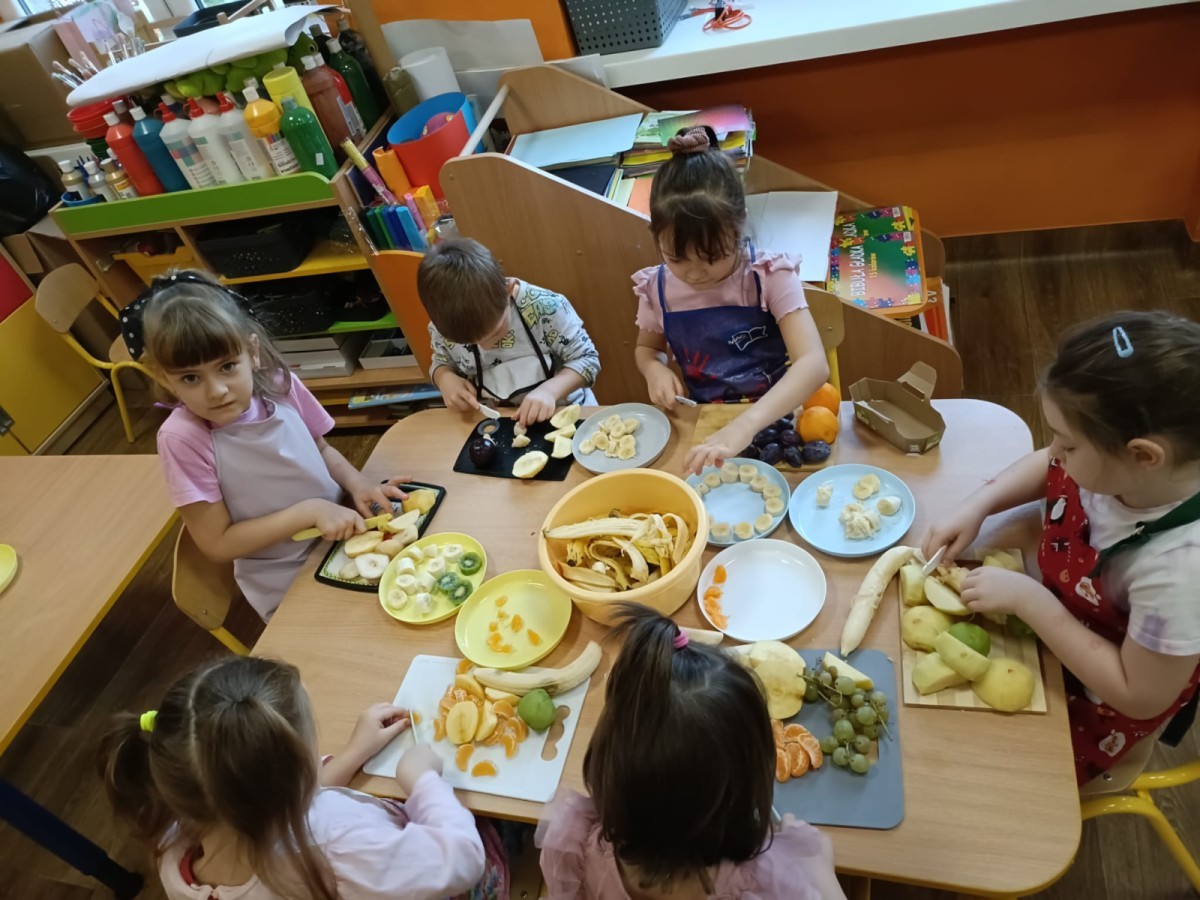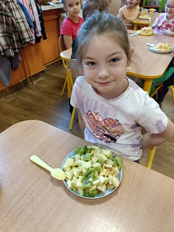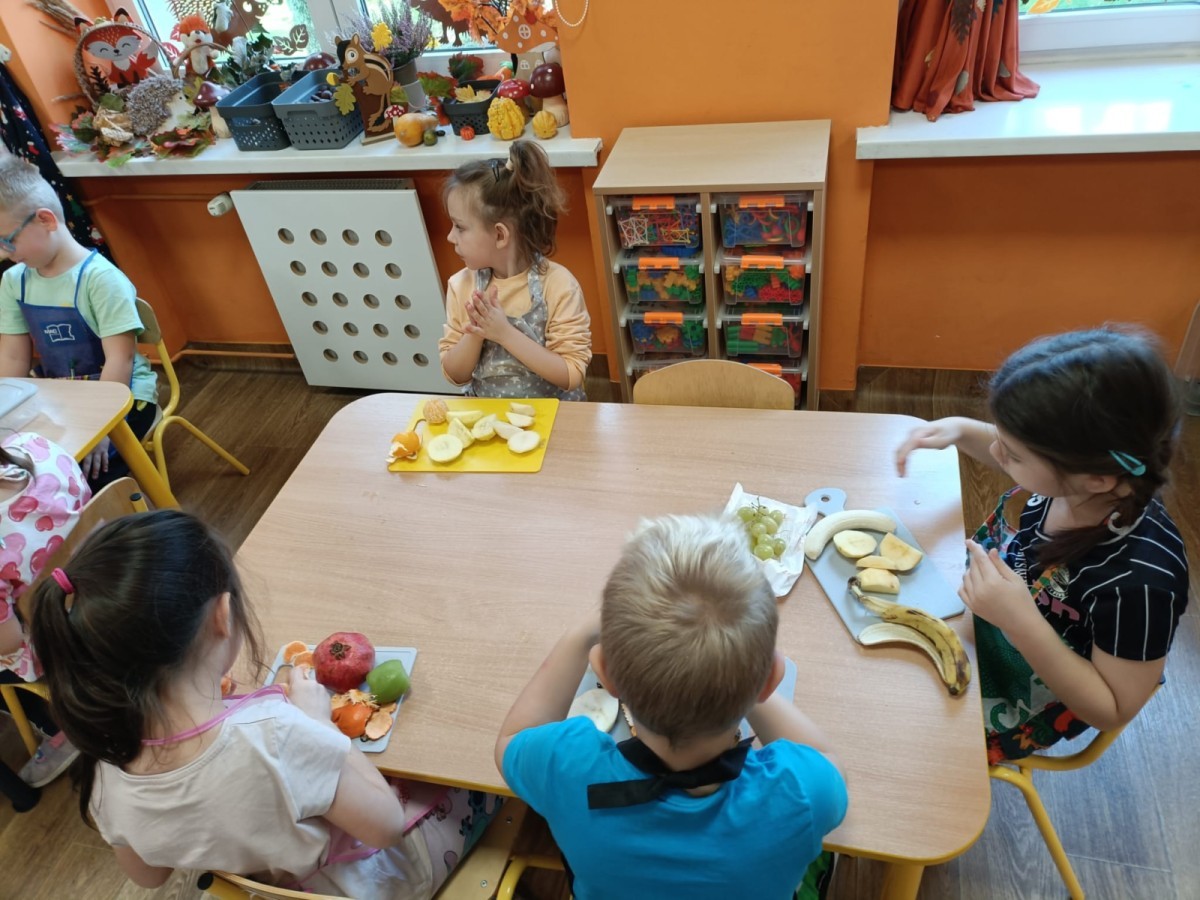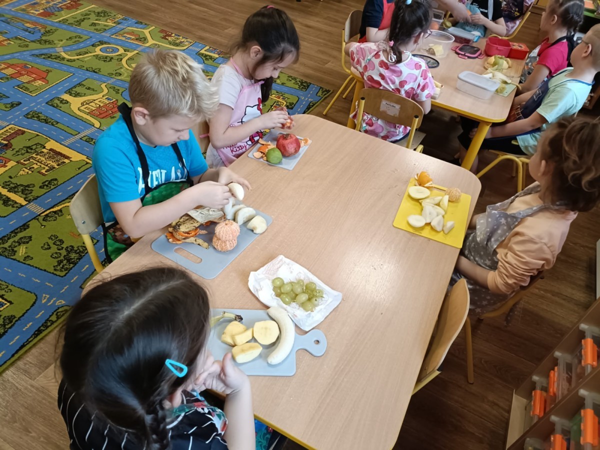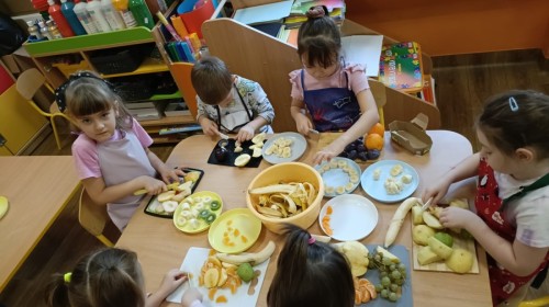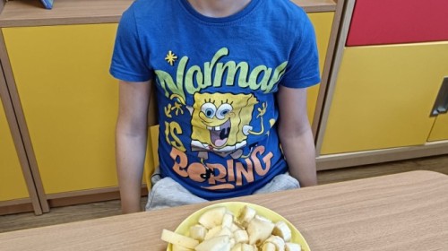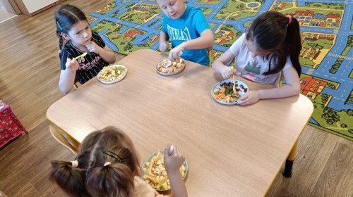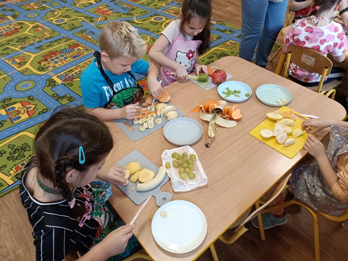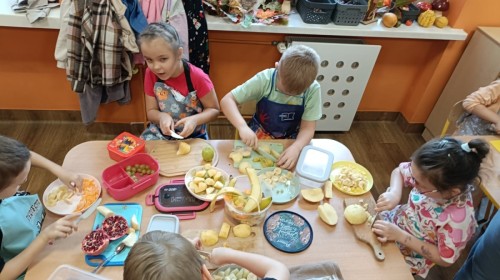 Dzisiaj dzieci samodzielnie przygotowały sałatkę owocową ze swoich ulubionych owoców. Powstały pyszne, różnorodne, kolorowe i pełne witamin sałatki, które dzieci zjadały z wielką przyjemnością. Największą radość dla przedszkolaków niewątpliwie stanowiło samodzielne przygotowanie stanowiska pracy i własnoręczne krojenie owoców i oczywiście sama degustacja.