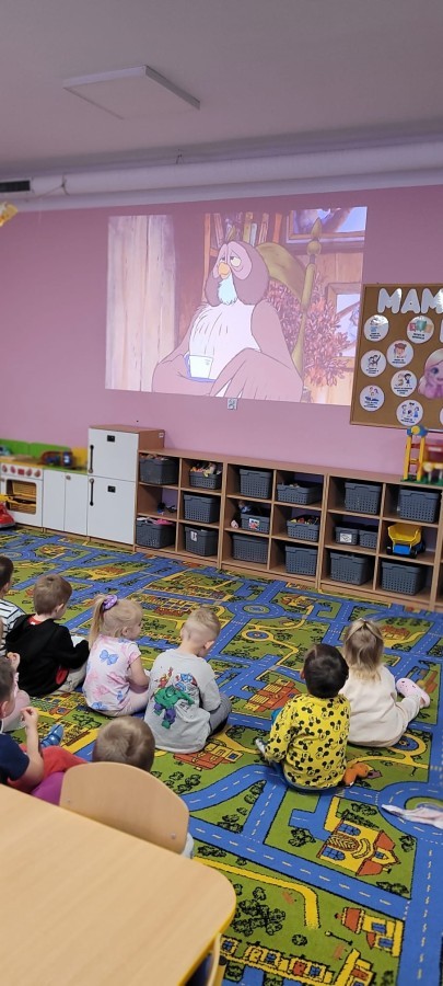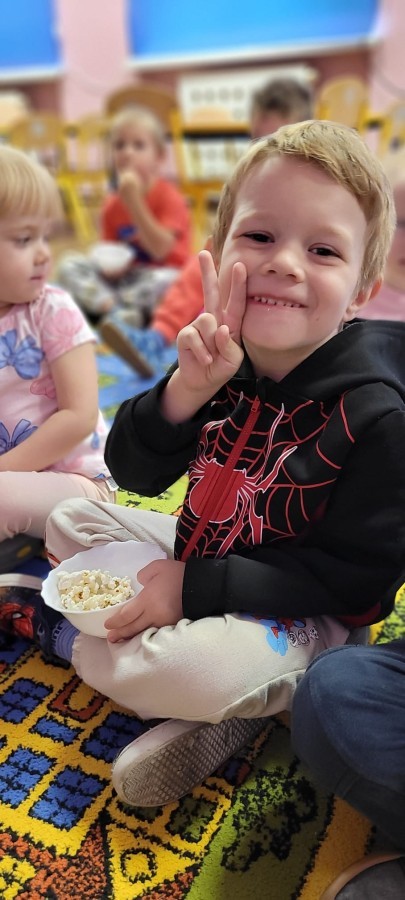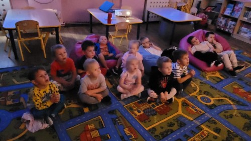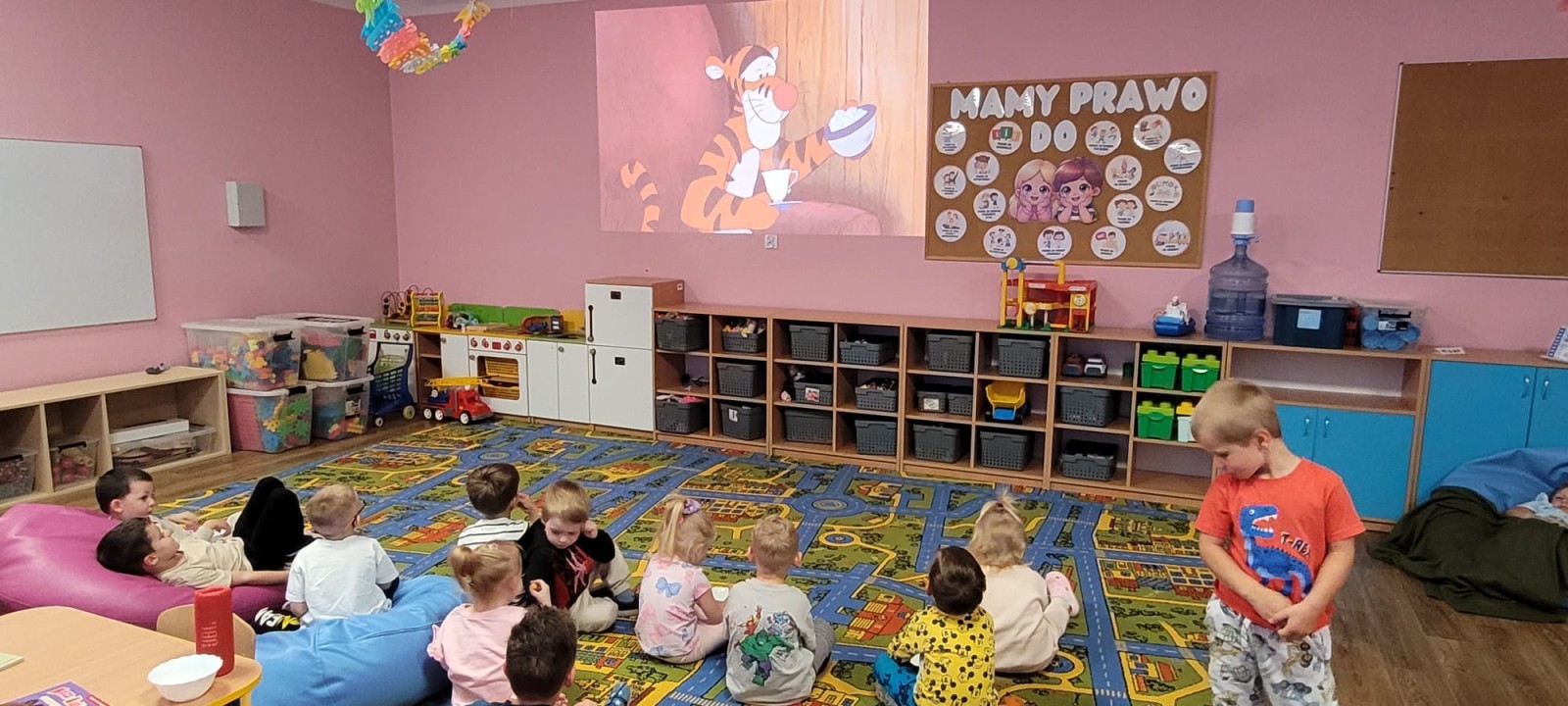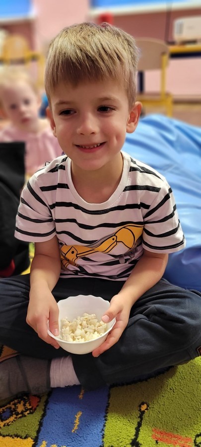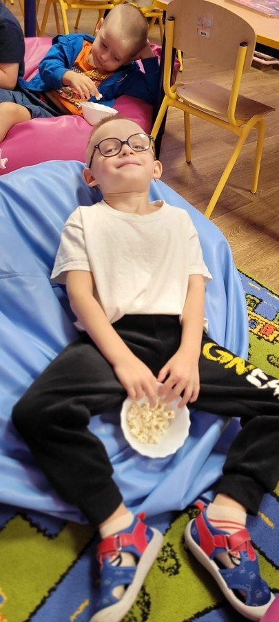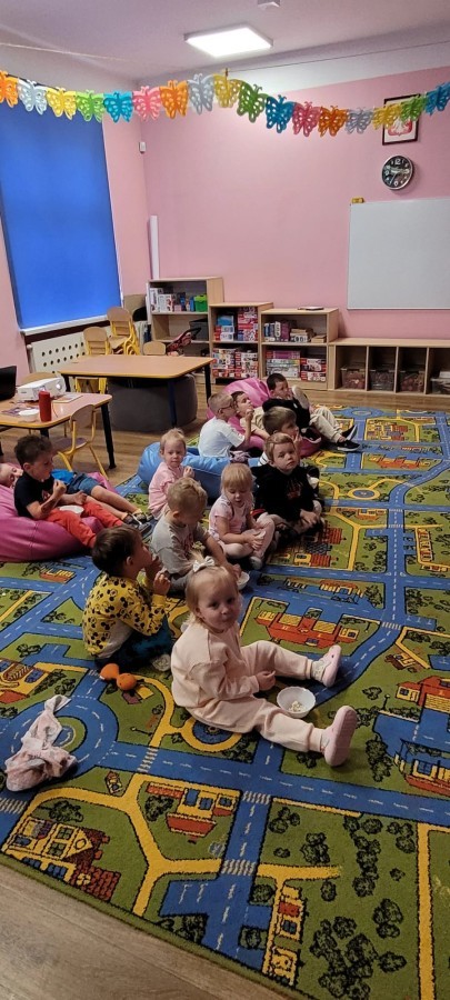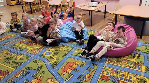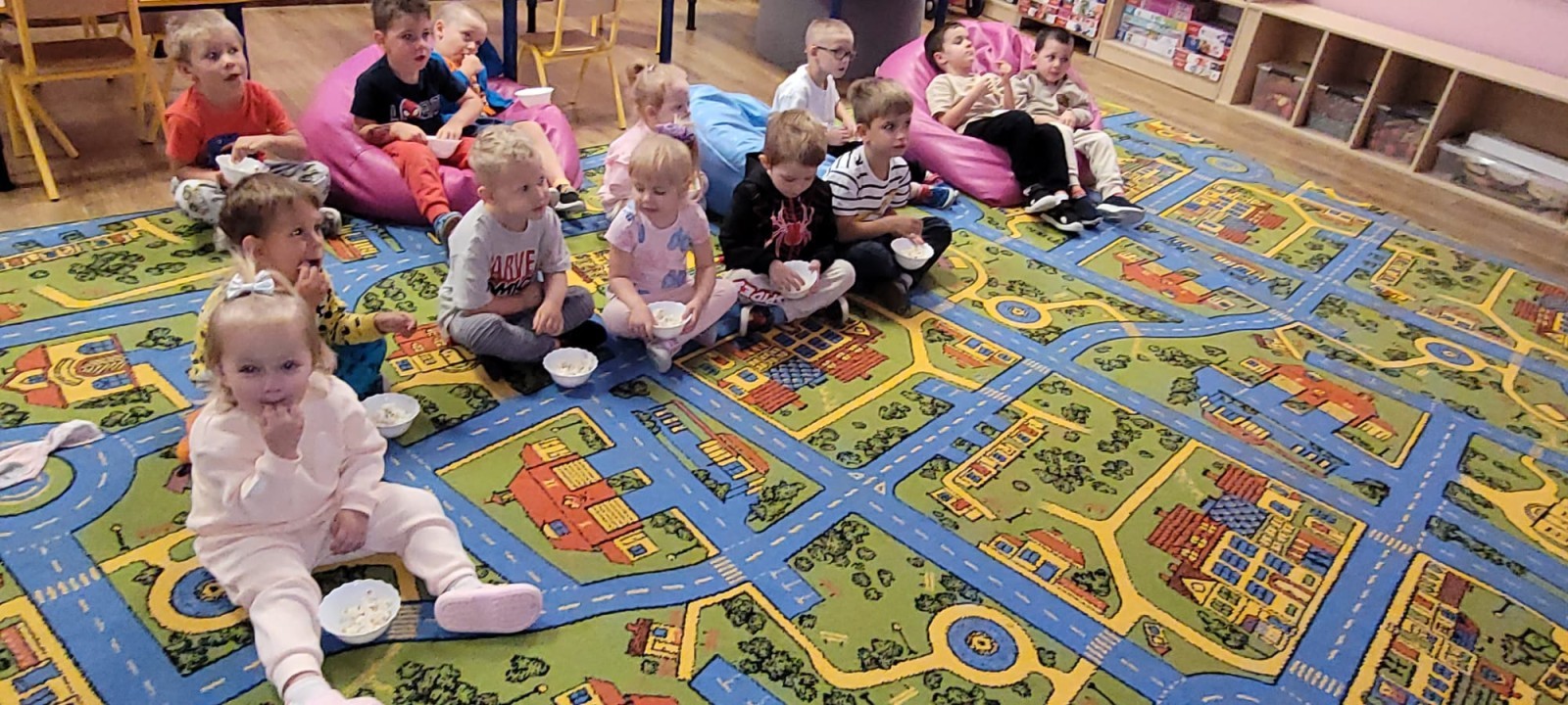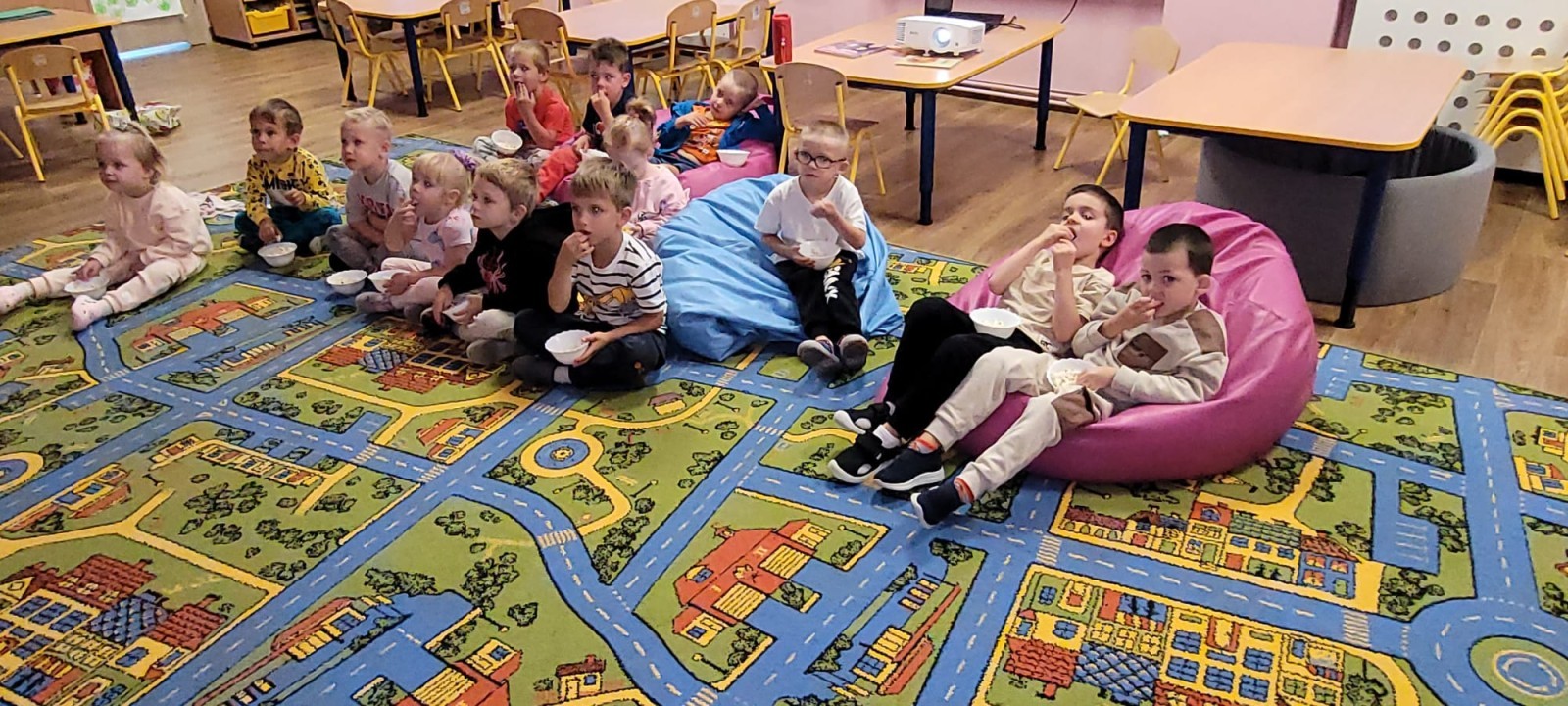 Grupa „Żabki”, czekając na seans bajkowy, wygodnie usiadła na kolorowych poduchach. Z uwagą oglądały przygody sympatycznego Tygryska i jego przyjaciół. Podczas bajki dzieci poczęstowały się popcornem i chrupkami.