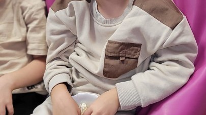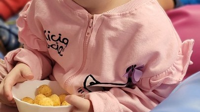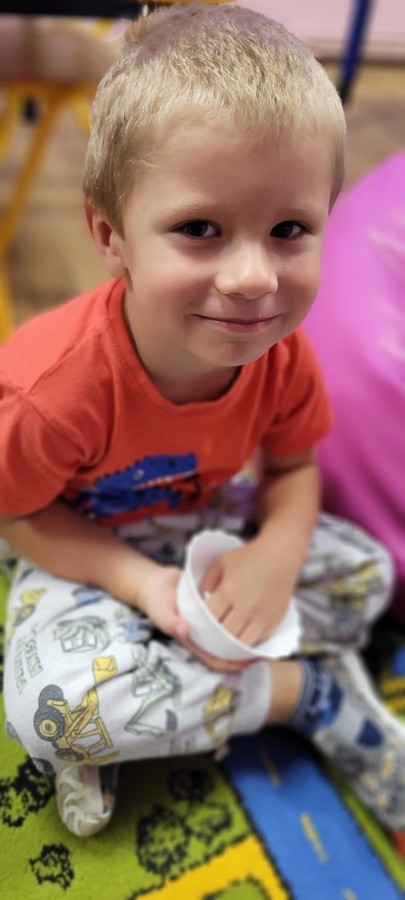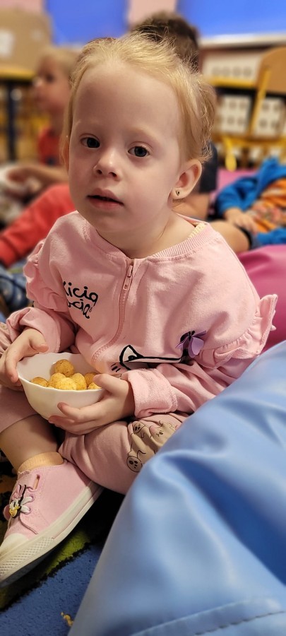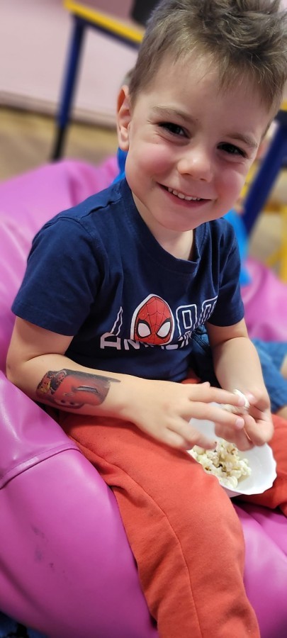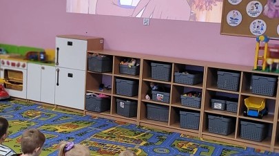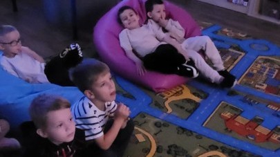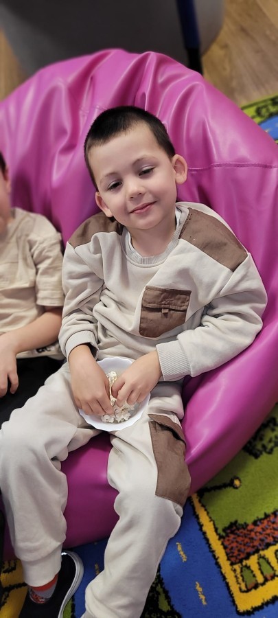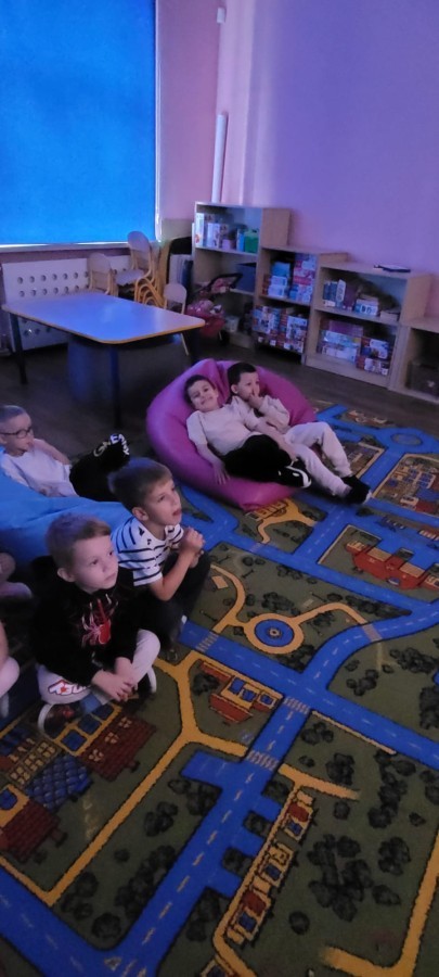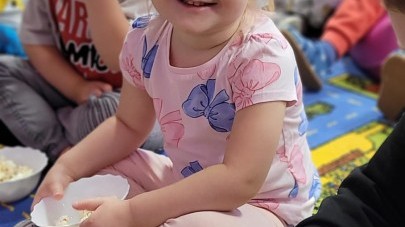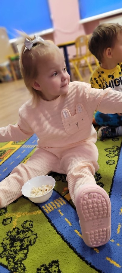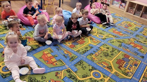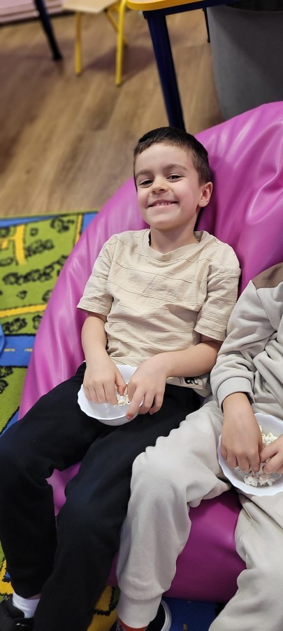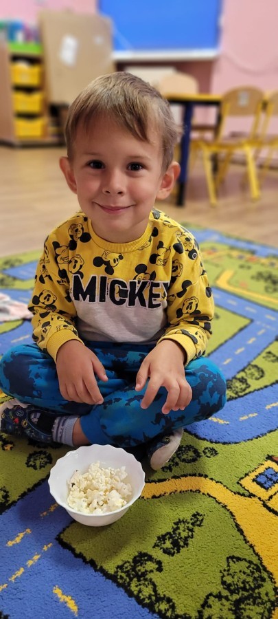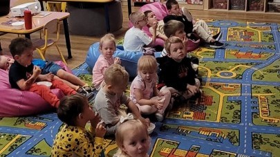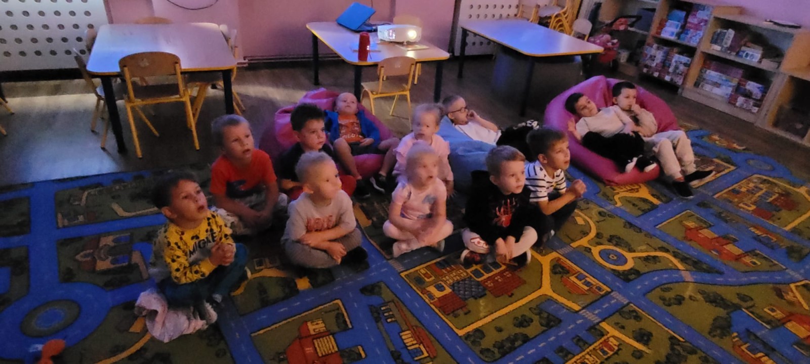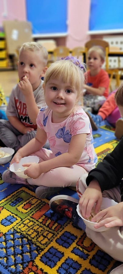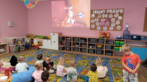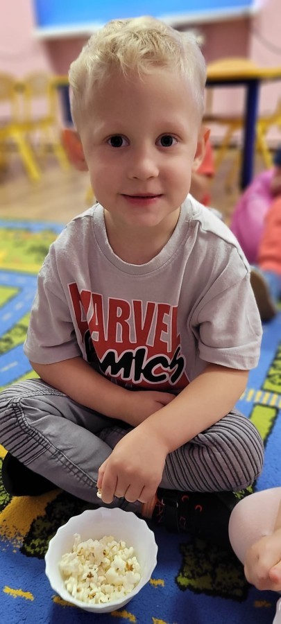 Grupa „Żabki”, czekając na seans bajkowy, wygodnie usiadła na kolorowych poduchach. Z uwagą oglądały przygody sympatycznego Tygryska i jego przyjaciół. Podczas bajki dzieci poczęstowały się popcornem i chrupkami.