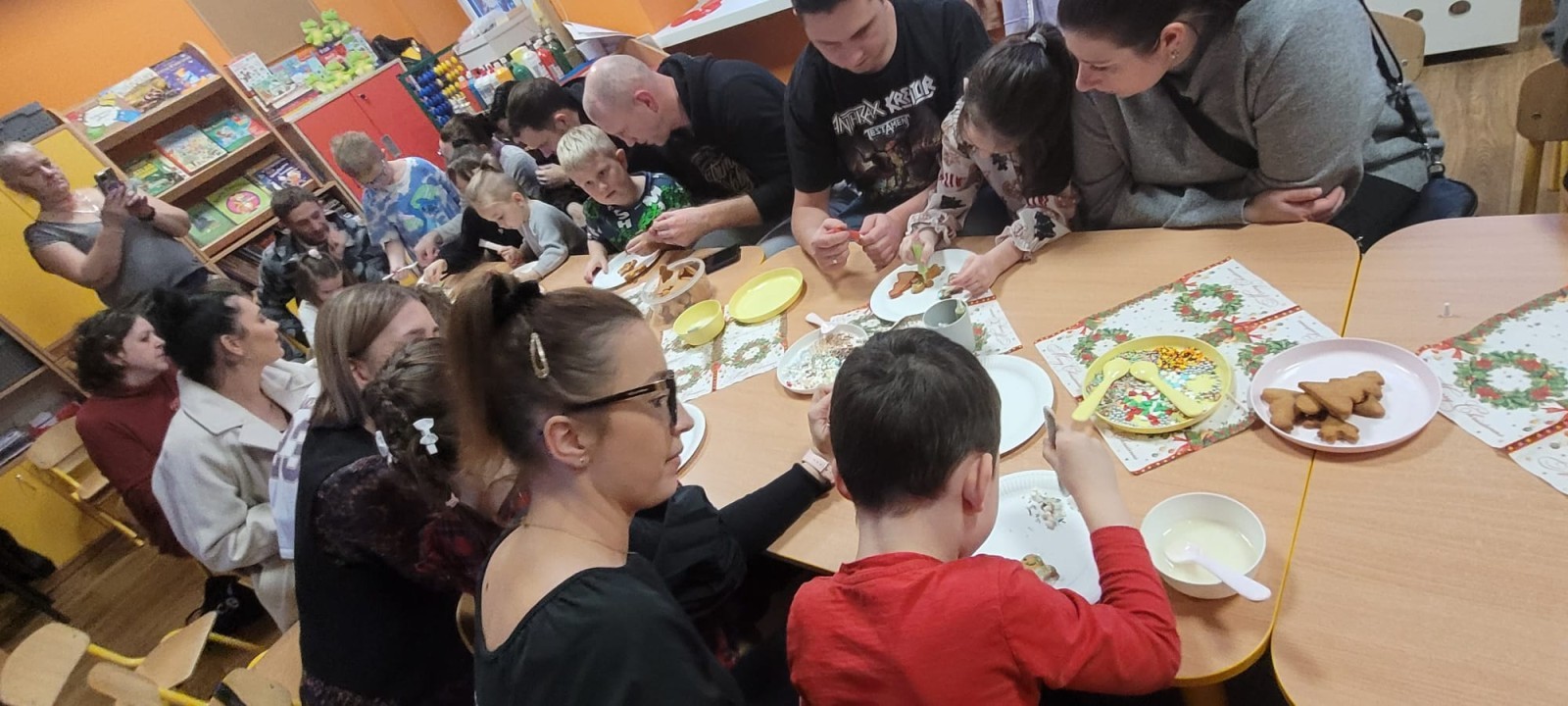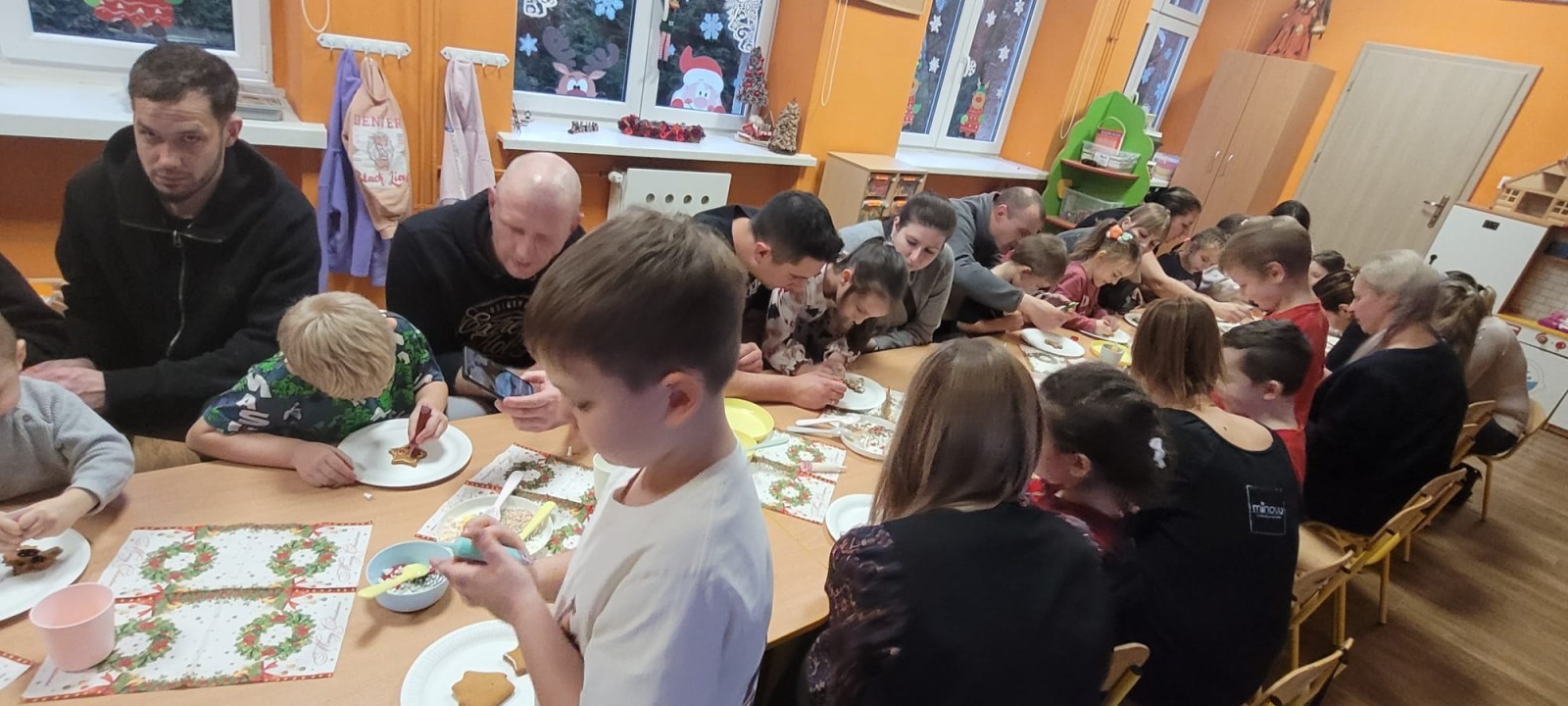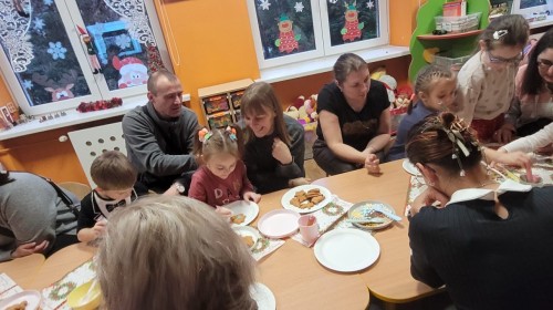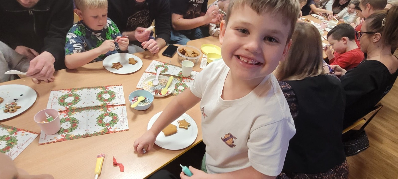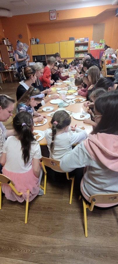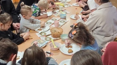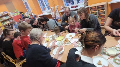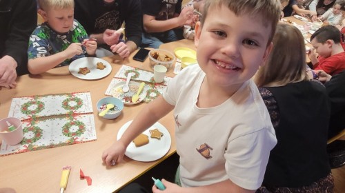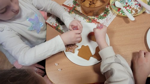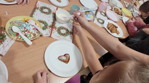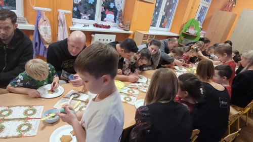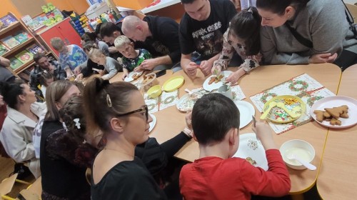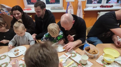Podczas spotkania uczestnicy z ogromnym zaangażowaniem zdobili świąteczne pierniczki. Wspólna praca sprzyjała integracji, rozwijała kreatywność dzieci oraz umacniała więzi rodzinne. Rodzice chętnie wspierali swoje pociechy, a dzieci z dumą prezentowały efekty swojej twórczości.