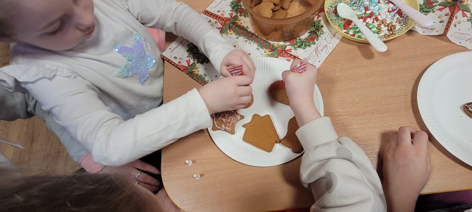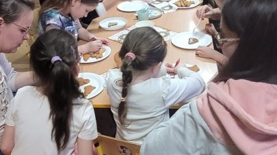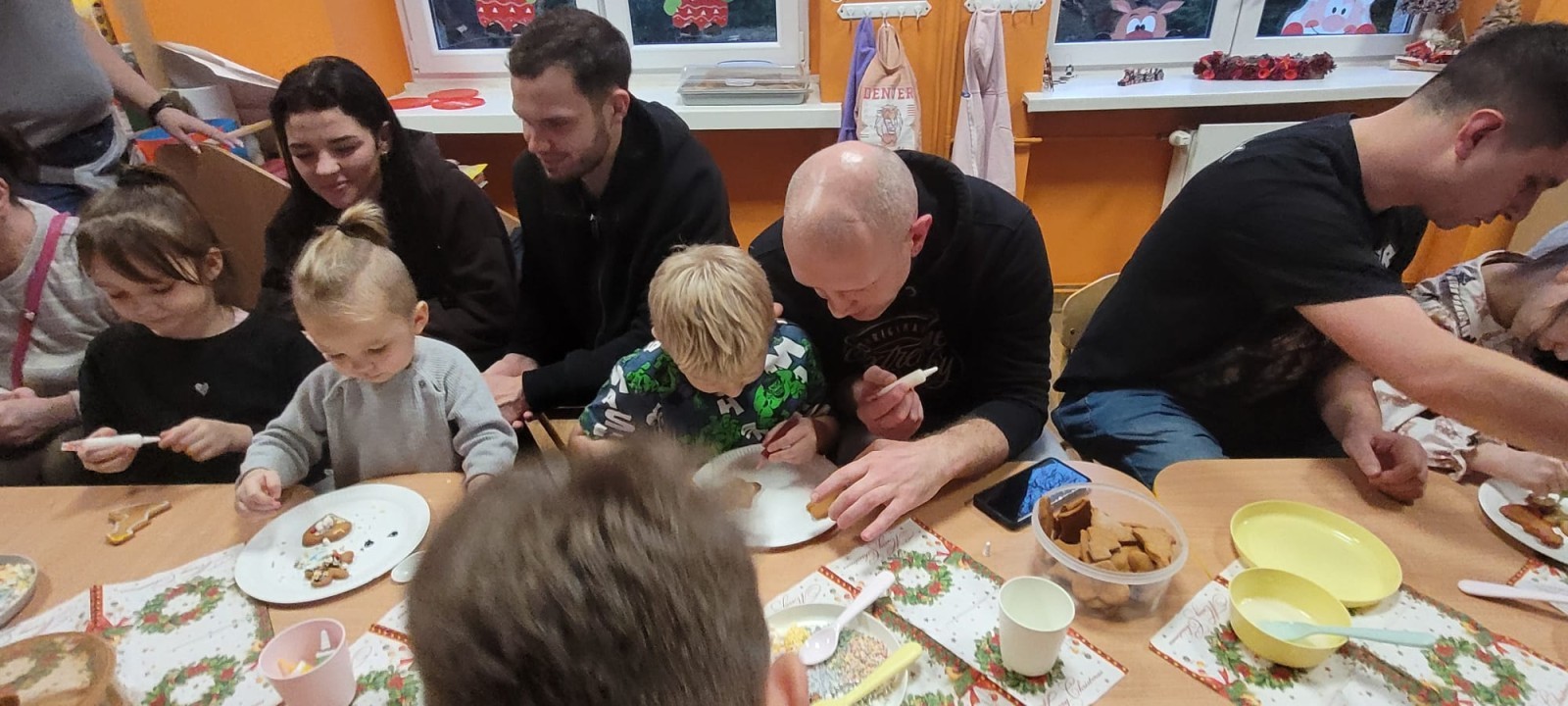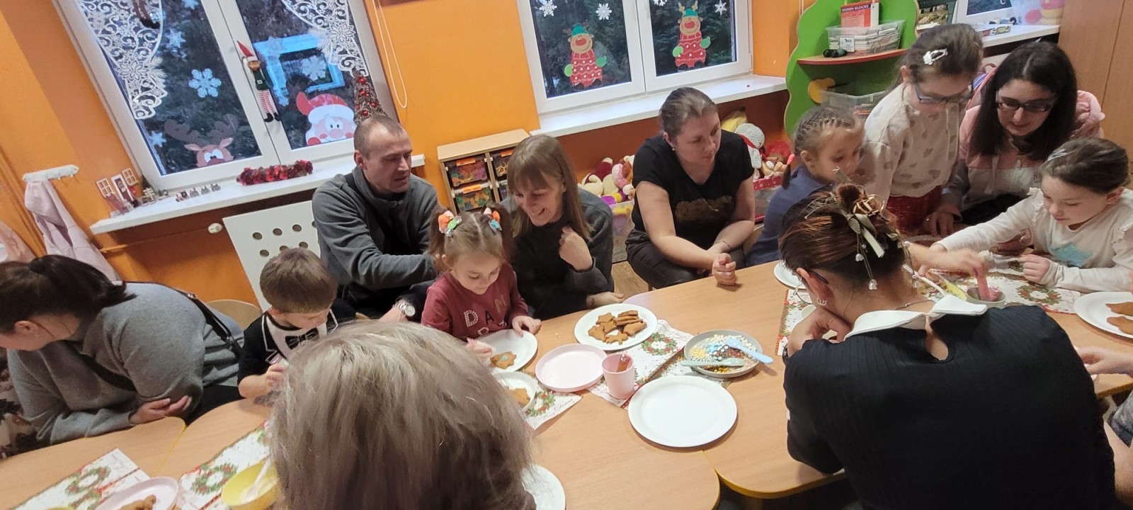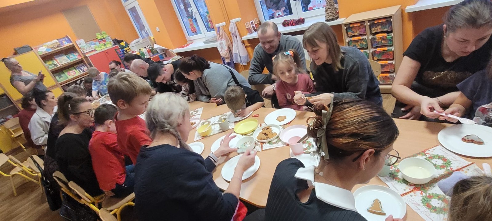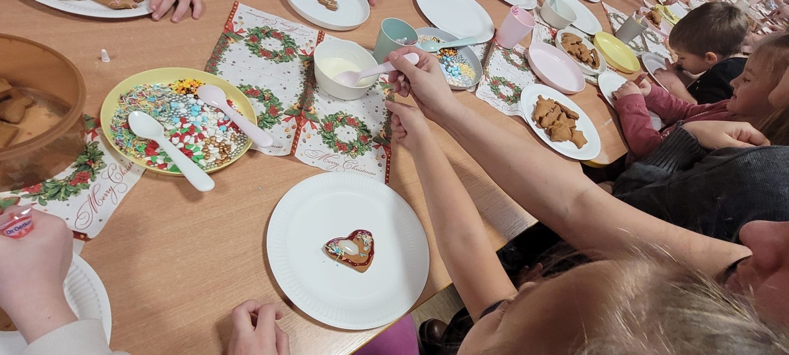 Podczas spotkania uczestnicy z ogromnym zaangażowaniem zdobili świąteczne pierniczki. Wspólna praca sprzyjała integracji, rozwijała kreatywność dzieci oraz umacniała więzi rodzinne. Rodzice chętnie wspierali swoje pociechy, a dzieci z dumą prezentowały efekty swojej twórczości.