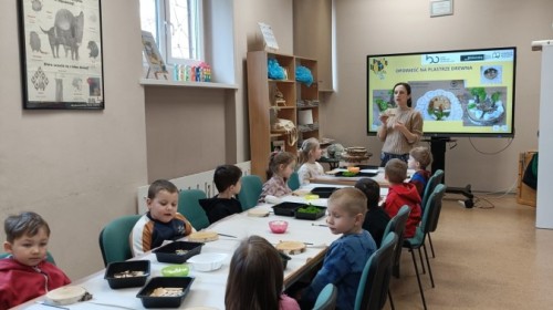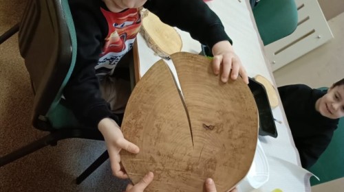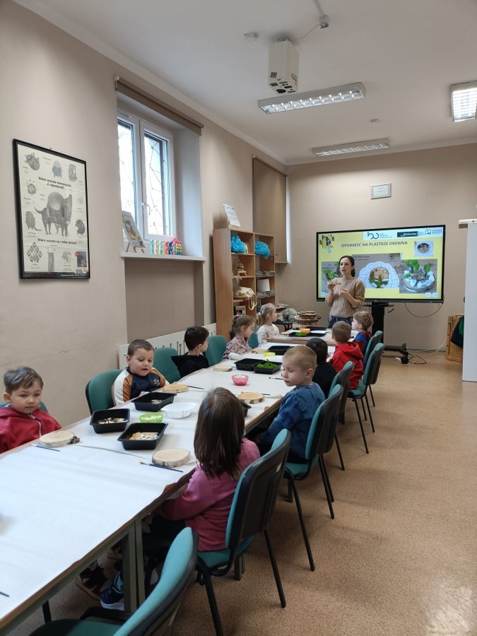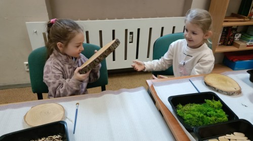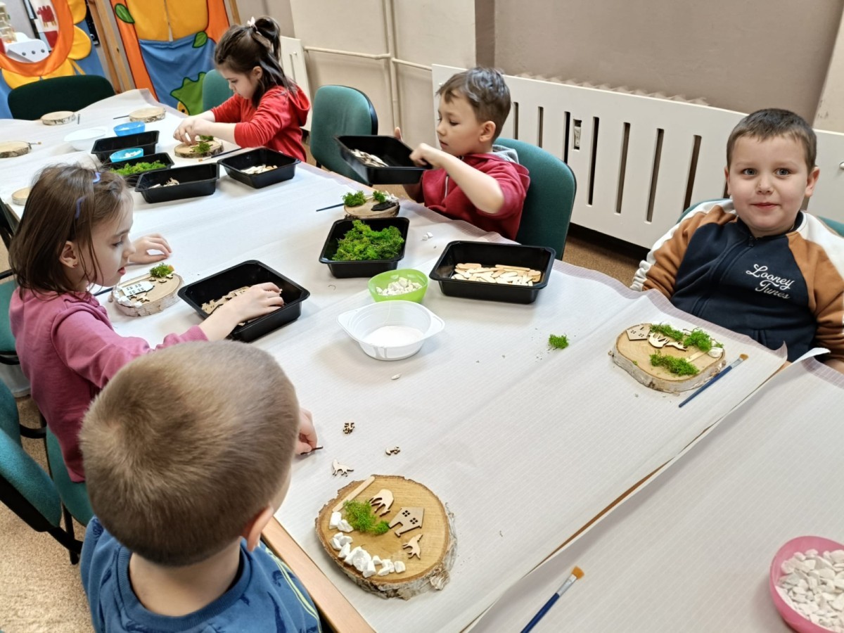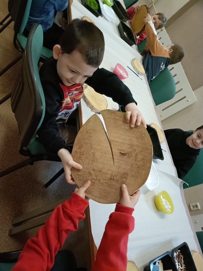 10 marca dzieci wybrały się na wyjście do Biblioteki Publicznej, gdzie uczestniczyły w ciekawych warsztatach plastyczno-przyrodniczych pt. „Obrazek na plastrze drewna”. Na początku spotkania dzieci miały okazję obejrzeć plastry drewna pochodzące z różnych gatunków drzew, dowiedzieć się, czym różnią się drzewa oraz jak można rozpoznać ich wiek po słojach.