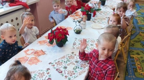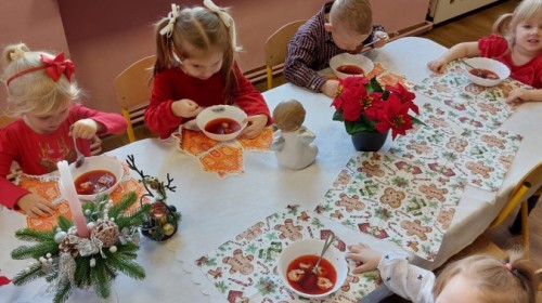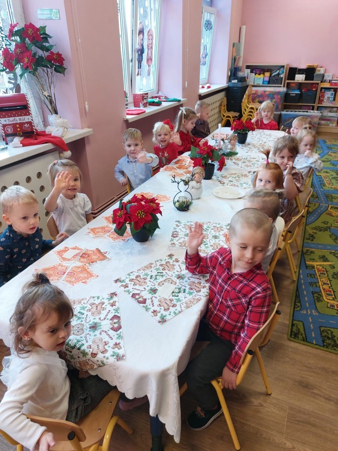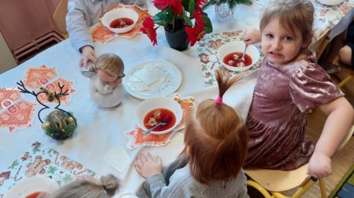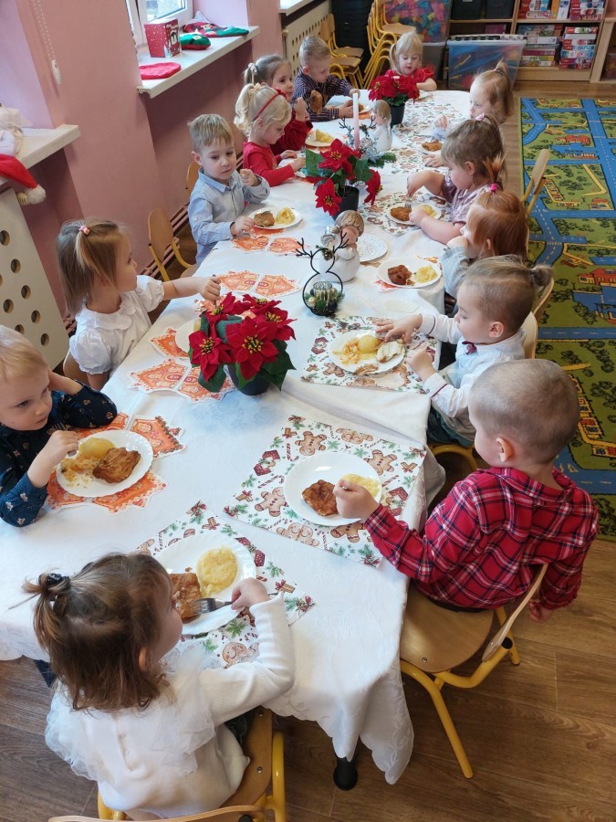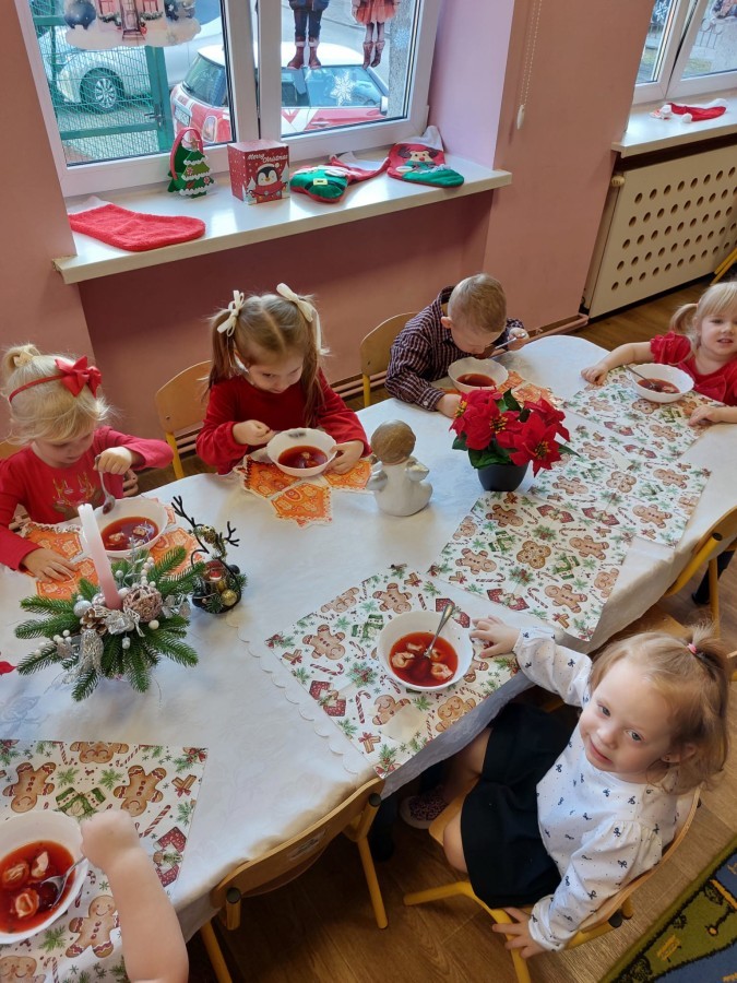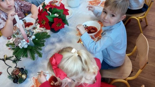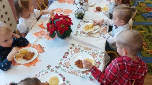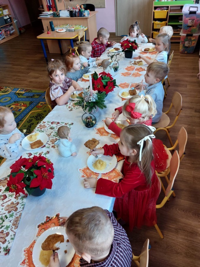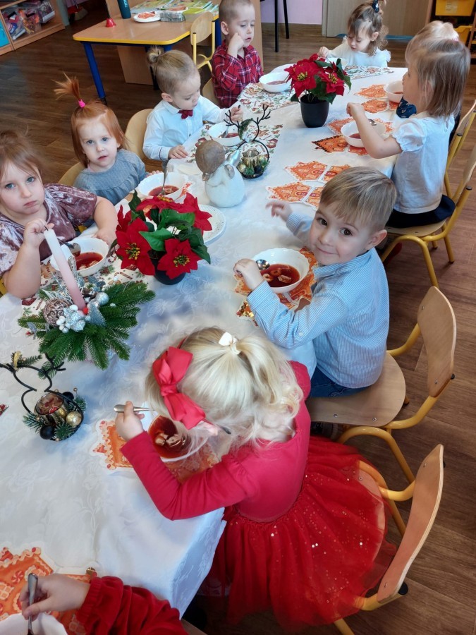 Uroczysty wigilijny obiad w grupie Żabek. Przy melodii kolęd wspólnie złożyliśmy sobie życzenia Bożonarodzeniowe oraz smakowaliśmy tradycyjne potrawy wigilijne, które bardzo smakowały naszym maluszkom.