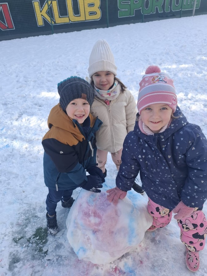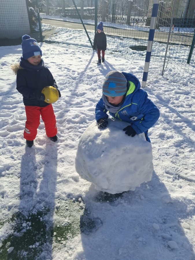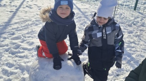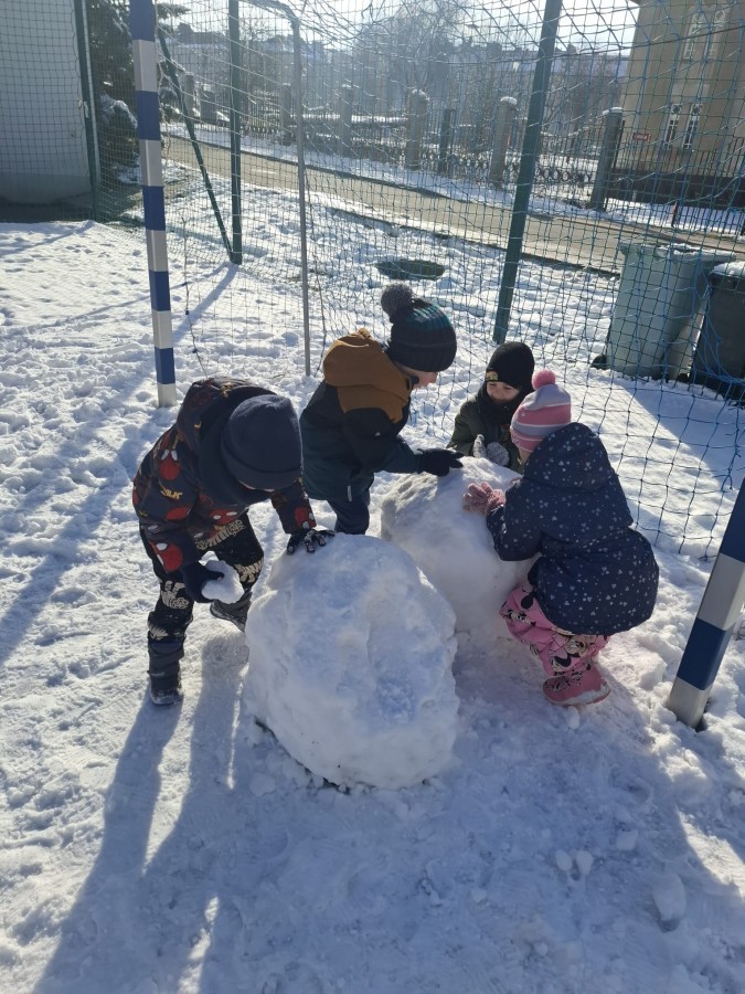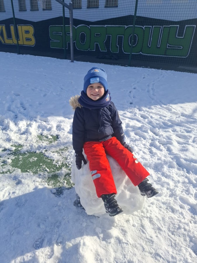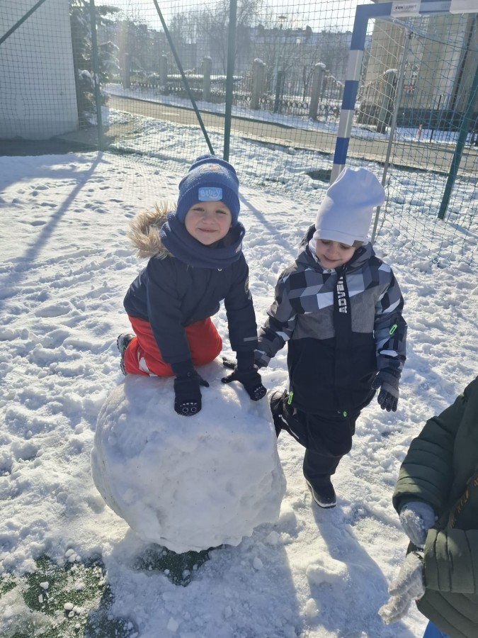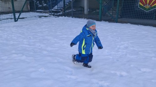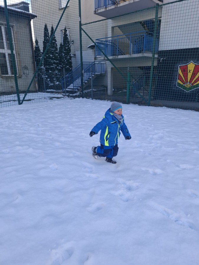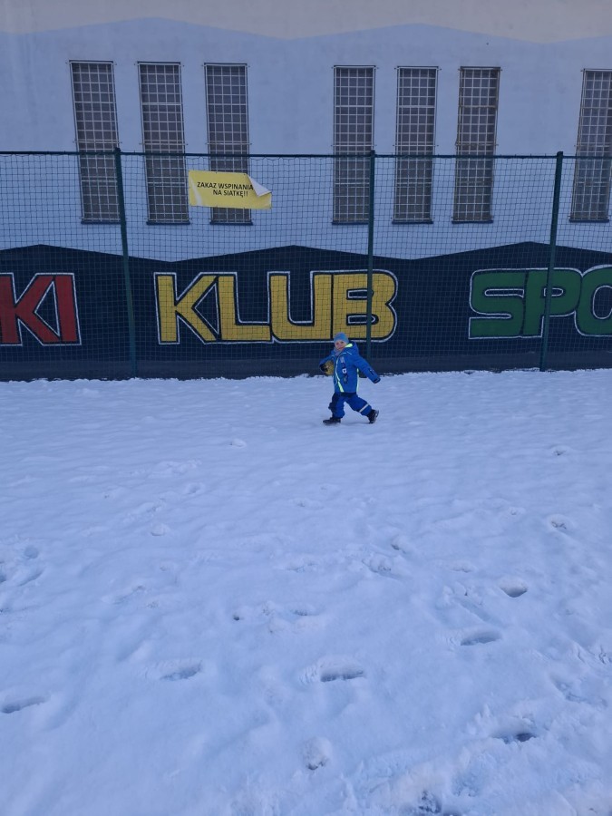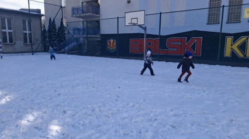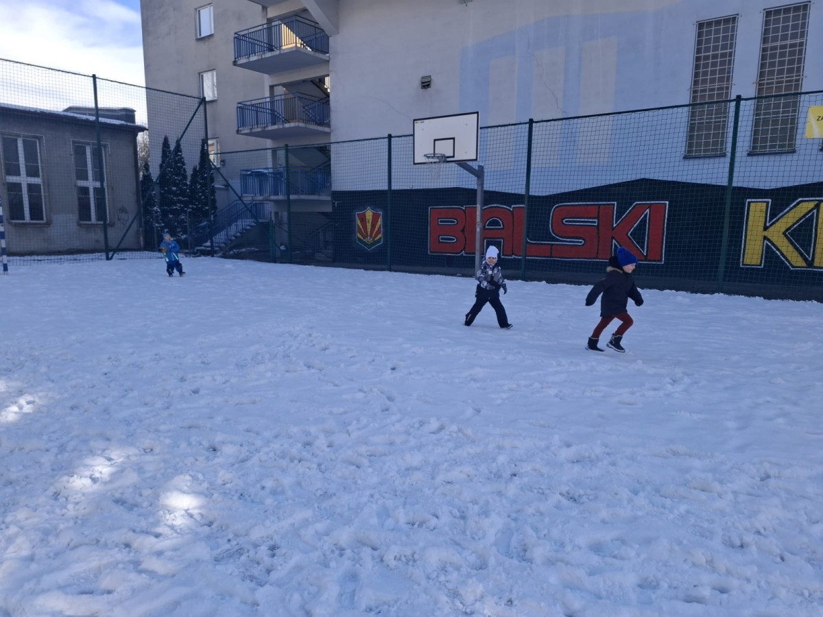 Wyjście na boisko było świetną okazją do aktywności fizycznej w zimowej scenerii. Dzieci trenowały koordynację, biegając po ośnieżonej nawierzchni, a przy okazji obserwowały, jak zmienia się otoczenie o tej porze roku.