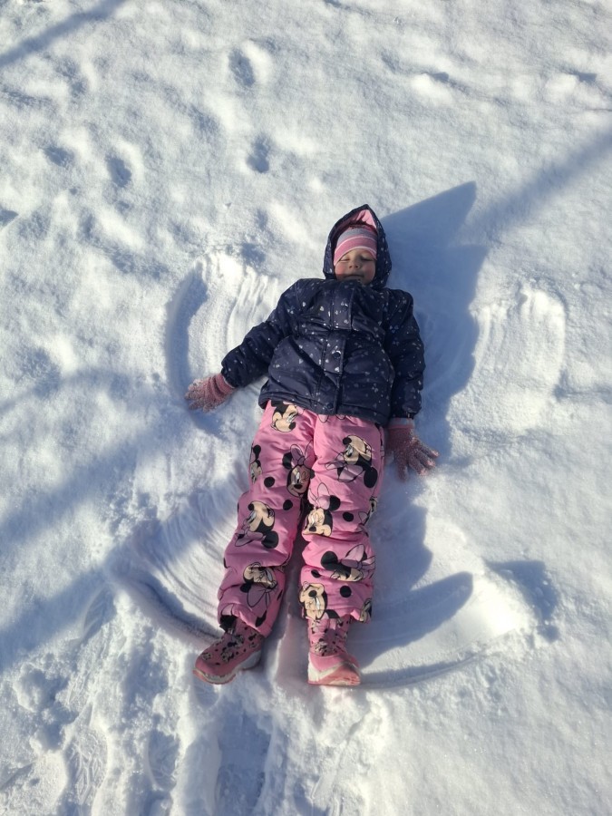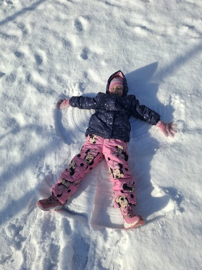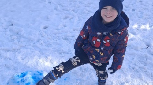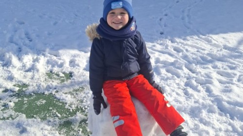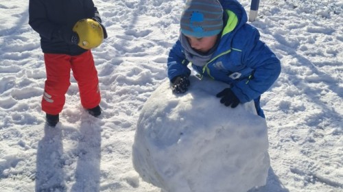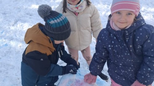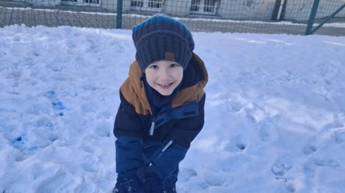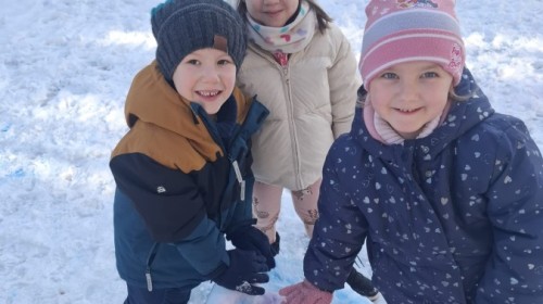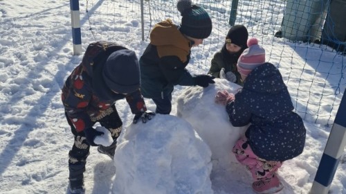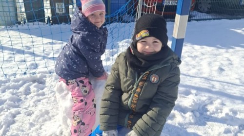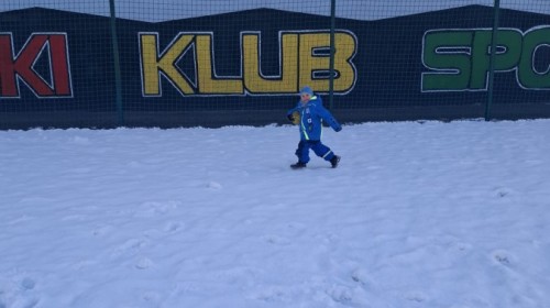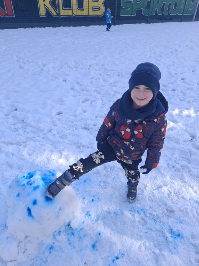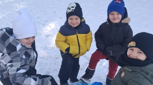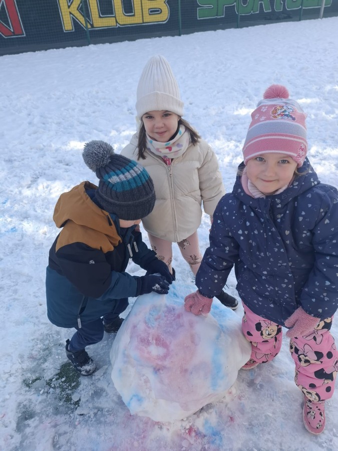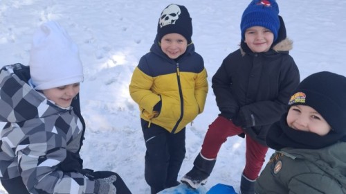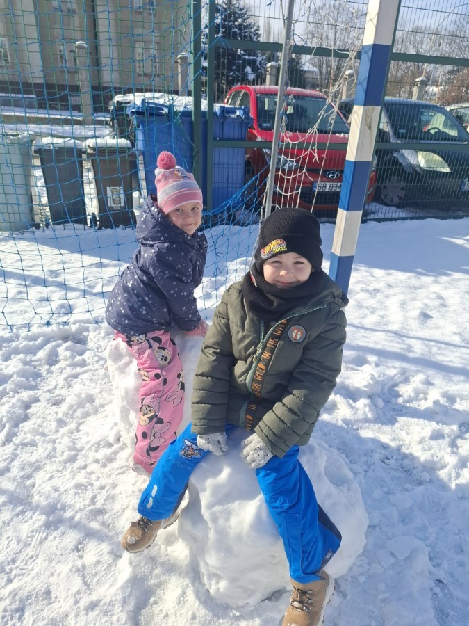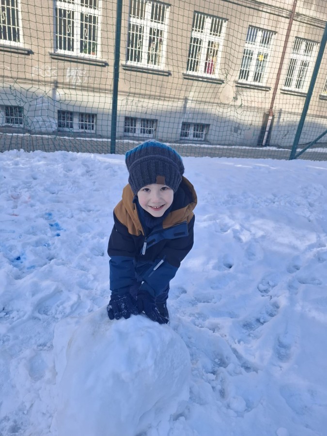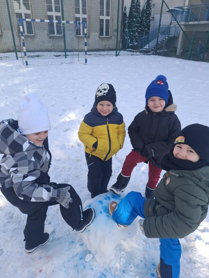 Wyjście na boisko było świetną okazją do aktywności fizycznej w zimowej scenerii. Dzieci trenowały koordynację, biegając po ośnieżonej nawierzchni, a przy okazji obserwowały, jak zmienia się otoczenie o tej porze roku.
