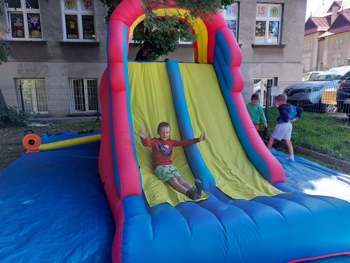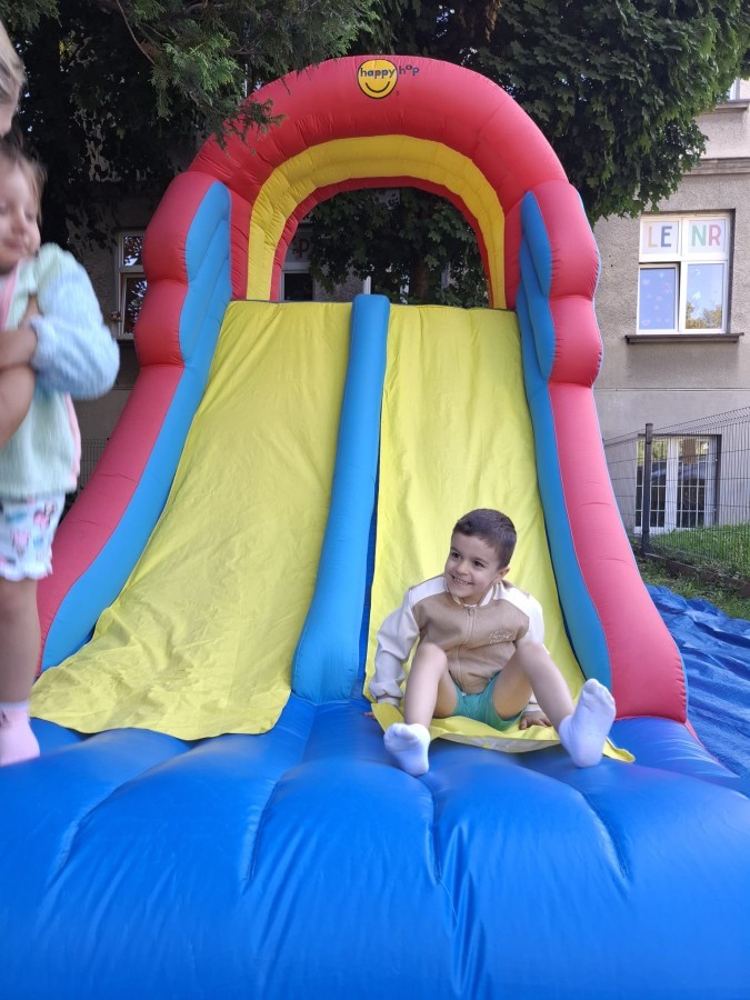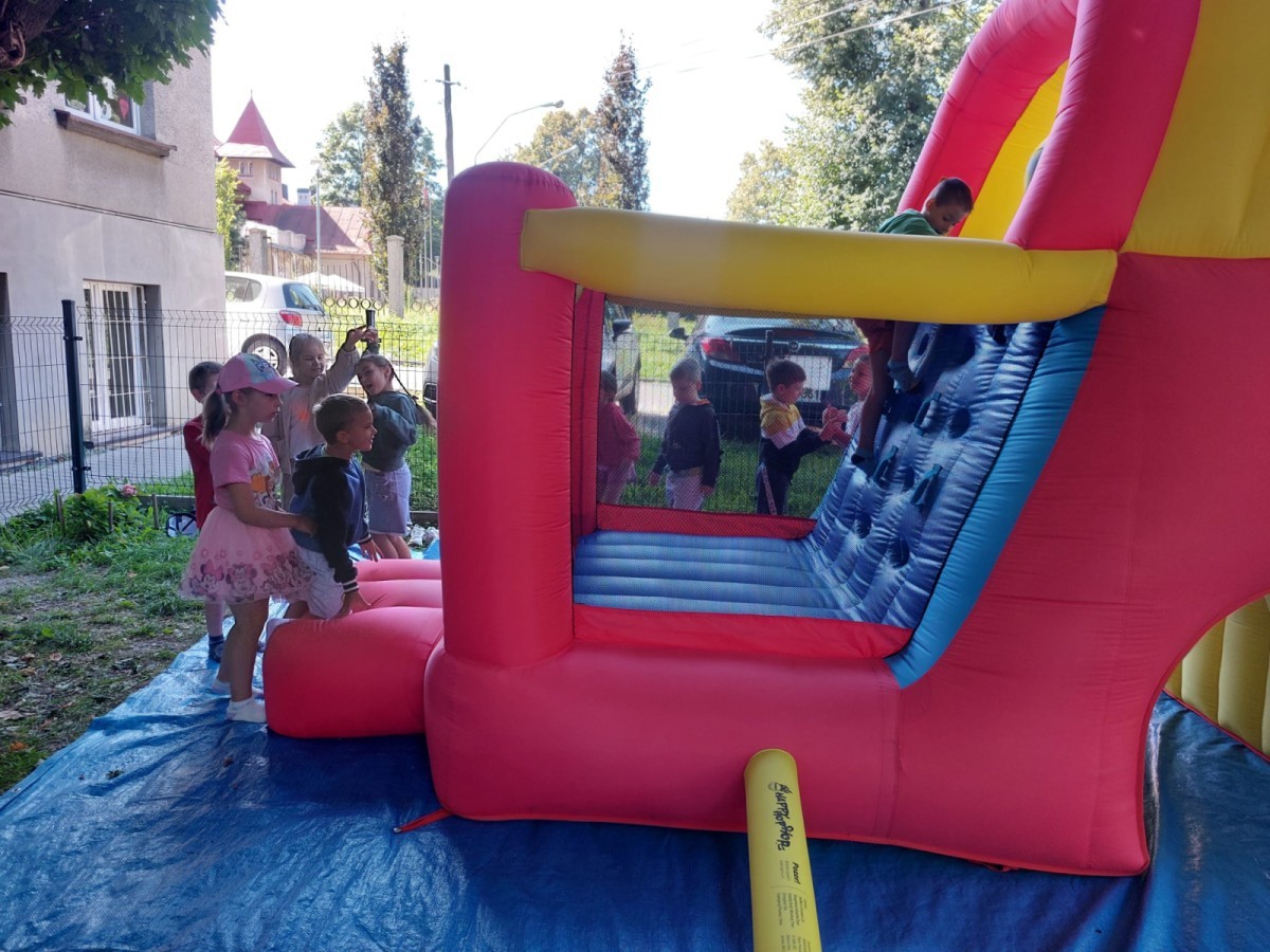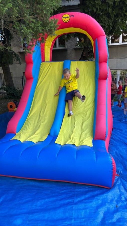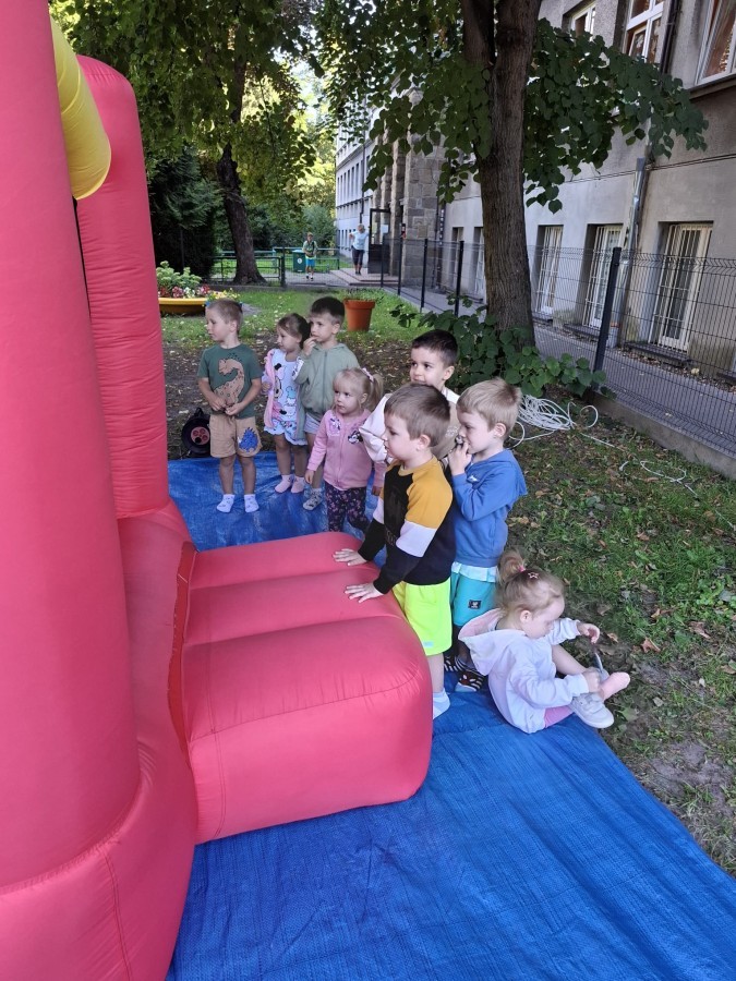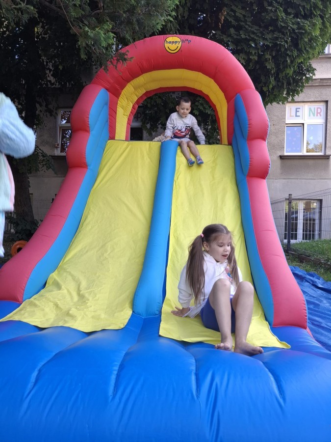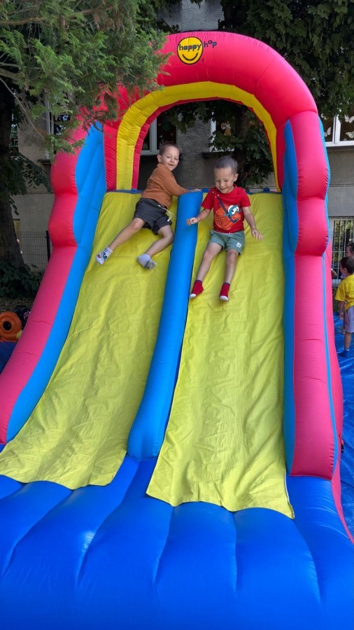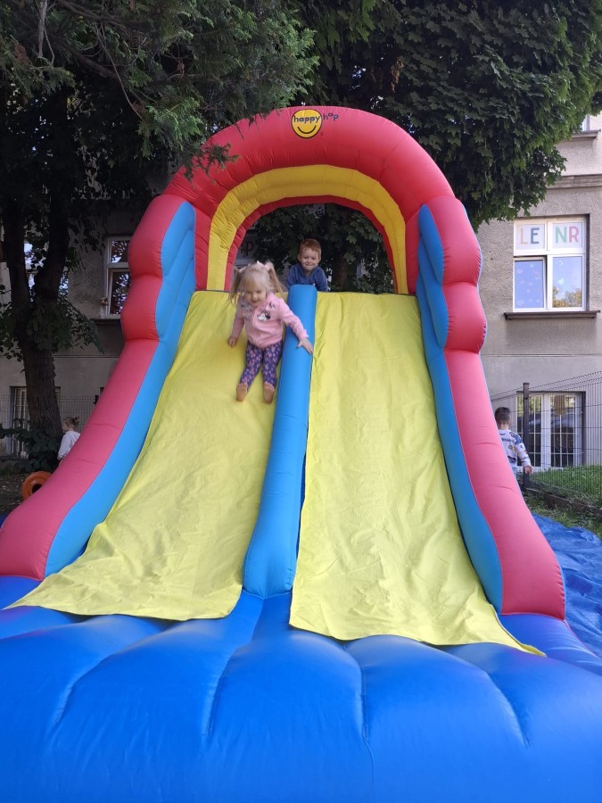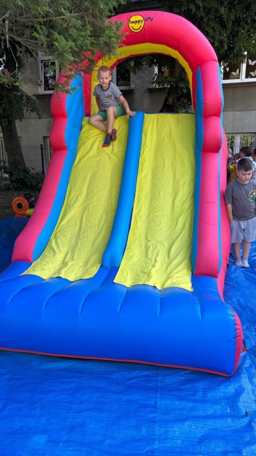 Dzieci w przedszkolu radośnie bawiły się na dmuchańcu, skacząc, śmiejąc się i ścigając po kolorowych zjeżdżalniach. Z każdym skokiem ich twarze rozjaśniały się od szczerego zachwytu, a dźwięk ich radosnych okrzyków wypełniał całą przestrzeń. Wszyscy na zmianę zjeżdżali w dół. Dmuchaniec stanowił idealne miejsce do wspólnej zabawy, gdzie dzieci mogły cieszyć się ruchem i wzajemnym towarzystwem.