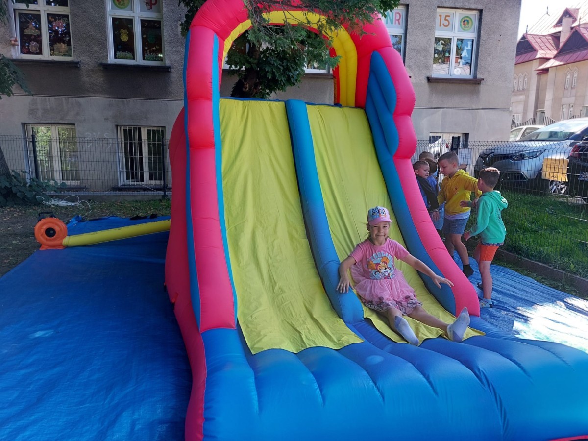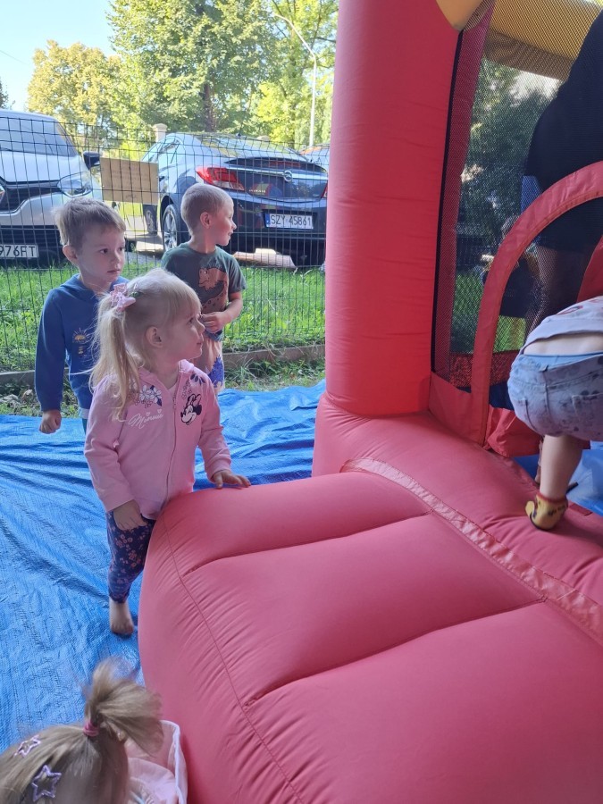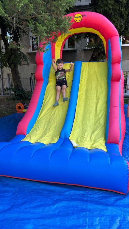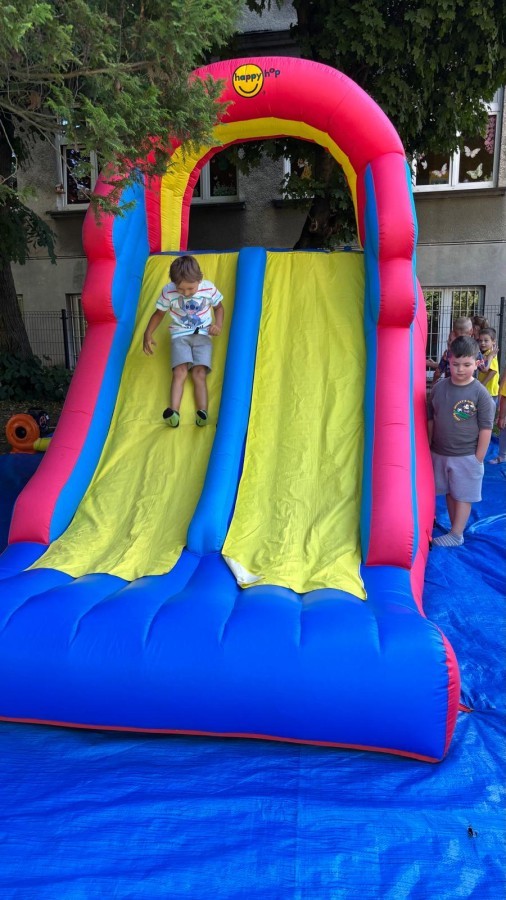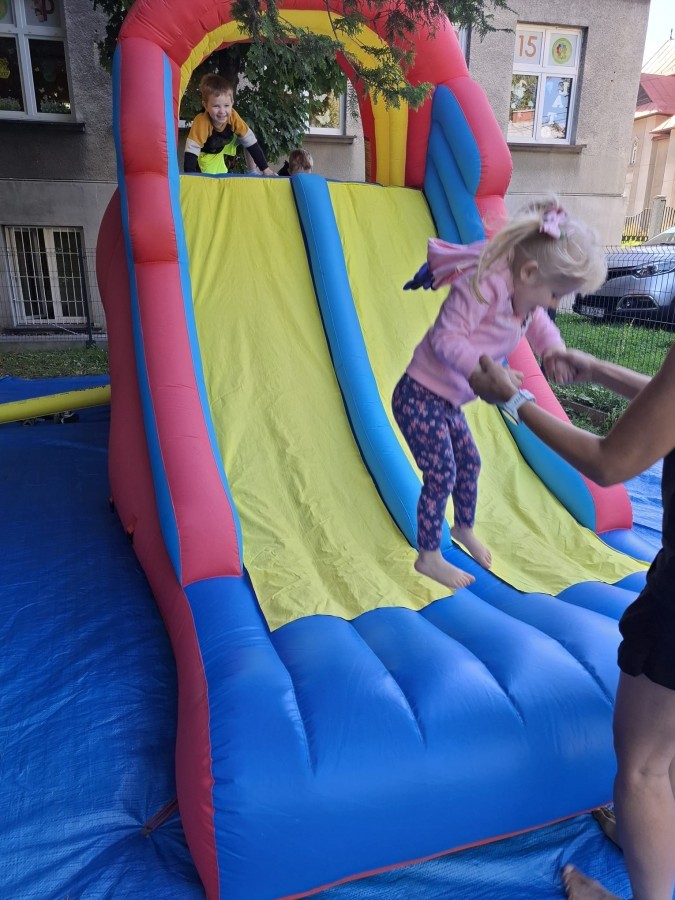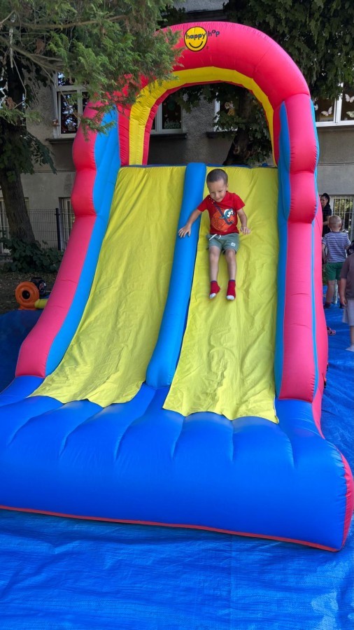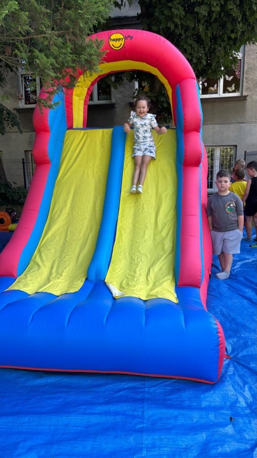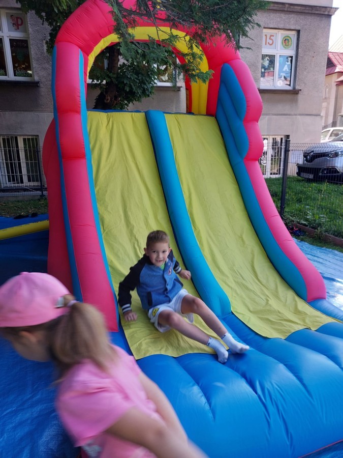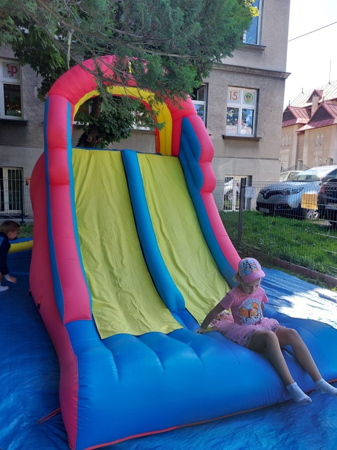 Dzieci w przedszkolu radośnie bawiły się na dmuchańcu, skacząc, śmiejąc się i ścigając po kolorowych zjeżdżalniach. Z każdym skokiem ich twarze rozjaśniały się od szczerego zachwytu, a dźwięk ich radosnych okrzyków wypełniał całą przestrzeń. Wszyscy na zmianę zjeżdżali w dół. Dmuchaniec stanowił idealne miejsce do wspólnej zabawy, gdzie dzieci mogły cieszyć się ruchem i wzajemnym towarzystwem.