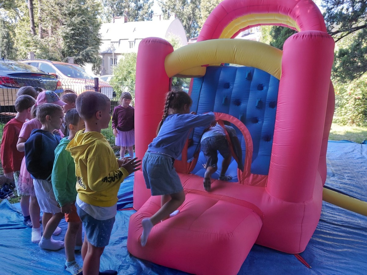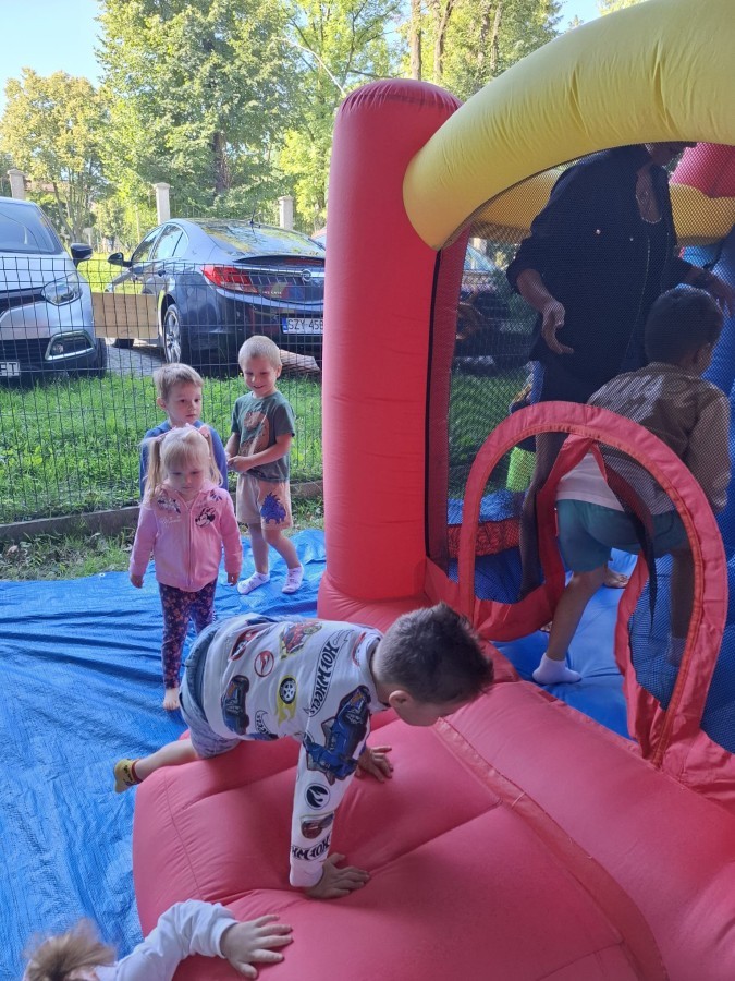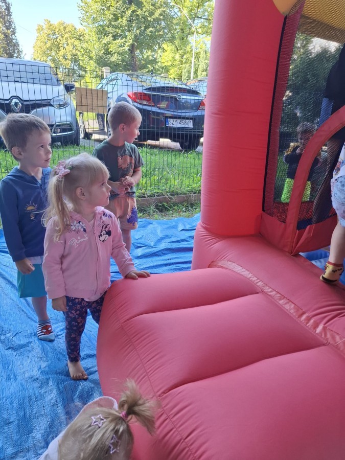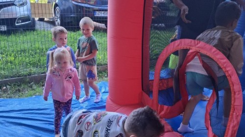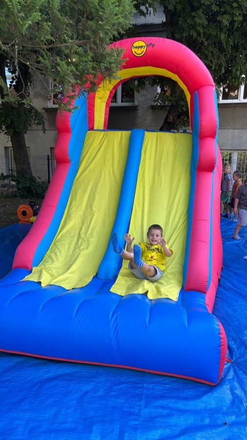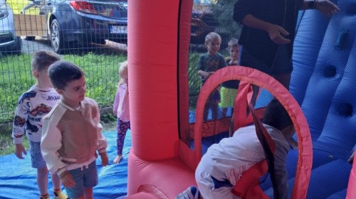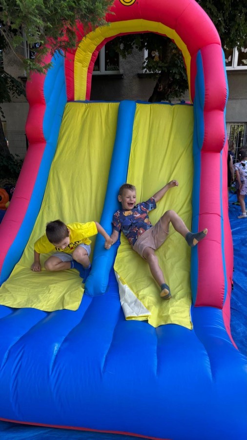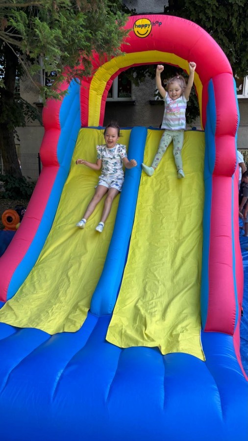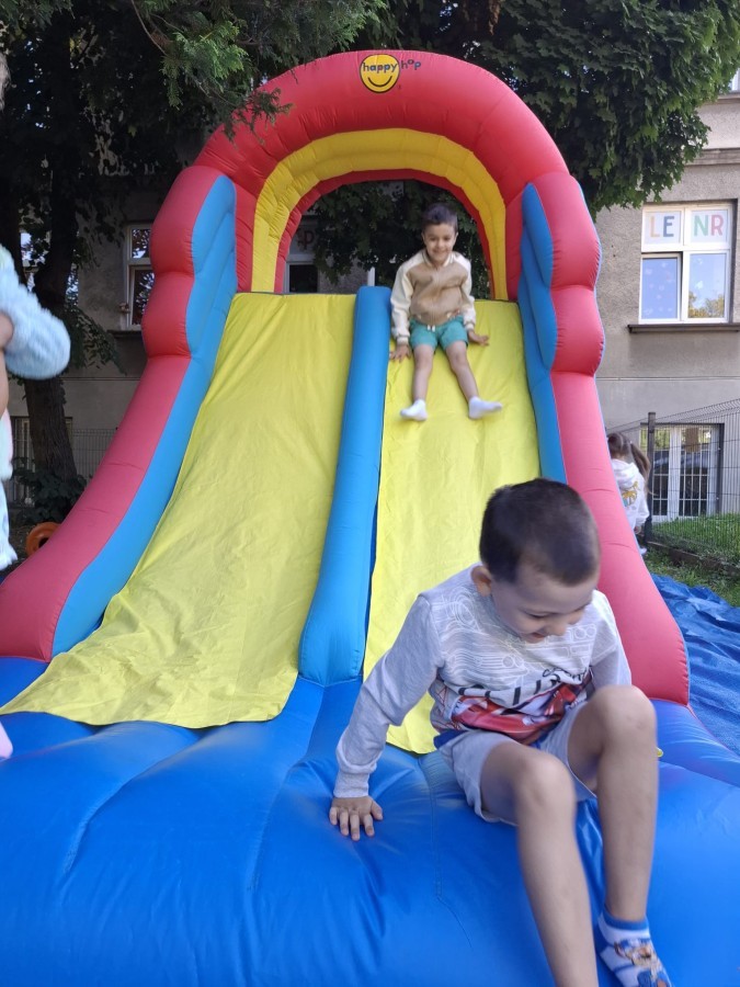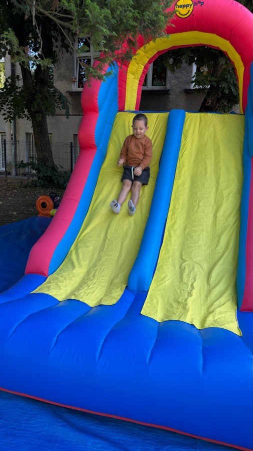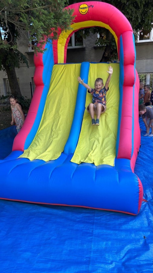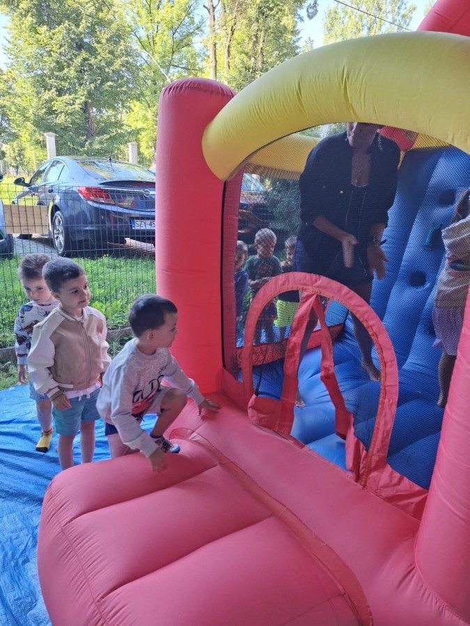 Dzieci w przedszkolu radośnie bawiły się na dmuchańcu, skacząc, śmiejąc się i ścigając po kolorowych zjeżdżalniach. Z każdym skokiem ich twarze rozjaśniały się od szczerego zachwytu, a dźwięk ich radosnych okrzyków wypełniał całą przestrzeń. Wszyscy na zmianę zjeżdżali w dół. Dmuchaniec stanowił idealne miejsce do wspólnej zabawy, gdzie dzieci mogły cieszyć się ruchem i wzajemnym towarzystwem.