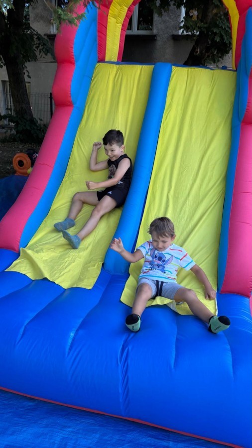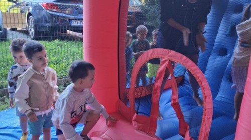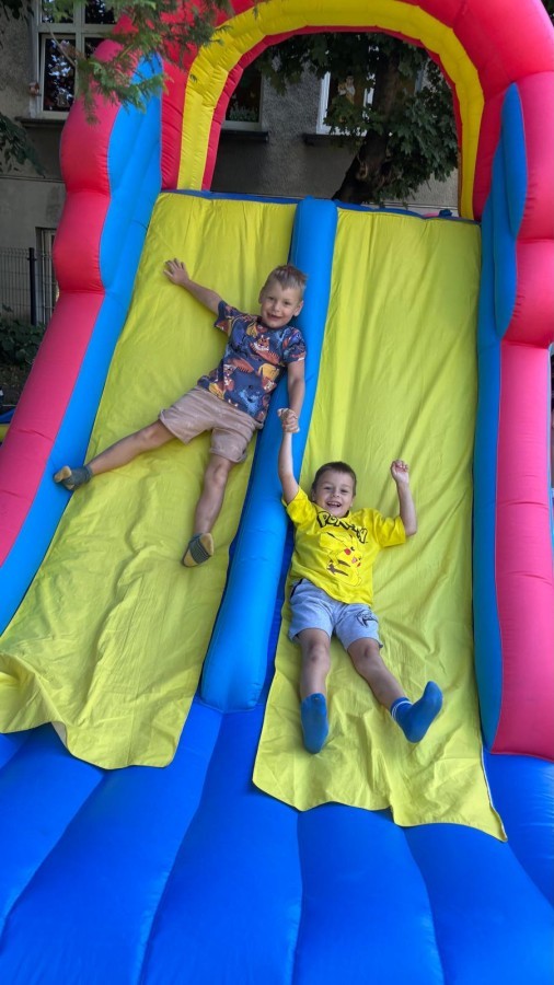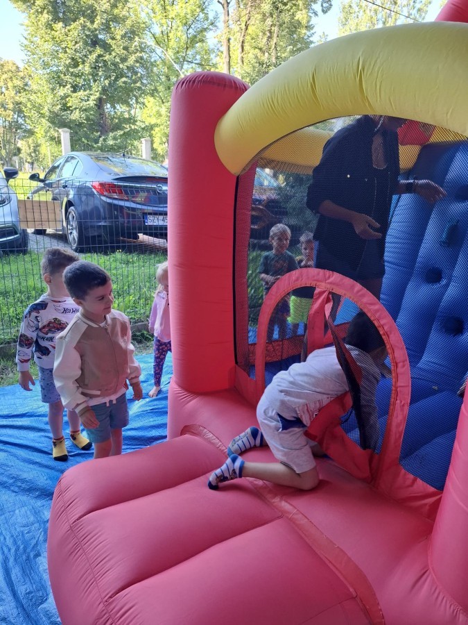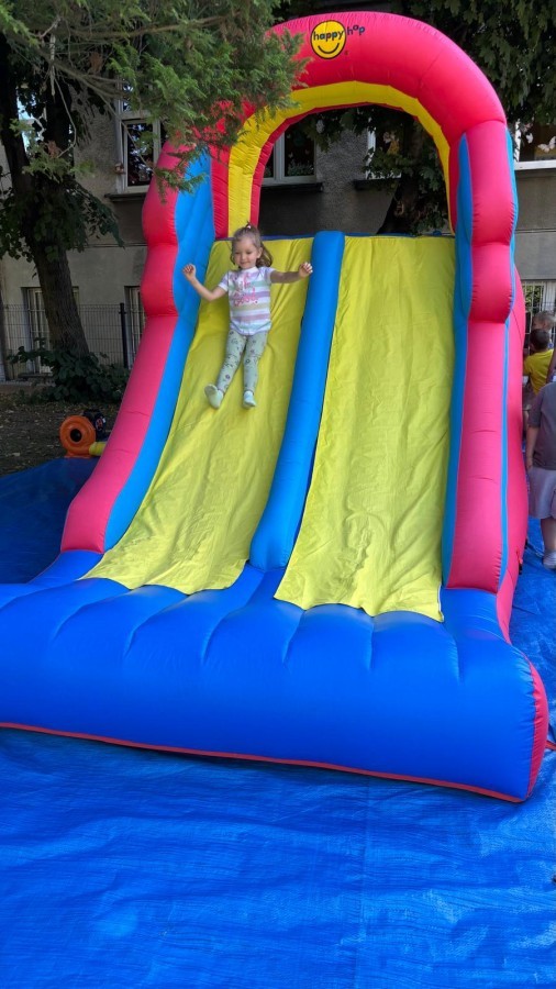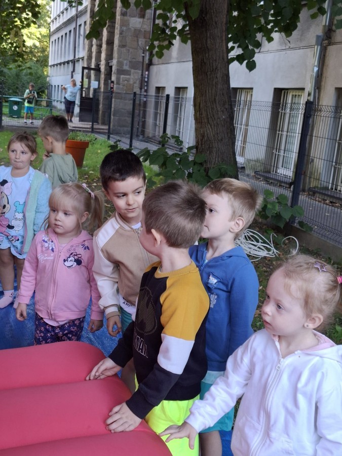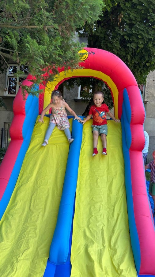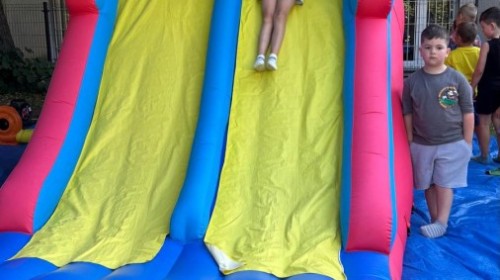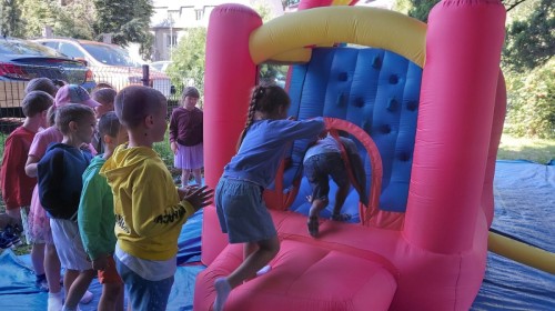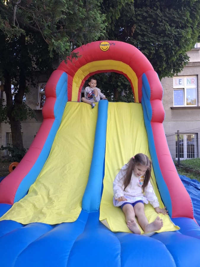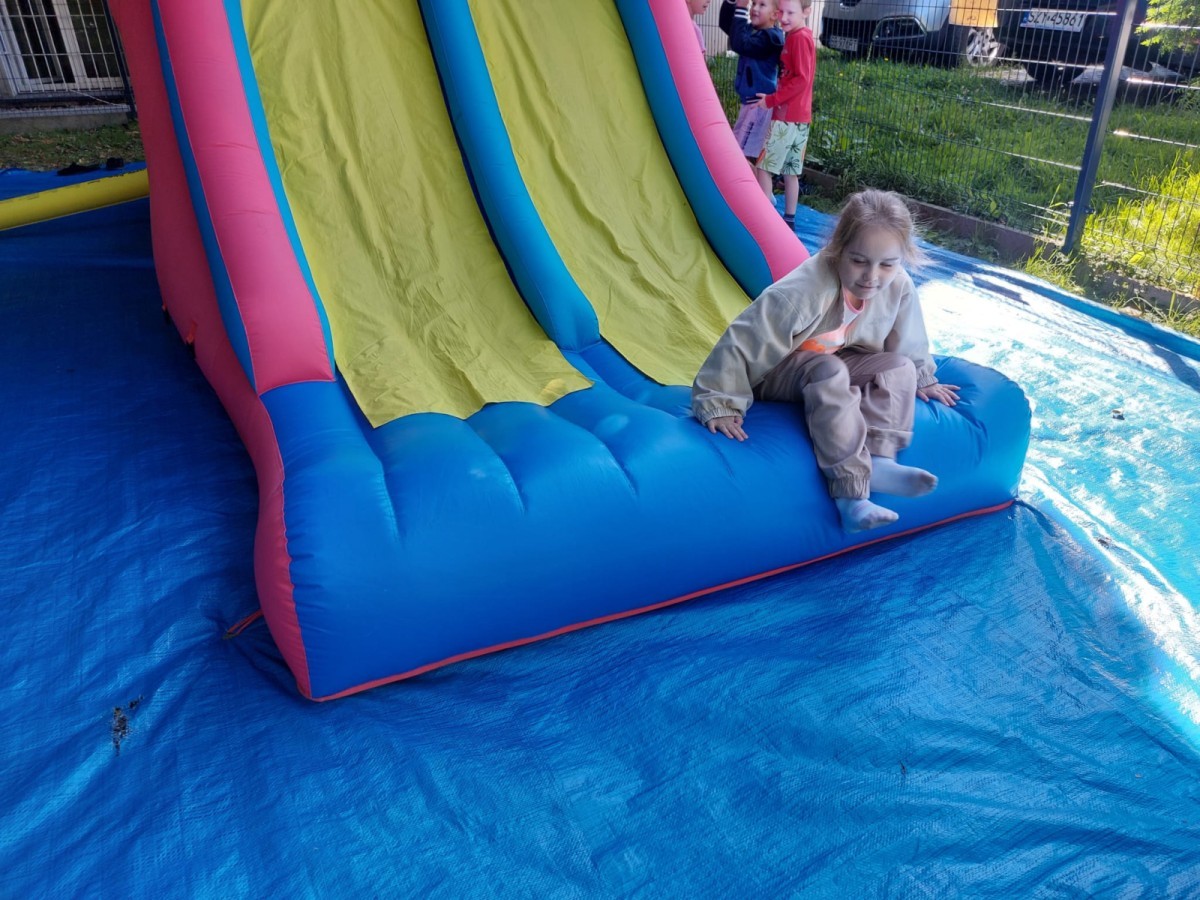 Dzieci w przedszkolu radośnie bawiły się na dmuchańcu, skacząc, śmiejąc się i ścigając po kolorowych zjeżdżalniach. Z każdym skokiem ich twarze rozjaśniały się od szczerego zachwytu, a dźwięk ich radosnych okrzyków wypełniał całą przestrzeń. Wszyscy na zmianę zjeżdżali w dół. Dmuchaniec stanowił idealne miejsce do wspólnej zabawy, gdzie dzieci mogły cieszyć się ruchem i wzajemnym towarzystwem.