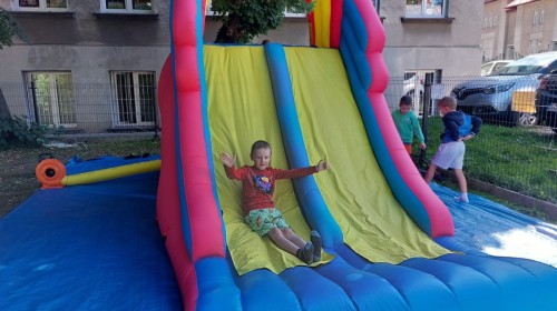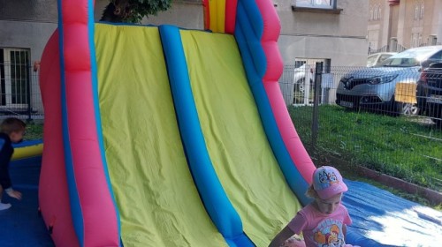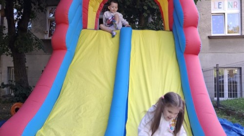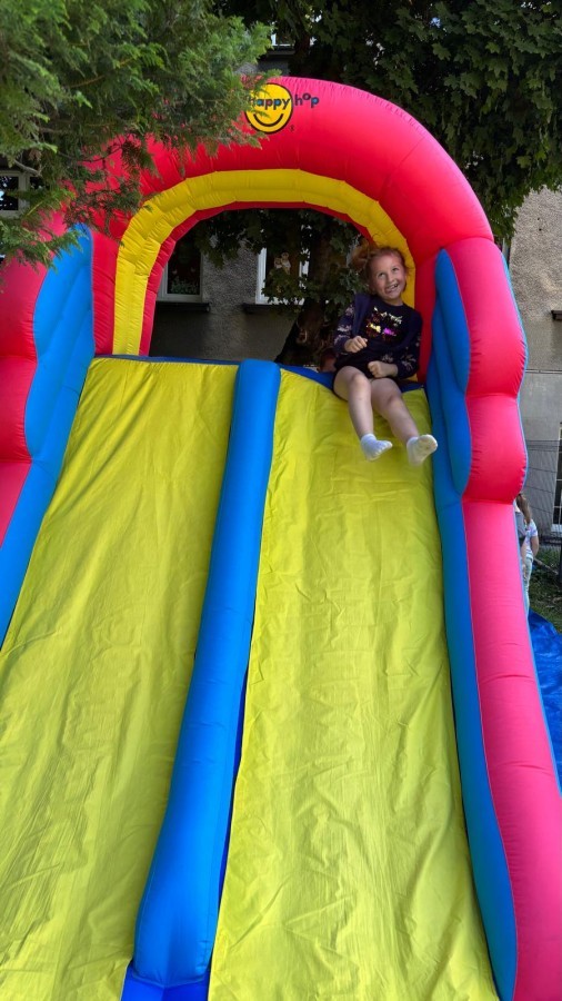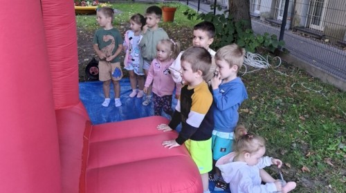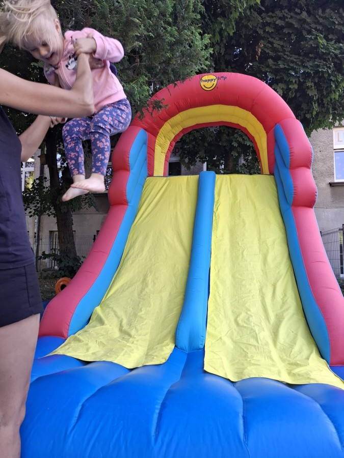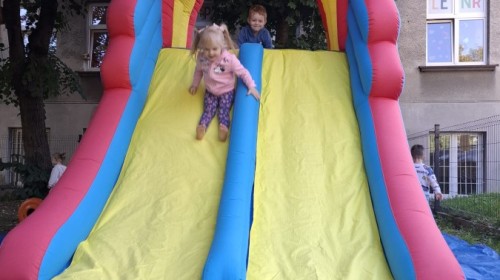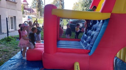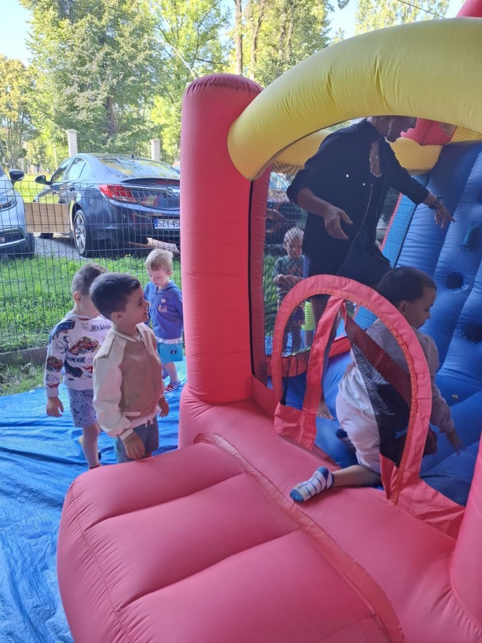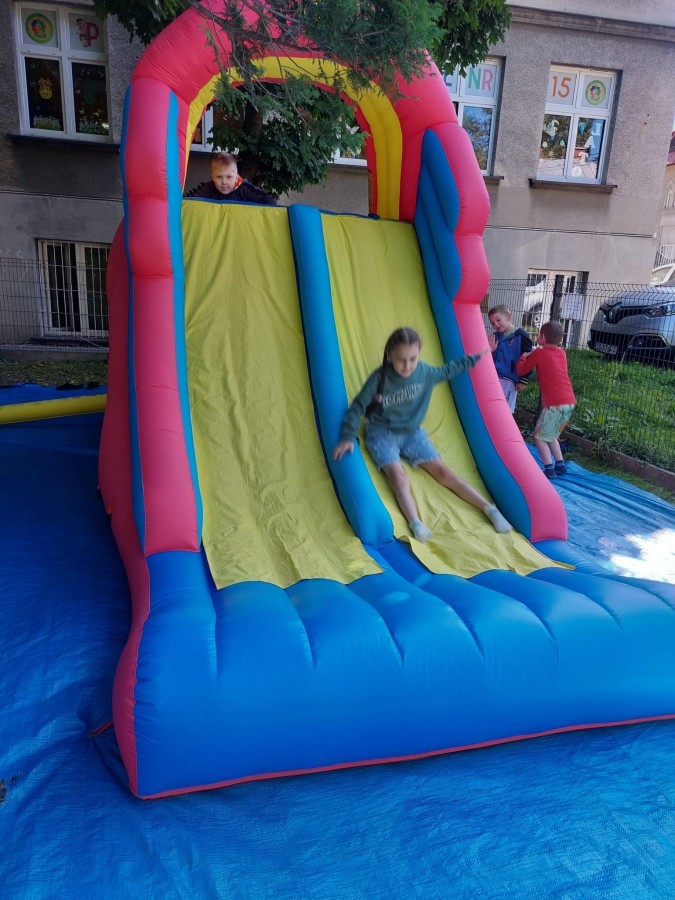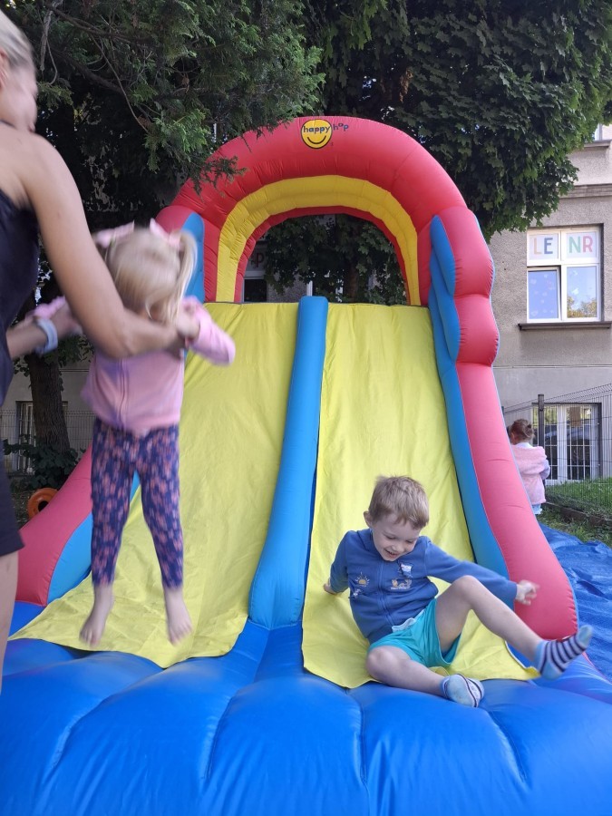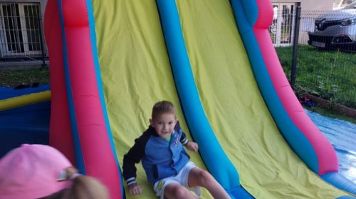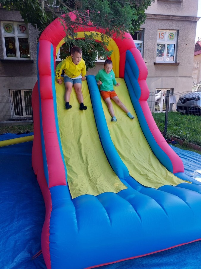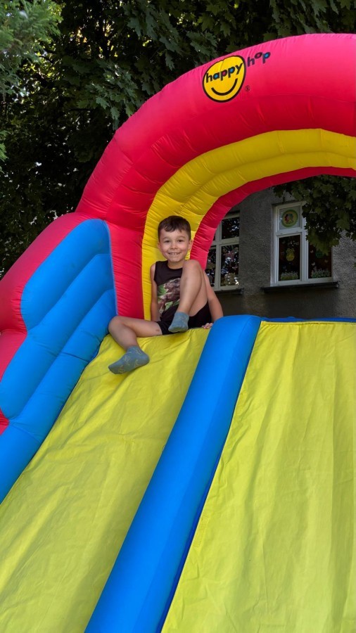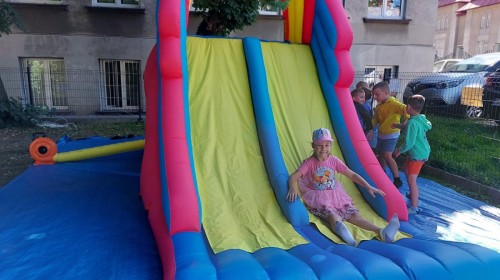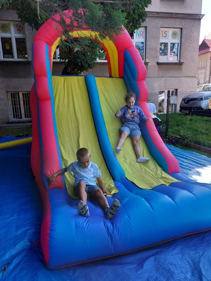 Dzieci w przedszkolu radośnie bawiły się na dmuchańcu, skacząc, śmiejąc się i ścigając po kolorowych zjeżdżalniach. Z każdym skokiem ich twarze rozjaśniały się od szczerego zachwytu, a dźwięk ich radosnych okrzyków wypełniał całą przestrzeń. Wszyscy na zmianę zjeżdżali w dół. Dmuchaniec stanowił idealne miejsce do wspólnej zabawy, gdzie dzieci mogły cieszyć się ruchem i wzajemnym towarzystwem.