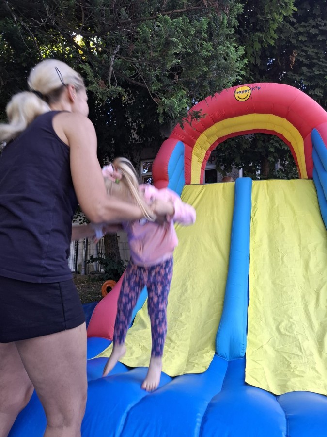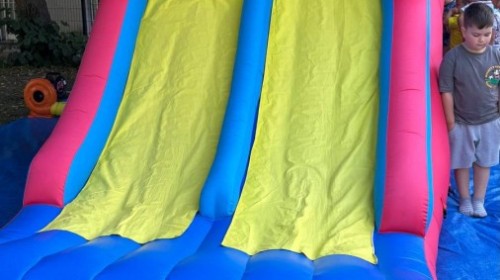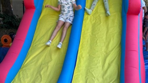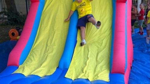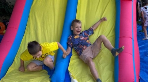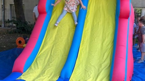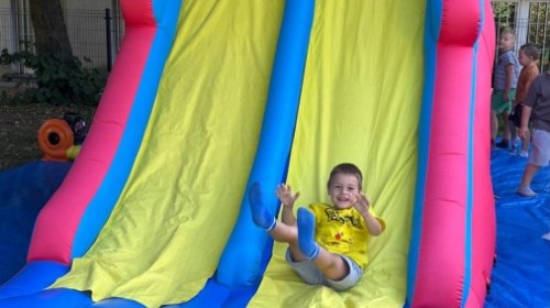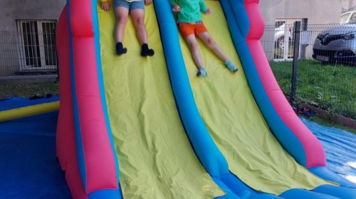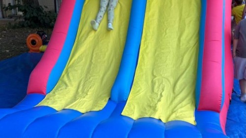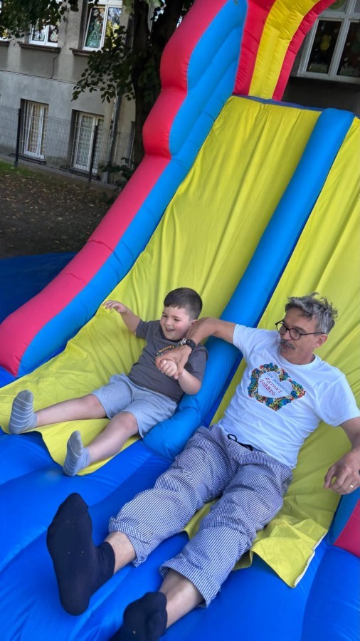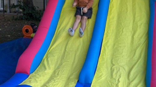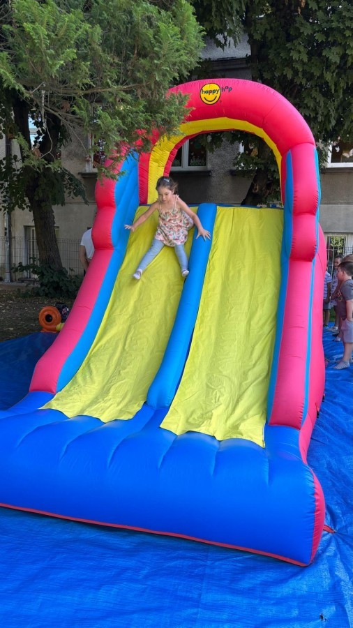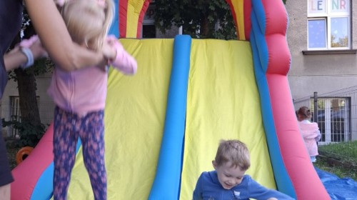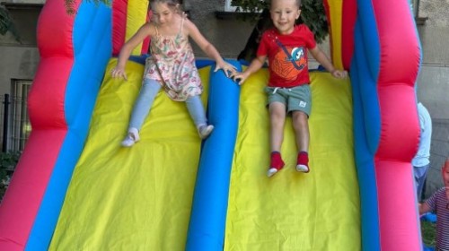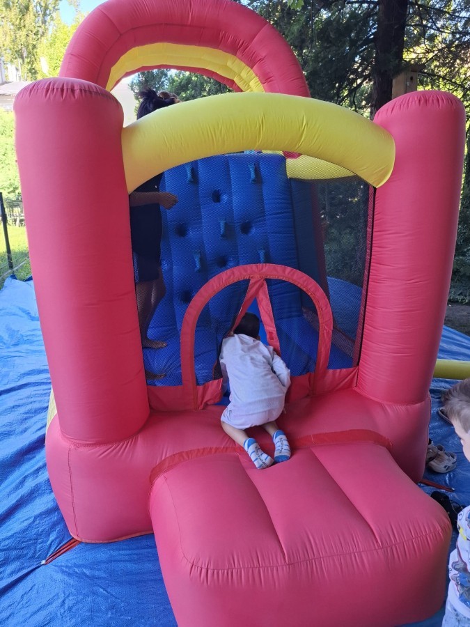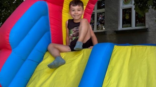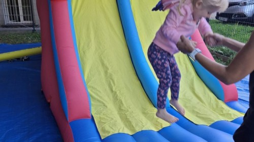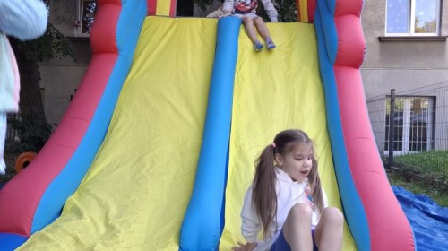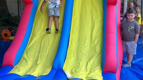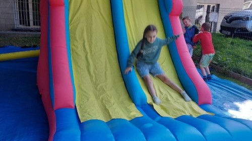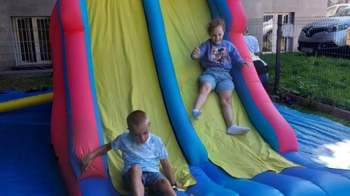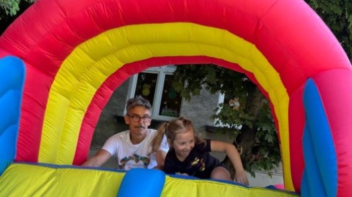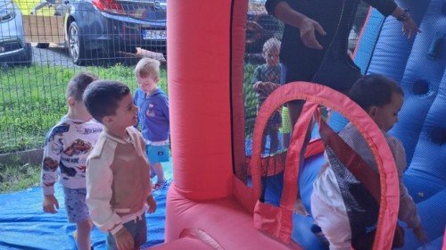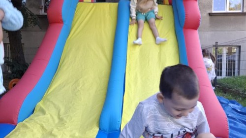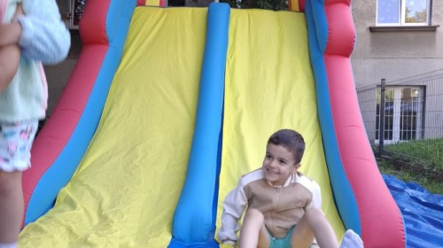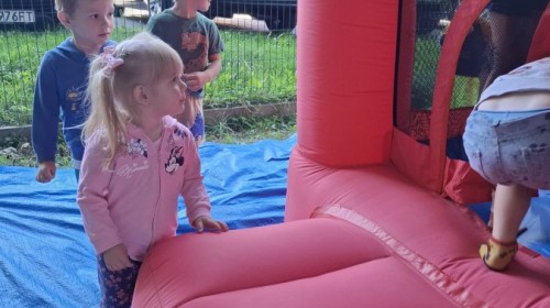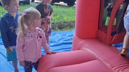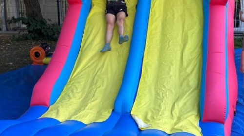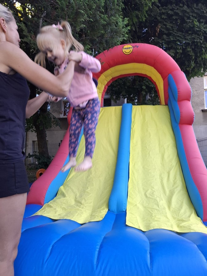 Dzieci w przedszkolu radośnie bawiły się na dmuchańcu, skacząc, śmiejąc się i ścigając po kolorowych zjeżdżalniach. Z każdym skokiem ich twarze rozjaśniały się od szczerego zachwytu, a dźwięk ich radosnych okrzyków wypełniał całą przestrzeń. Wszyscy na zmianę zjeżdżali w dół. Dmuchaniec stanowił idealne miejsce do wspólnej zabawy, gdzie dzieci mogły cieszyć się ruchem i wzajemnym towarzystwem.