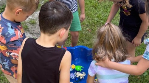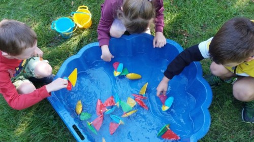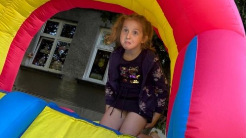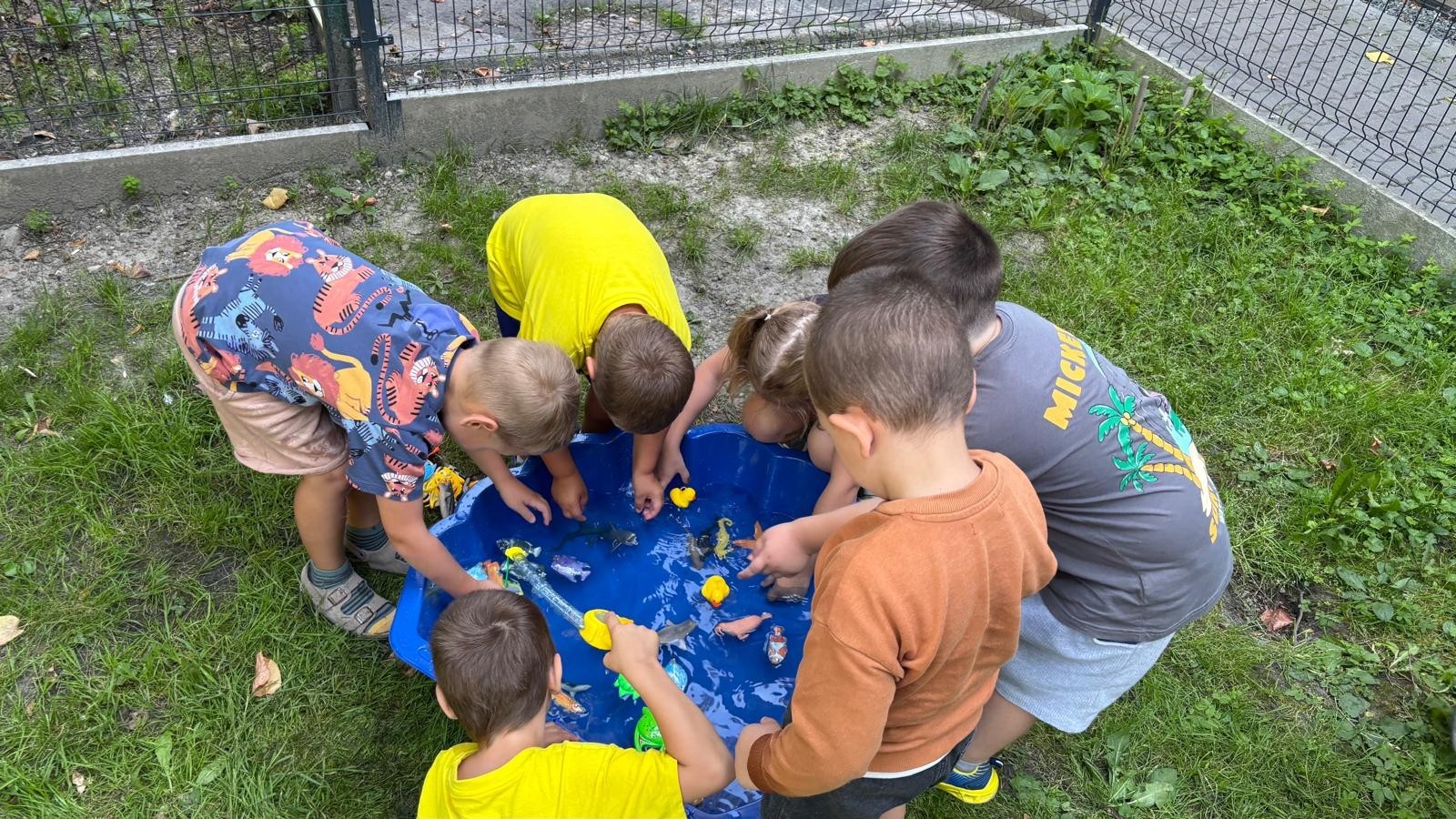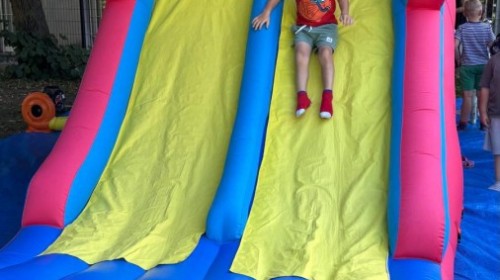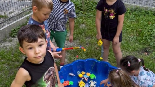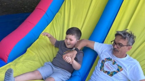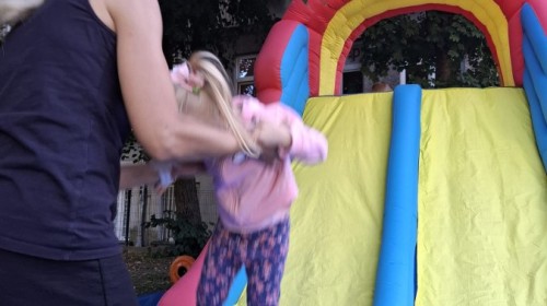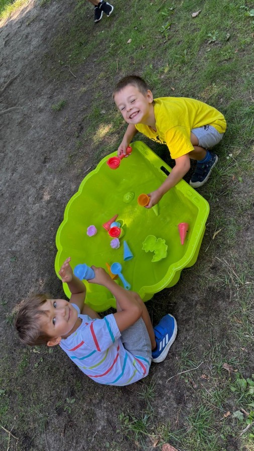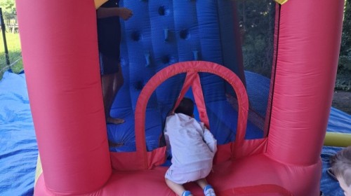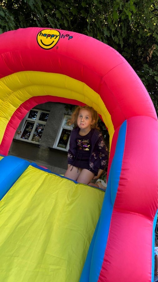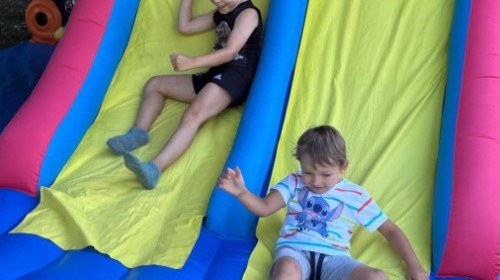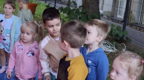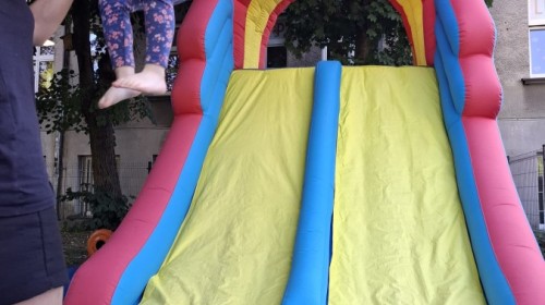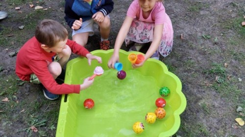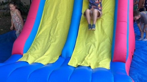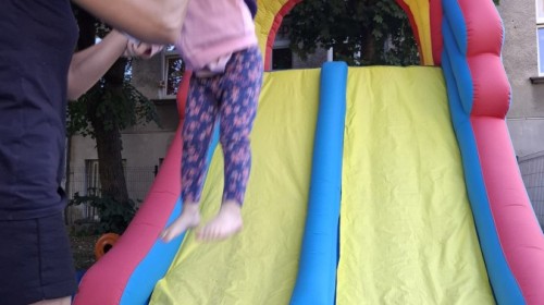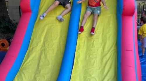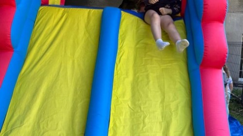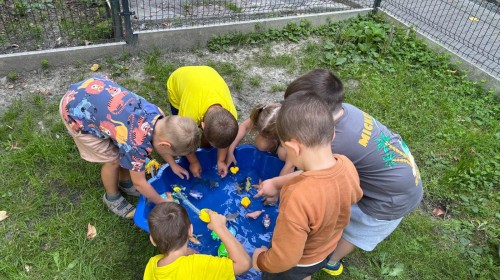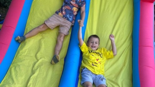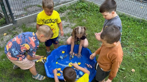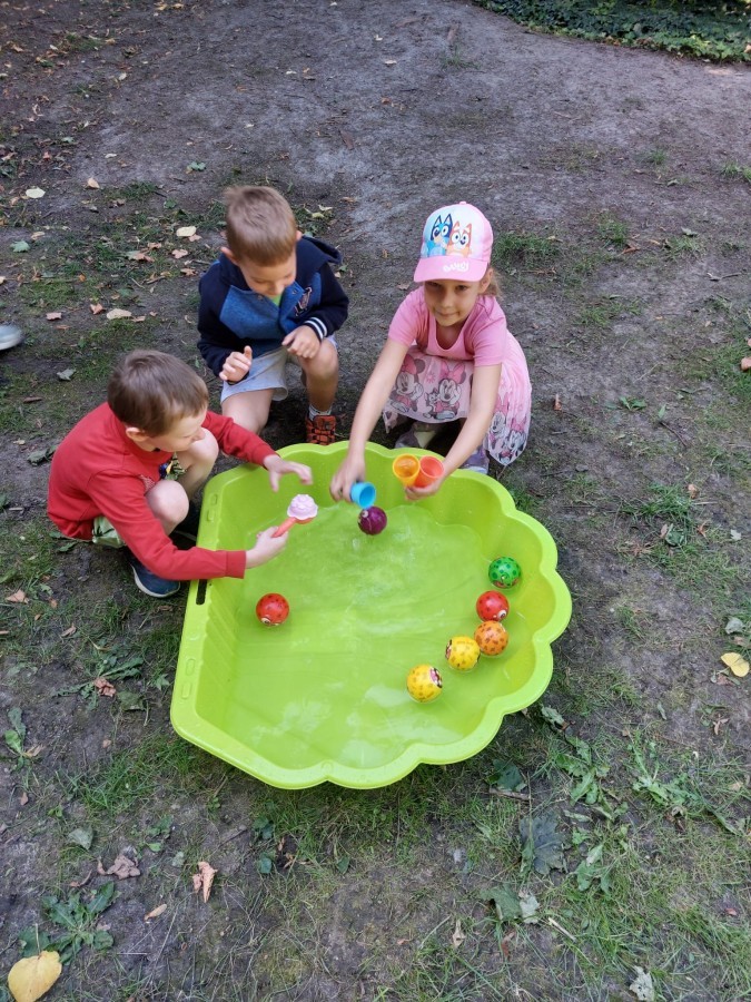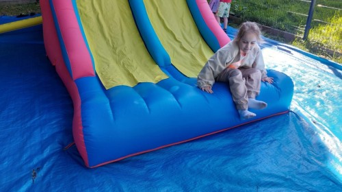 Dzieci w przedszkolu radośnie bawiły się na dmuchańcu, skacząc, śmiejąc się i ścigając po kolorowych zjeżdżalniach. Z każdym skokiem ich twarze rozjaśniały się od szczerego zachwytu, a dźwięk ich radosnych okrzyków wypełniał całą przestrzeń. Wszyscy na zmianę zjeżdżali w dół. Dmuchaniec stanowił idealne miejsce do wspólnej zabawy, gdzie dzieci mogły cieszyć się ruchem i wzajemnym towarzystwem.