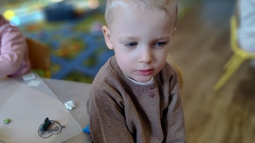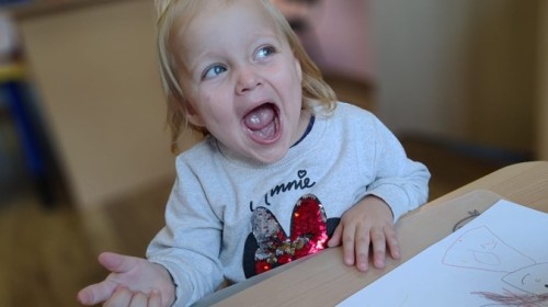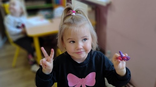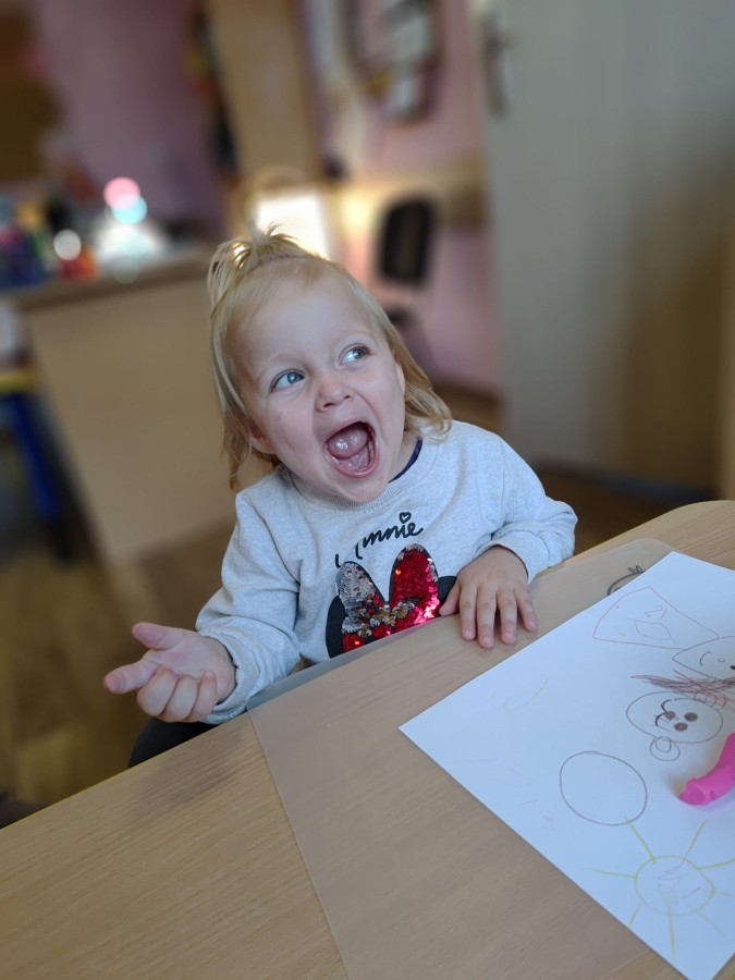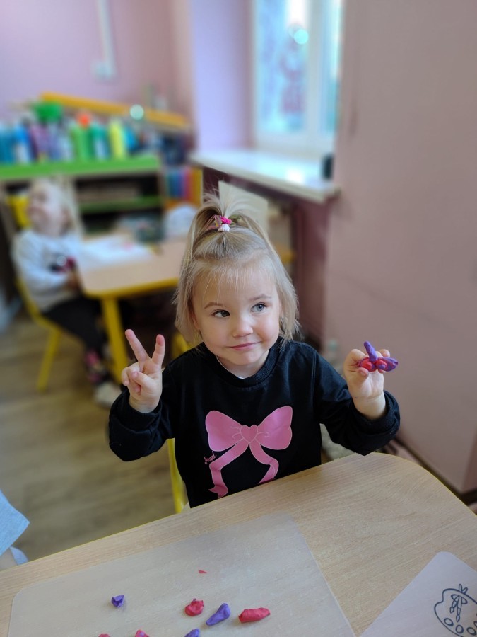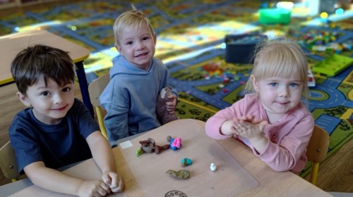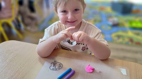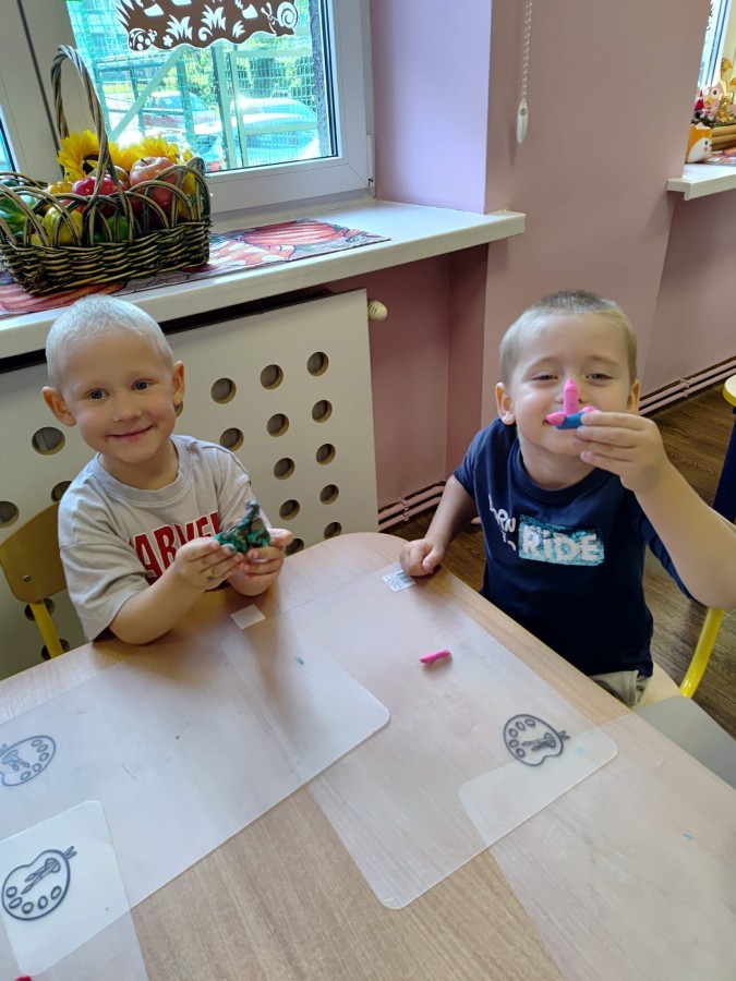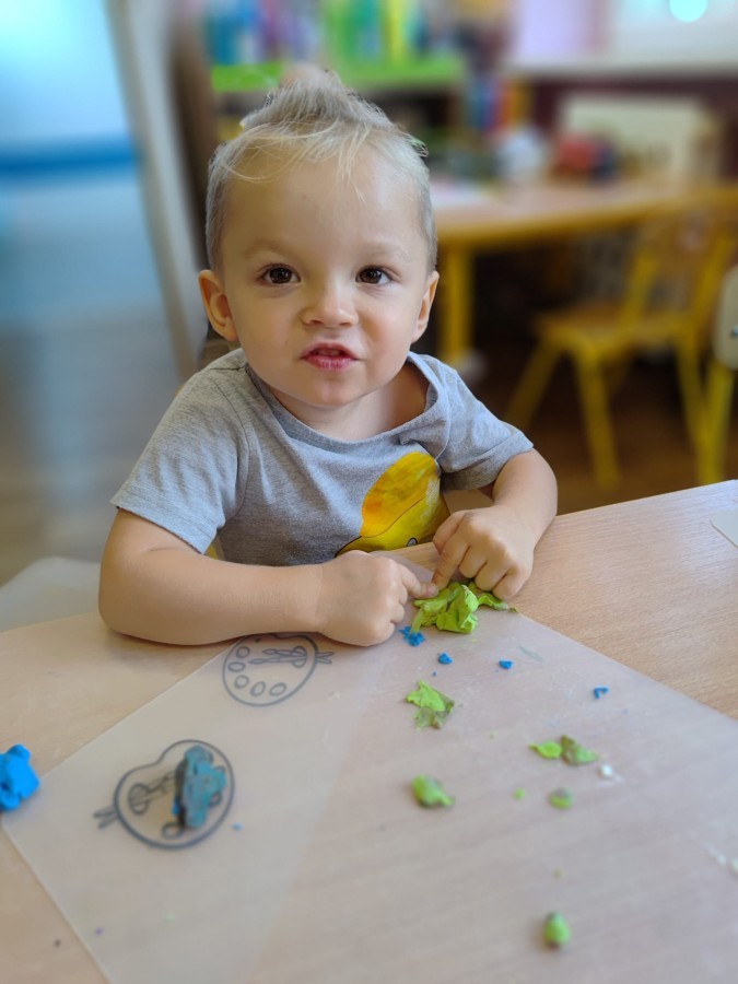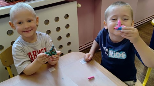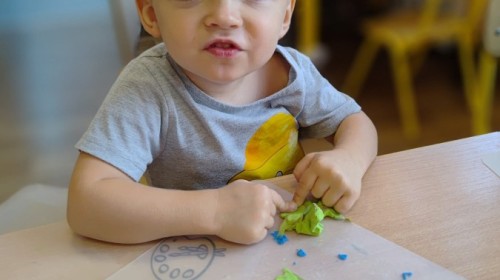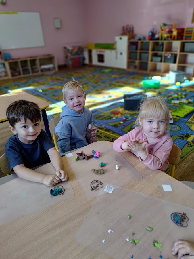 Jesienne zajecia plastyczne w grupie żabek. Praca z plasteliną to aktywność rozwijająca motorykę małą, koordynację wzrokowo-ruchową i wyobraźnię dzieci, a także wspomagająca rozwój lewej półkuli mózgu (logiczne myślenie) i prawej (kreatywność) poprzez oburęczną pracę.