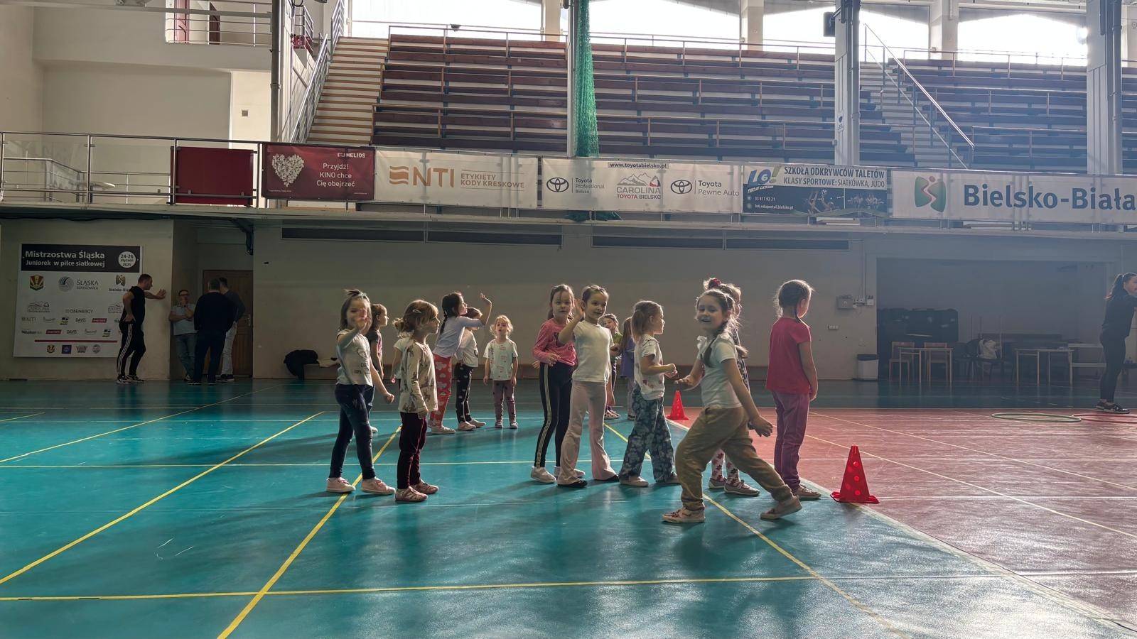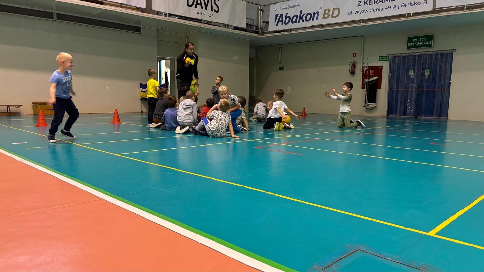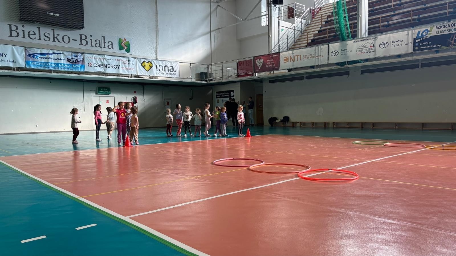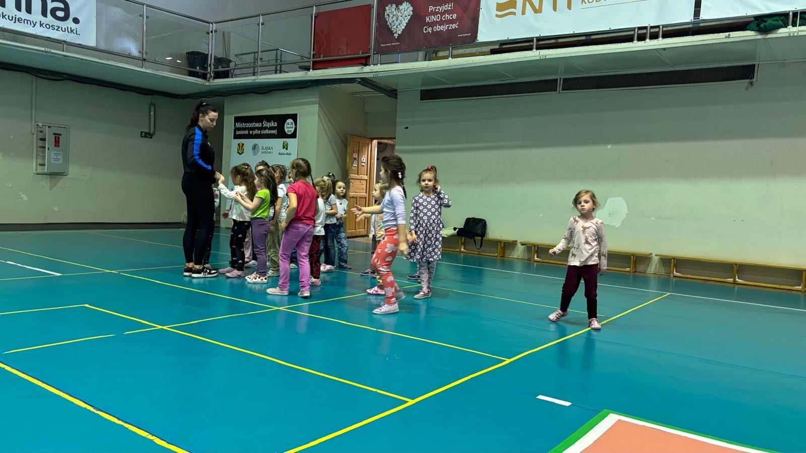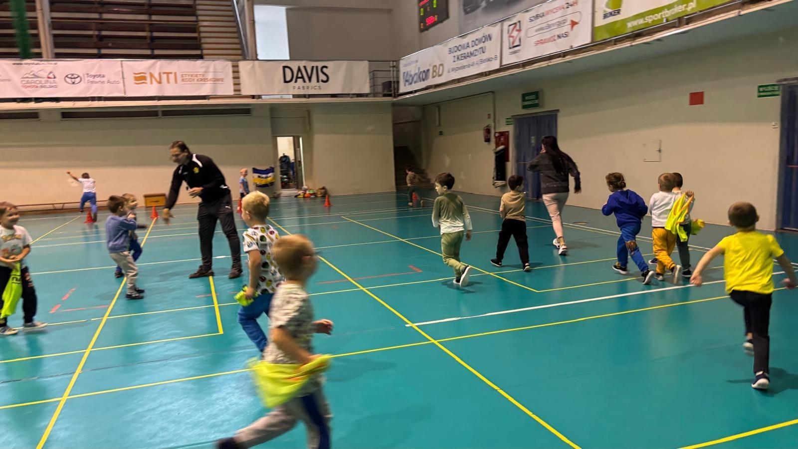 Nasze przedszkolaki wzięły udział w zajęciach sportowych z trenerem na dużej sali na stadionie. Dzieci z ogromnym zaangażowaniem uczestniczyły w różnorodnych ćwiczeniach ruchowych, grach i zabawach sportowych.