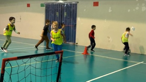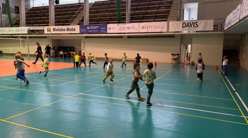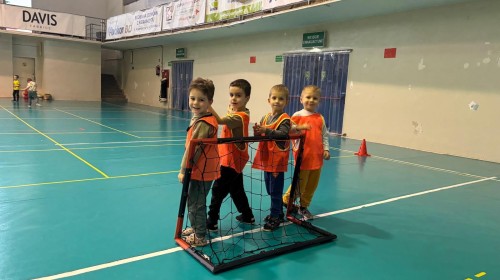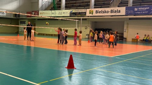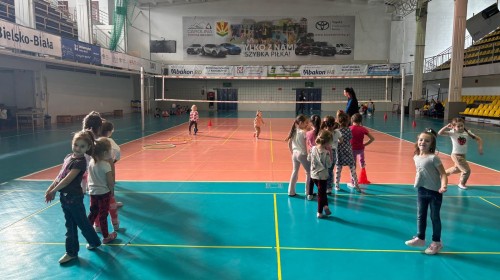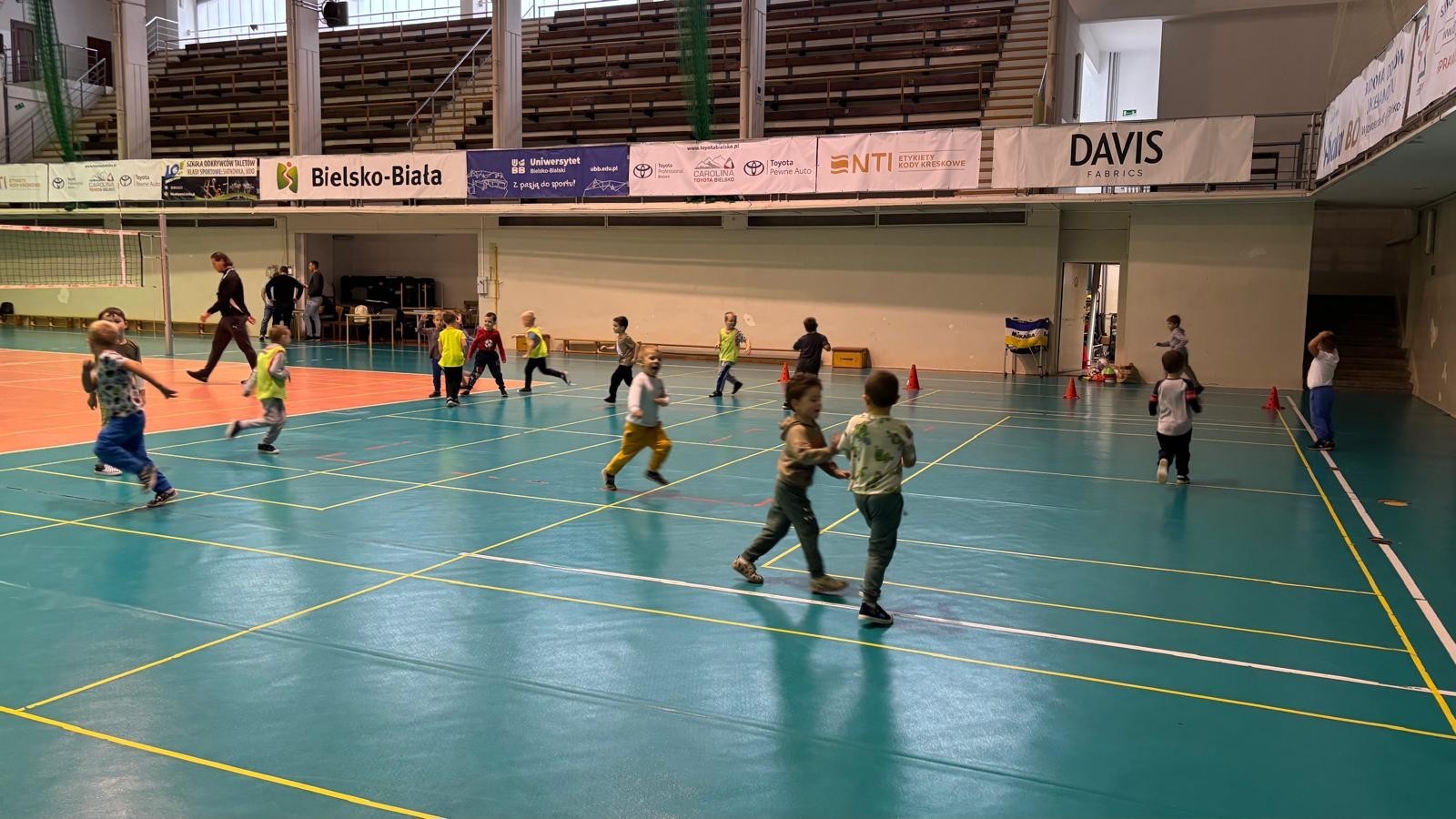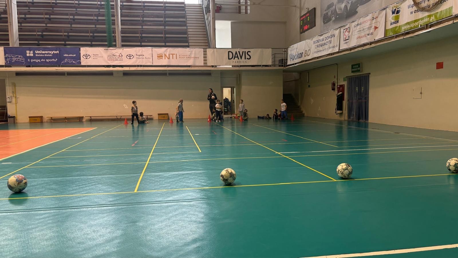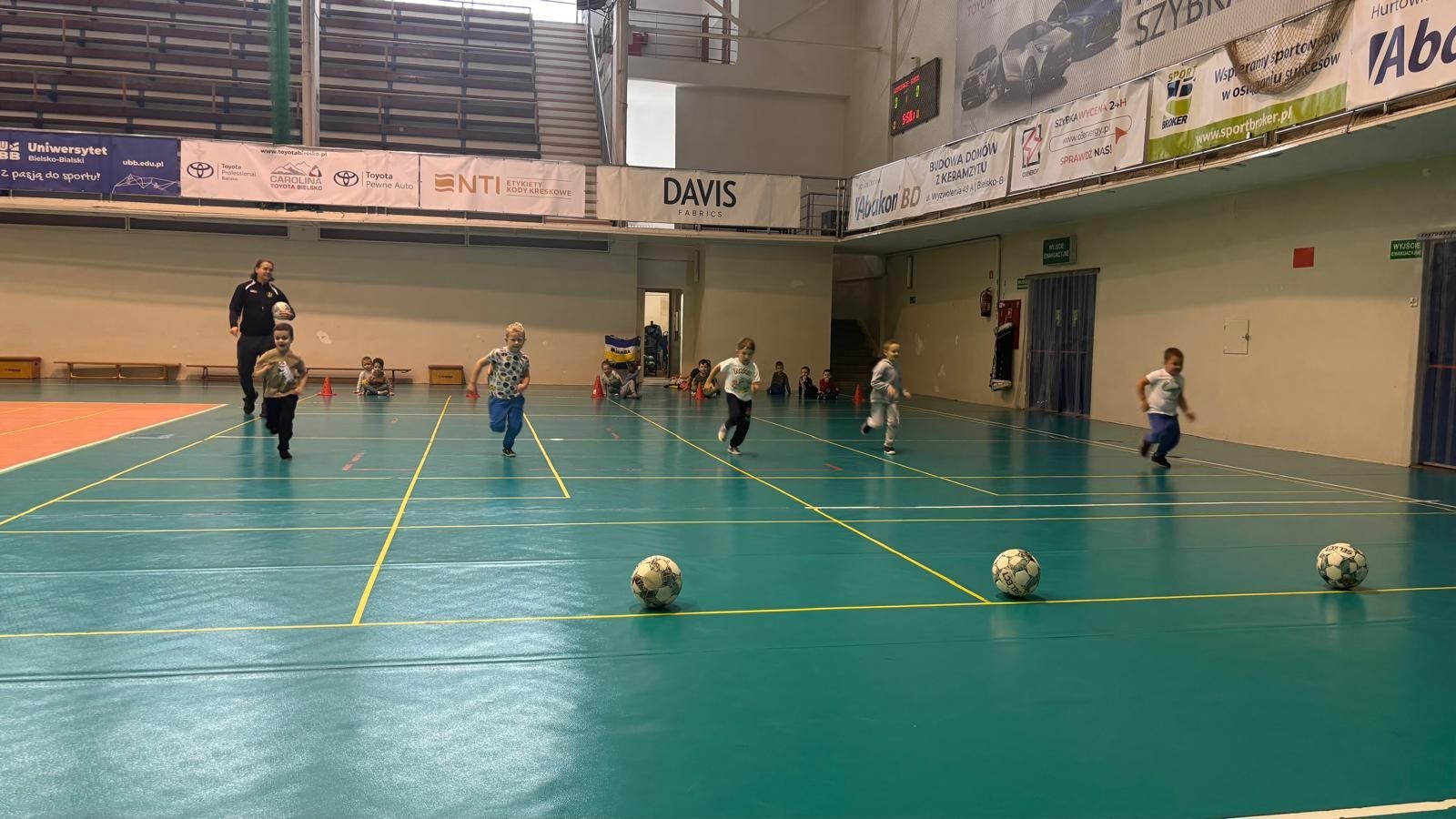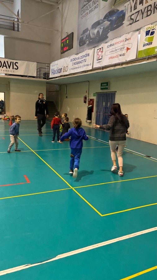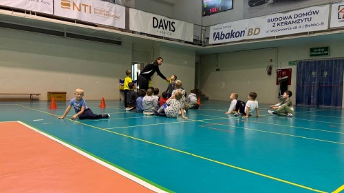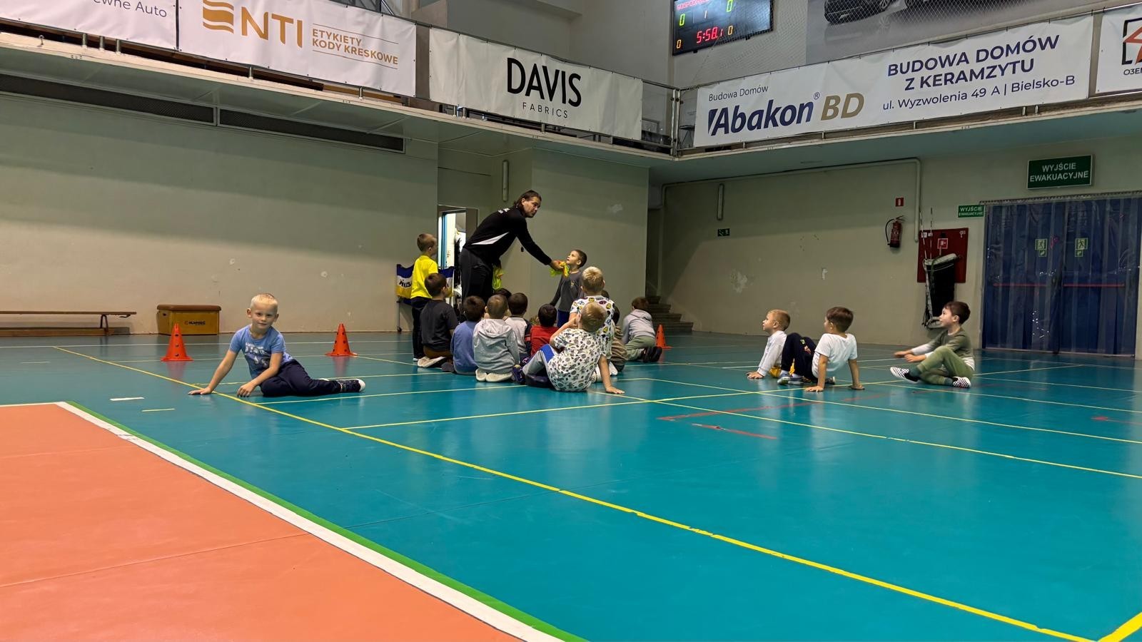 Nasze przedszkolaki wzięły udział w zajęciach sportowych z trenerem na dużej sali na stadionie. Dzieci z ogromnym zaangażowaniem uczestniczyły w różnorodnych ćwiczeniach ruchowych, grach i zabawach sportowych.
