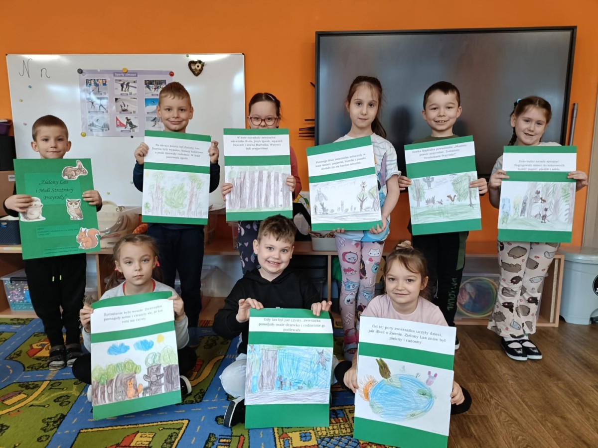 W związku z udziałem naszej grupy w konkursie "Szanuj Energię Chroń Klimat 2025-2026" nasze przedszkolaki podjęły się kolejnego twórczego zadania, którym było stworzenie ekologicznej bajki. Dzieci stały się nie tylko autorami ale i ilustratorami bajki. Wspólna praca przyczyniła się do utrwalenia wiadomości na temat ochrony przyrody i przypomnienia sobie zasad właściwej segregacji śmieci. Największą radość dla dzieci stanowiło stworzenie wspólnej książeczki i przeczytanie jej po zakończeniu wszystkich prac z nią związanych.